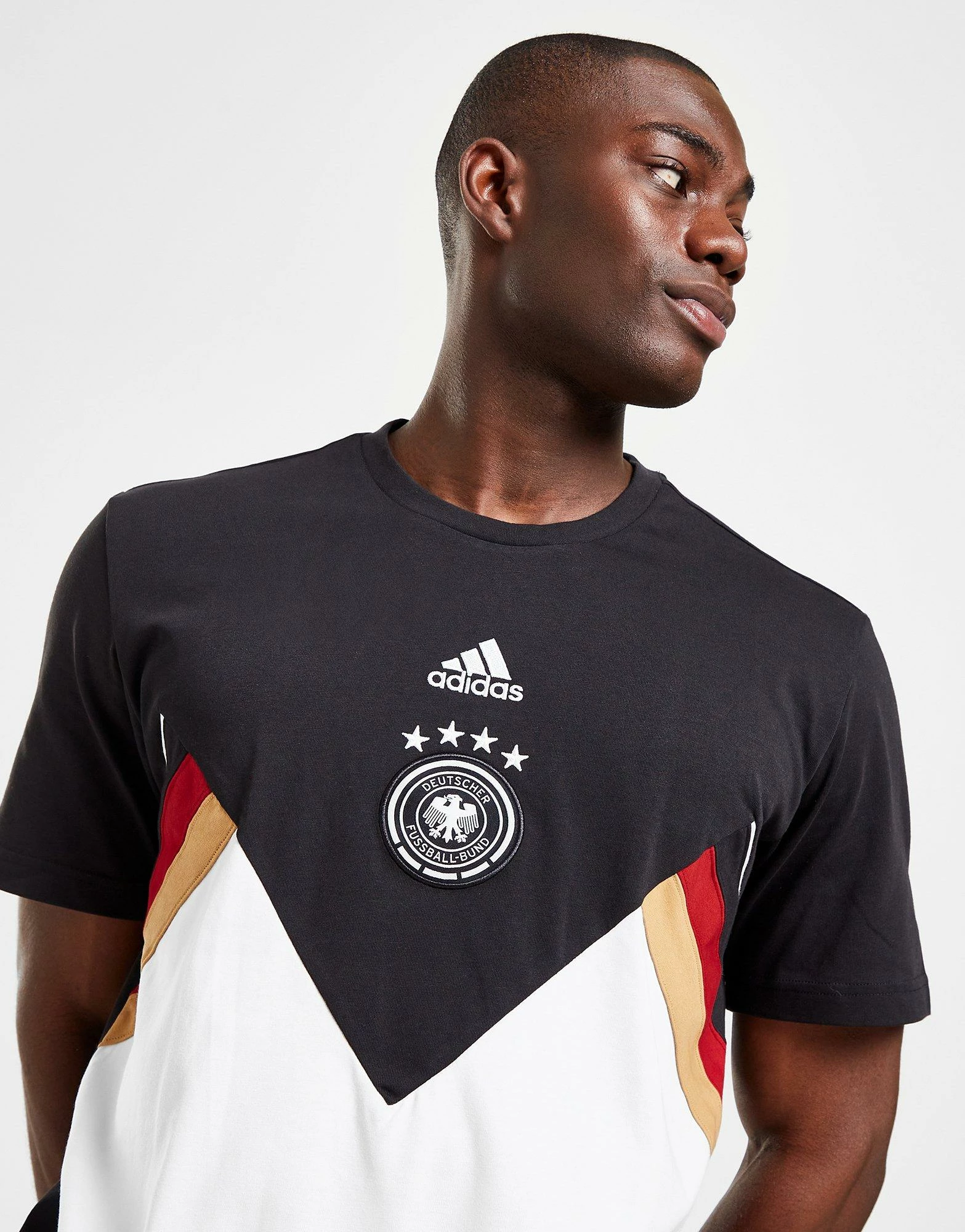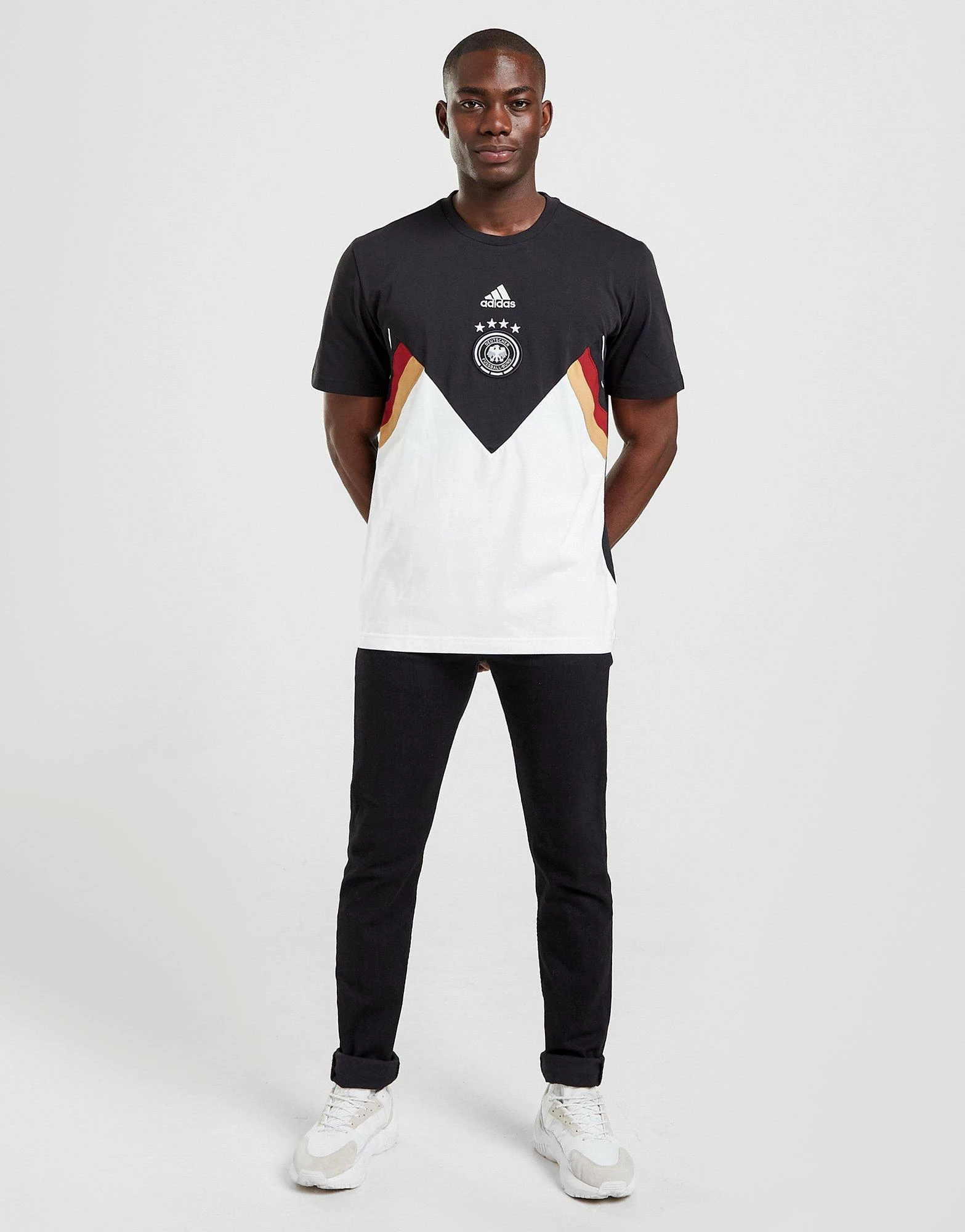 Rep your squad in this men’s Germany World Cup Icon T-Shirt from adidas. Cut from soft, heavyweight cotton for lasting comfort, this tee takes inspo from the ’90s with bold graphics and a loose fit. In a White and Black colourway with tones from the team’s national flag, it features a thick, ribbed crew neckline and short sleeves for a classic cut. Finished up with adidas’ Badge of Sport logo and Germany’s legendary crest embroidered to the chest. Machine washable.