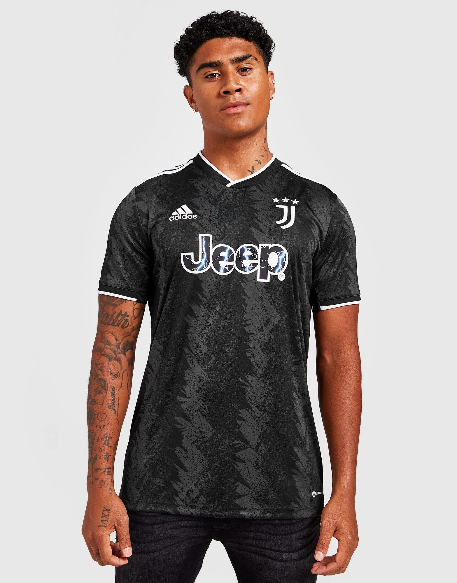 Gear up and show your support with this men’s Juventus 2022/23 Away Shirt from adidas. In a Black colourway with tonal, all-over prints, this standard-fit shirt is made from lightweight, recycled poly fabric. It has mesh panels and comes with adidas’ AEROREADY tech to wick away sweat when the game heats up. With a V-neckline and short sleeves with 3-Stripes to the shoulders, this shirt is finished up with a Badge of Sport logo and the iconic Juventus crest to the chest. Machine washable._