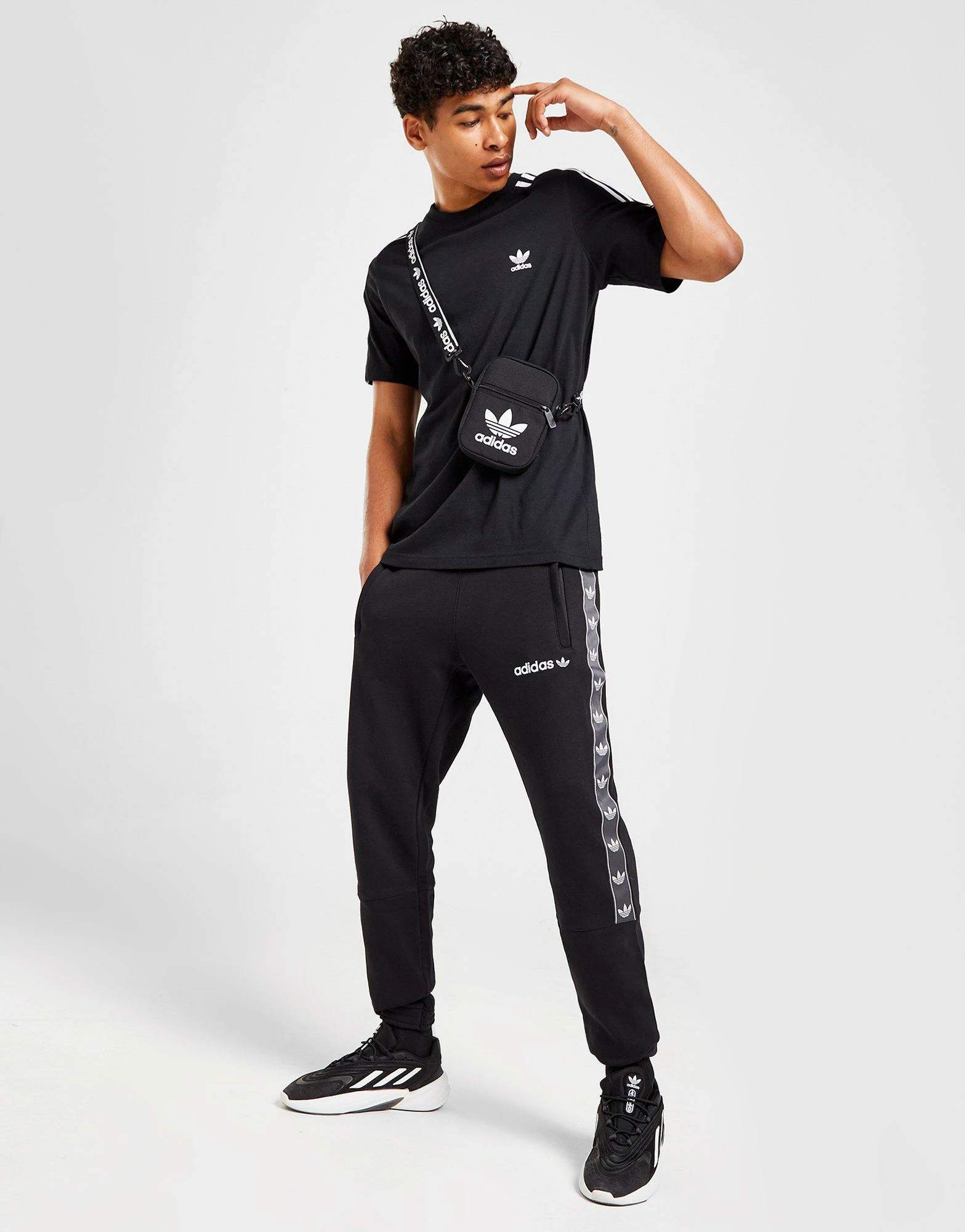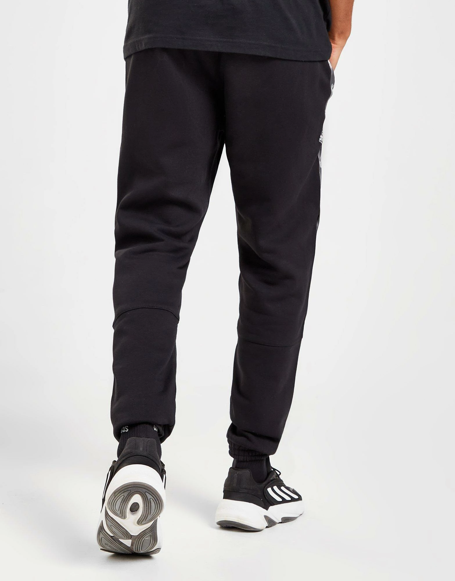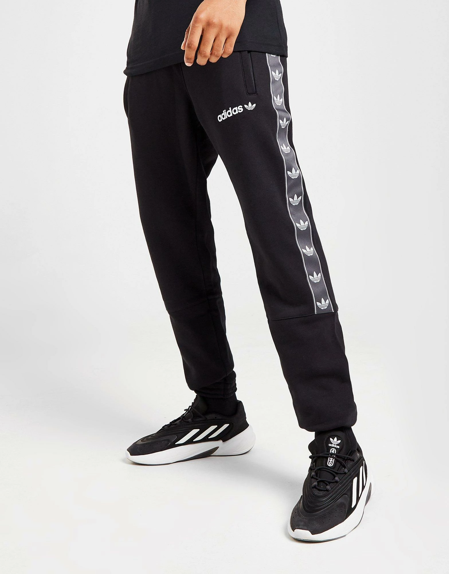 Keep it chilled with these men’s Tape Joggers from adidas Originals. Exclusive, these standard-fit sweats are made with a soft blend of cotton and recycled poly fleece for essential comfort. In a Black colourway, they feature an elasticated waistband with a drawcord to adjust the fit, and cuffed ankles to secure the shape. They have side pockets for easy storage, and are finished up with branded taping down the sides. Signed off with the iconic adidas Trefoil logo at the thigh. Machine washable. | Our model is 6’2″ and wears a size medium.