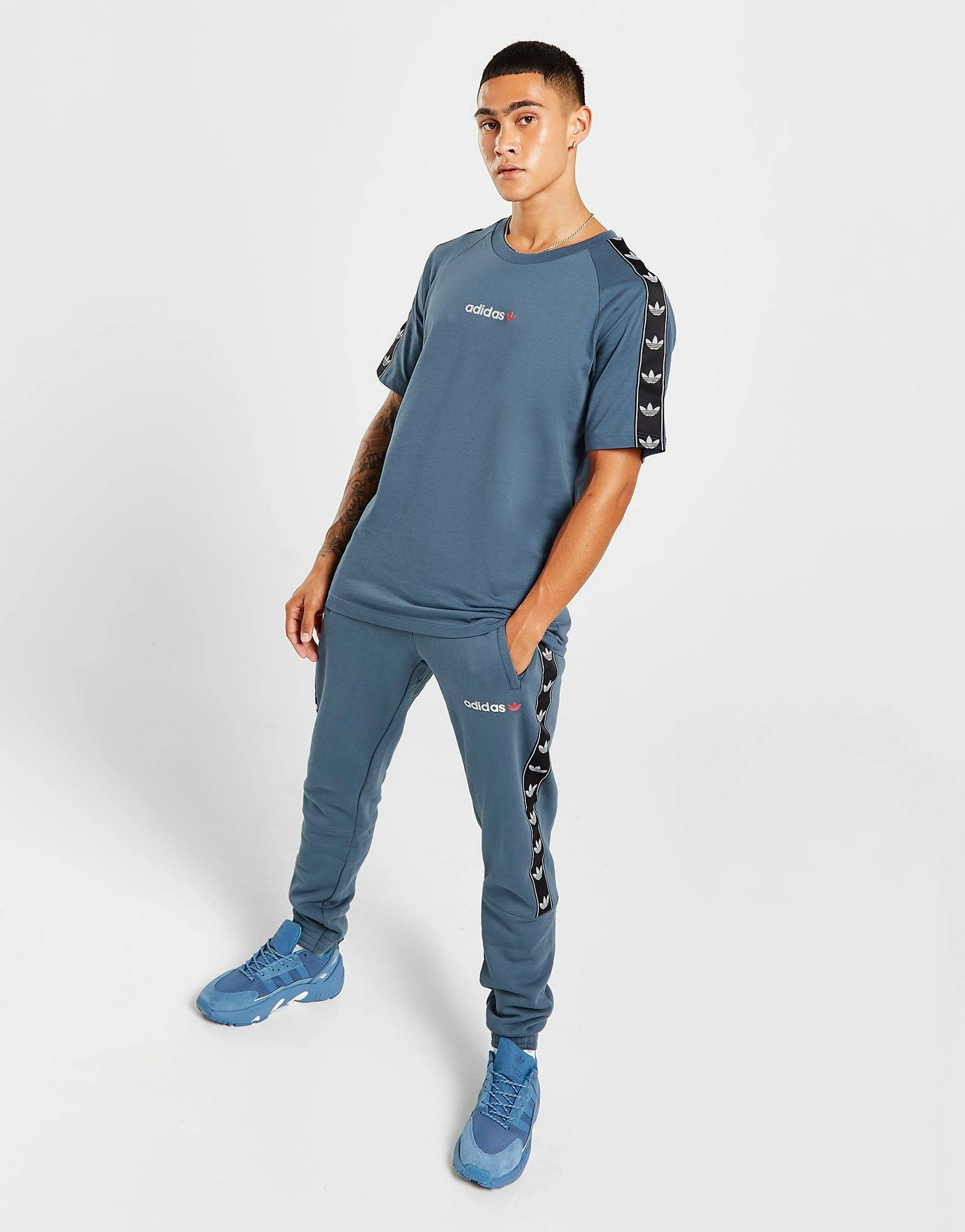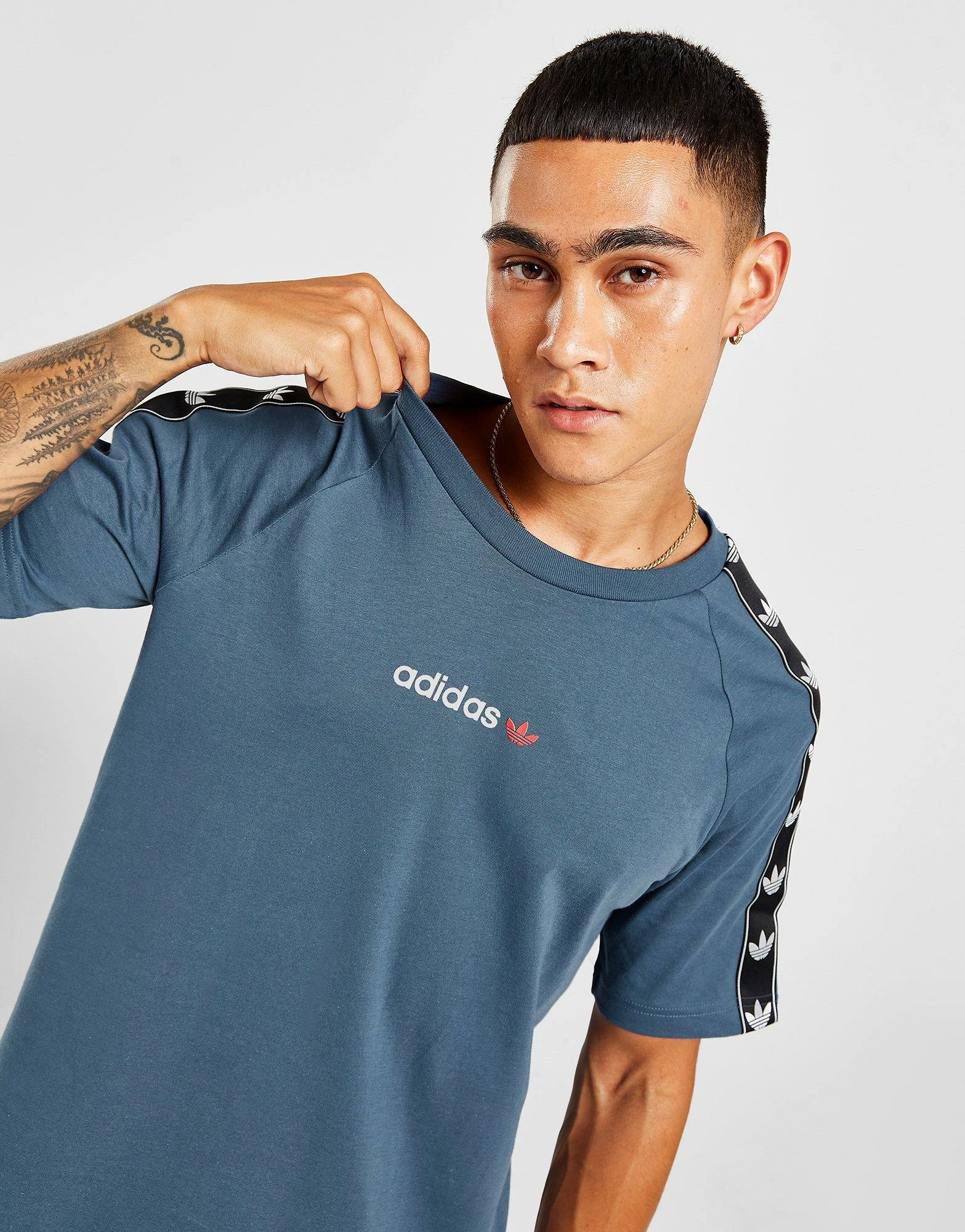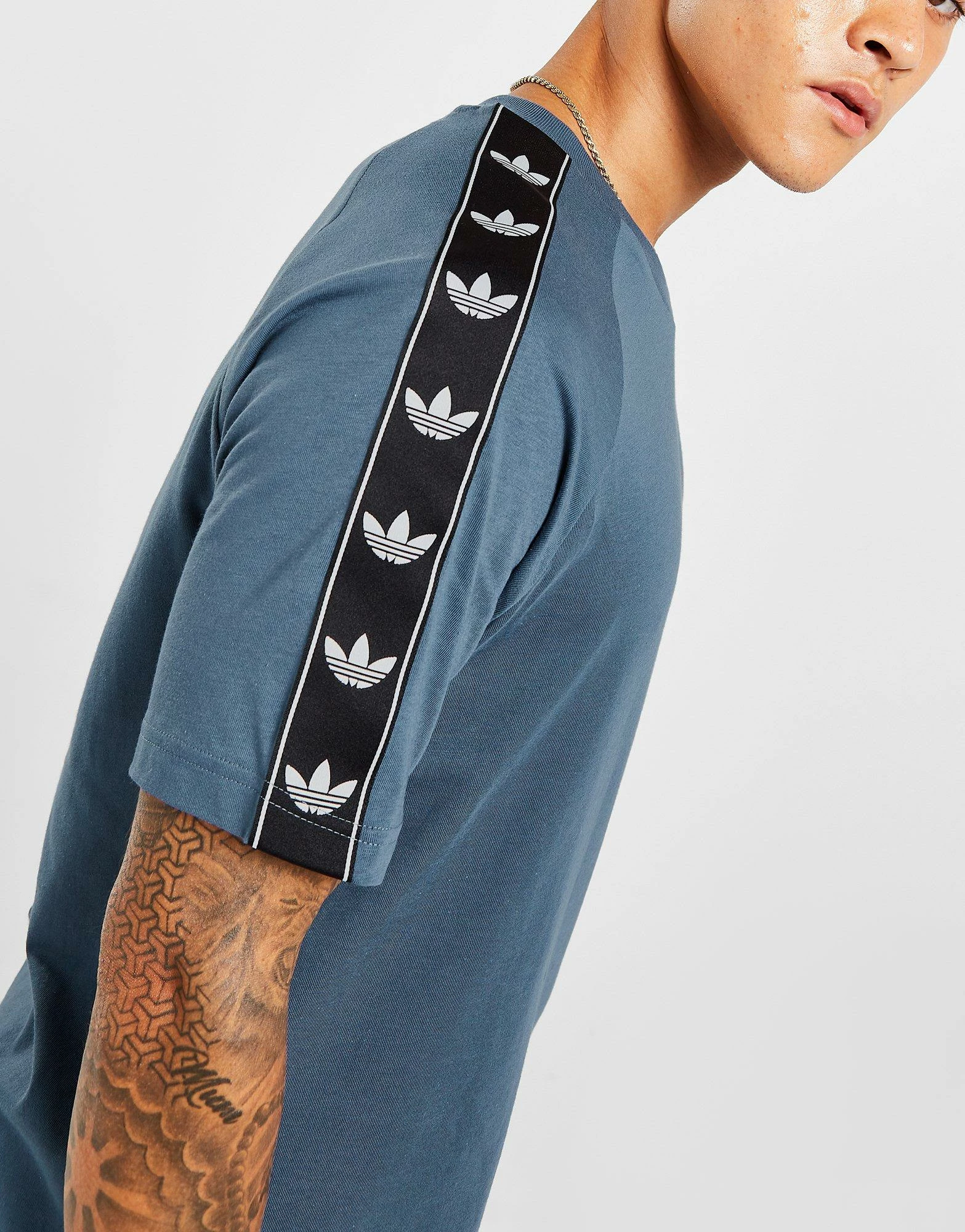 Update your everyday style with this men’s Tape T-Shirt from adidas Originals. In a Wonder Steel colourway, this exclusive top is made from soft cotton fabric for lightweight yet durable comfort. It features a ribbed crew neckline, short raglan sleeves and taped Trefoil logos to the shoulders. Finished off with signature adidas branding to the chest. Machine washable. | Our model is 6’0″ with a 40″ chest and wears a size medium.