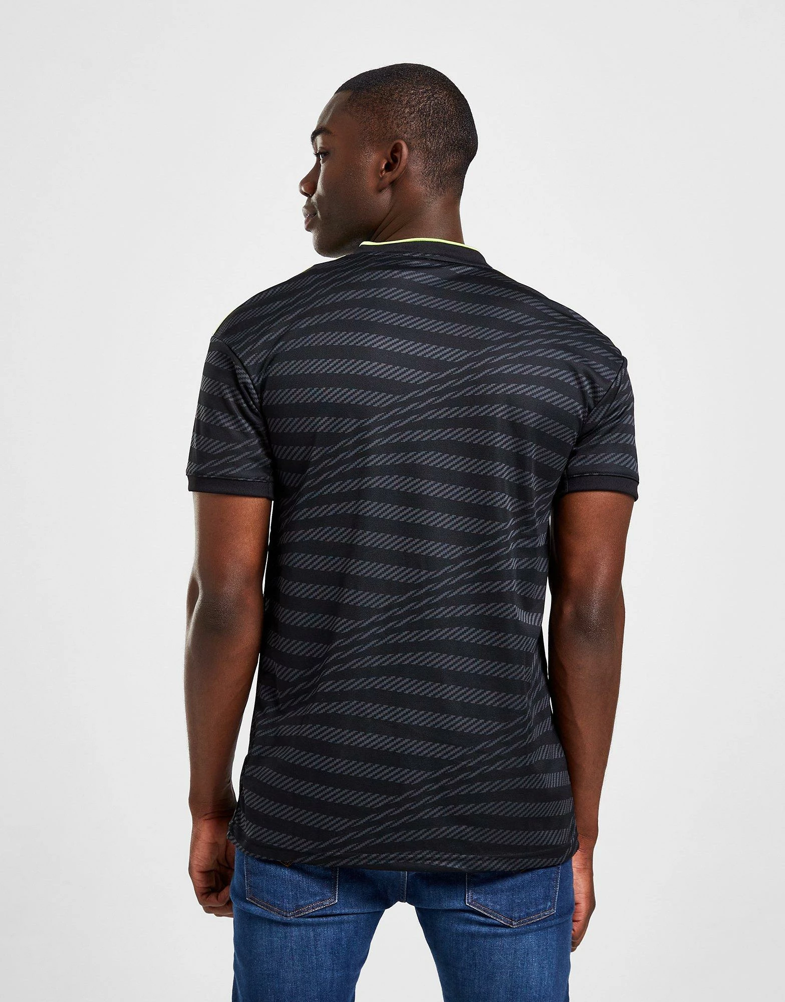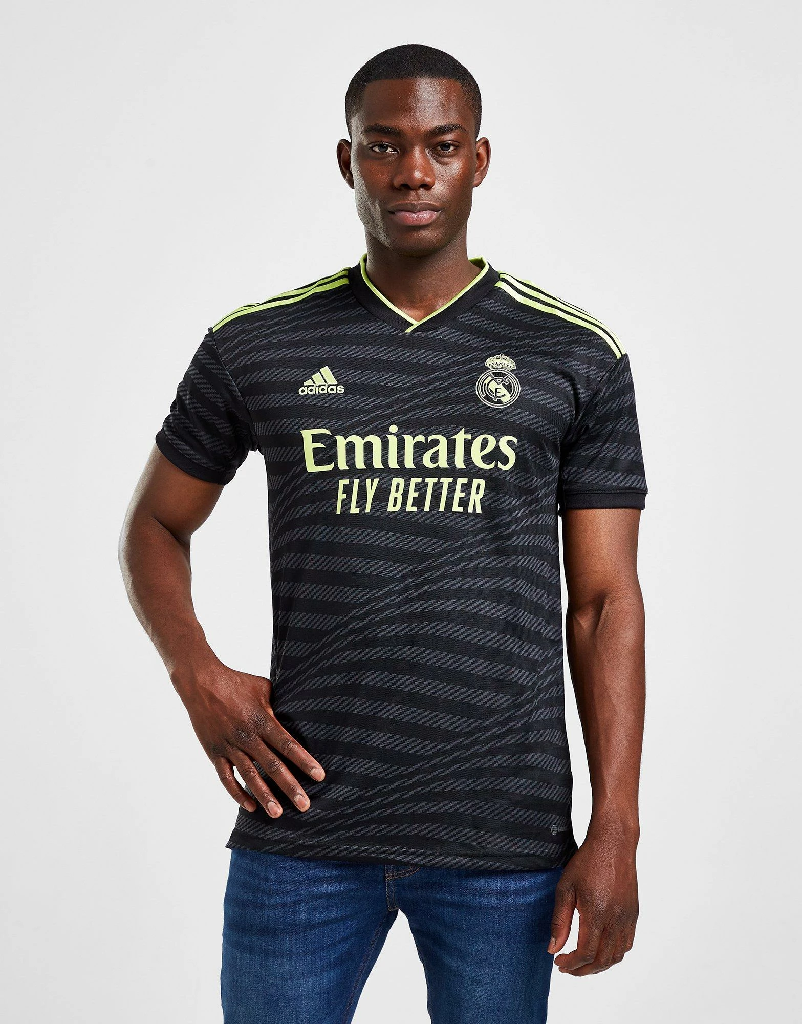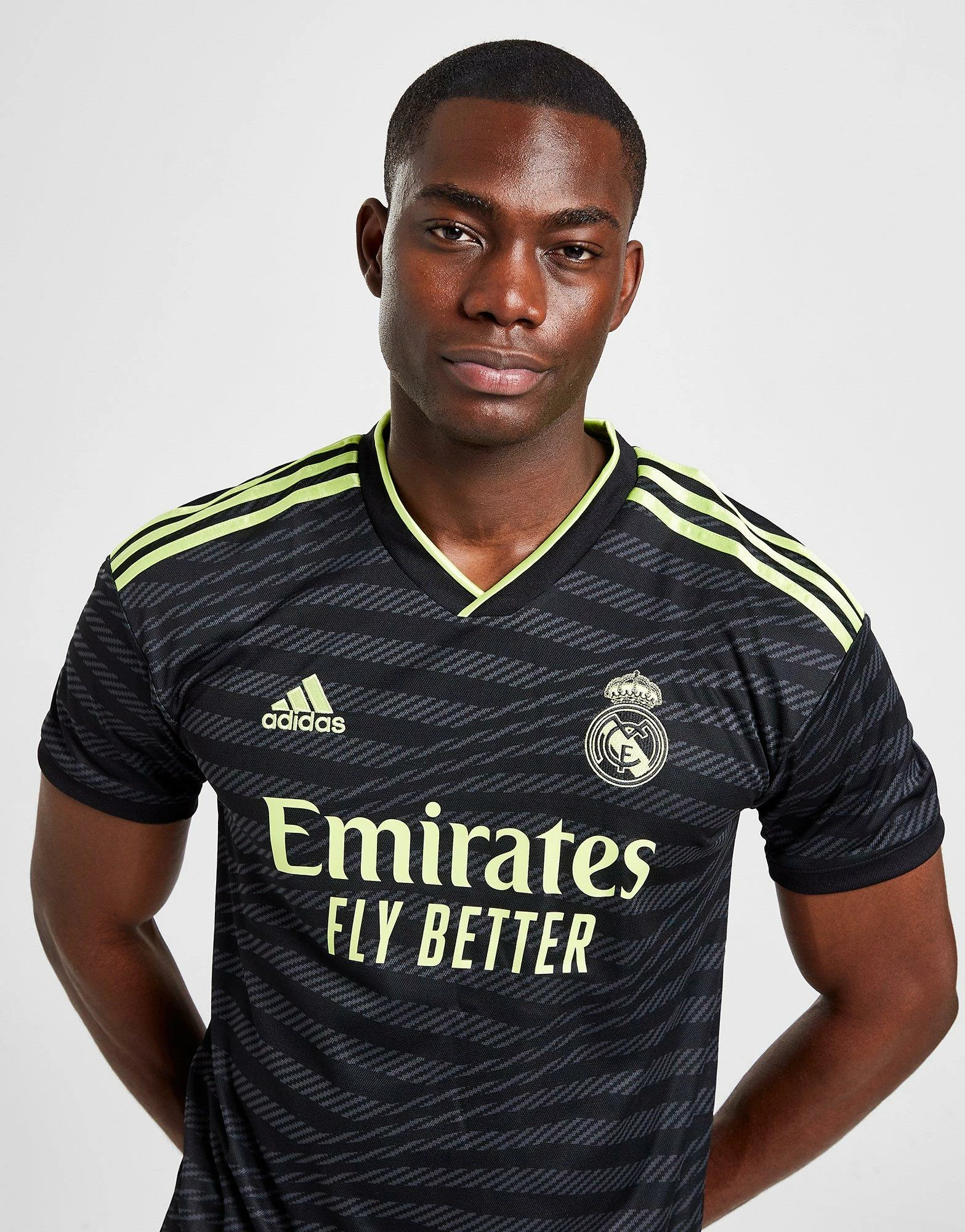Rep your side through the season in this men’s Real Madrid 2022/23 Third Shirt from adidas. In a Black colourway, this shirt is cut from ultra-smooth, durable recycled poly with a lightweight feel for lasting comfort. Inspired by what the pros wear, it’s built with sweat-wicking AEROREADY tech with mesh inserts at the underarms for breathable wear. Featuring a ribbed V-neckline and short sleeves for a game-ready look, it’s finished up with signature adidas branding and Real Madrid’s legendary crest at the chest. Machine washable. | Our model is 6’1″ with a 38″ chest and wears a size medium.