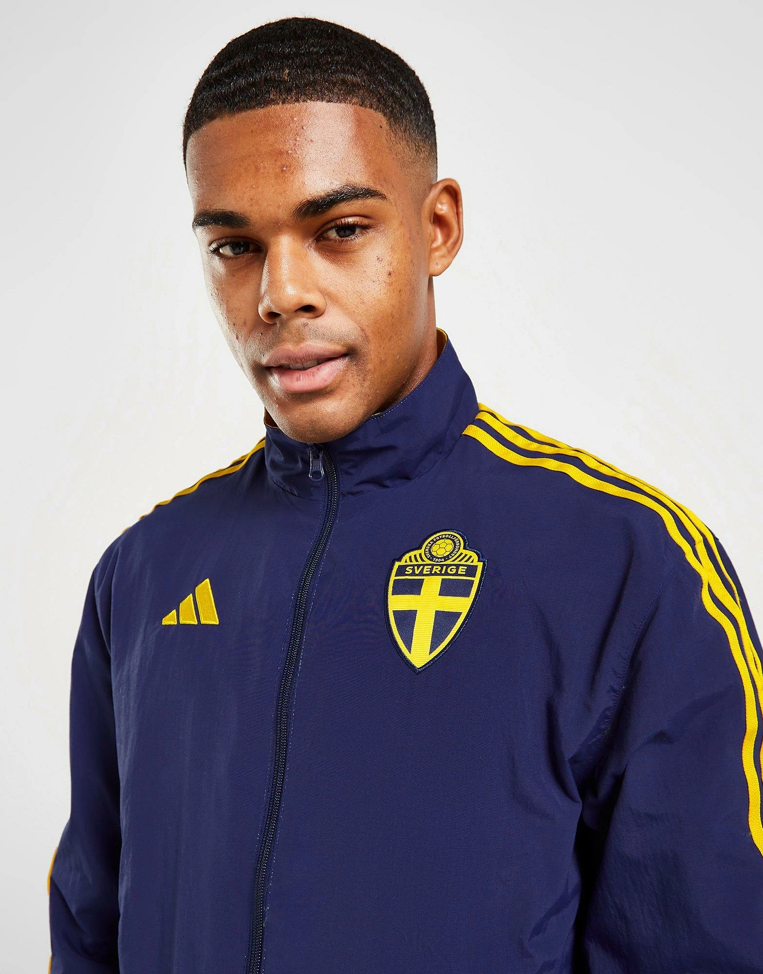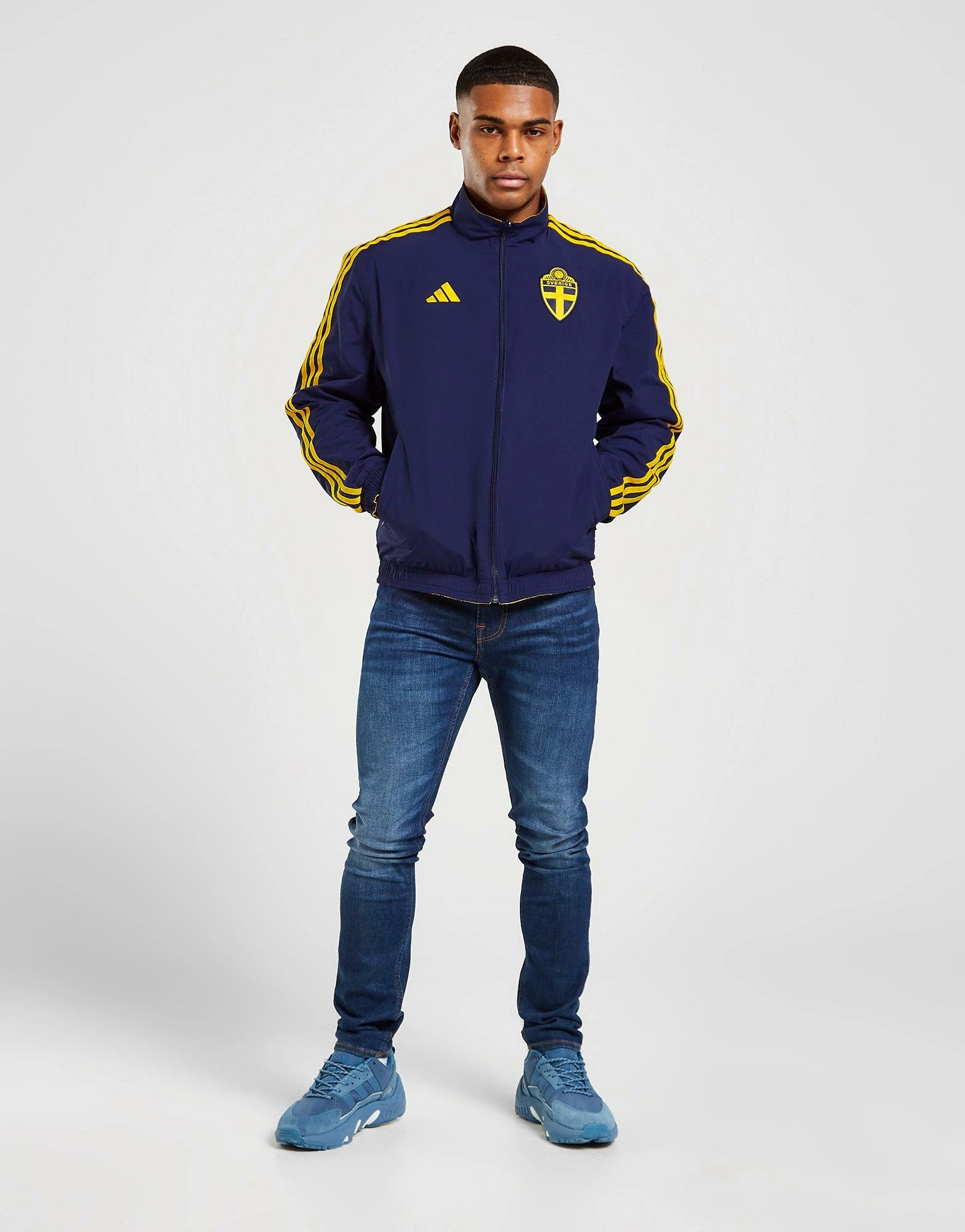 Switch up your match day look with this men’s Sweden Anthem Jacket from adidas. In a Team Navy Blue and EQT Yellow colourway, this reversible jacket is made from recycled polyamide and recycled poly fabric for smooth, all-day comfort. It features a full zip fastening and stand-up collar for custom coverage, while zippered side pockets provides space for your essentials. This jacket is finished off with contrasting adidas branding to the shoulders and the iconic Sweden badge to the chest. Machine washable. | Our model is 6’0″ with a 38.5″ chest and wears a size medium.