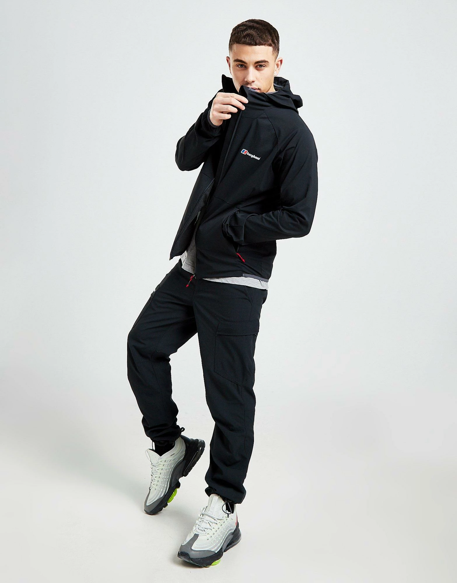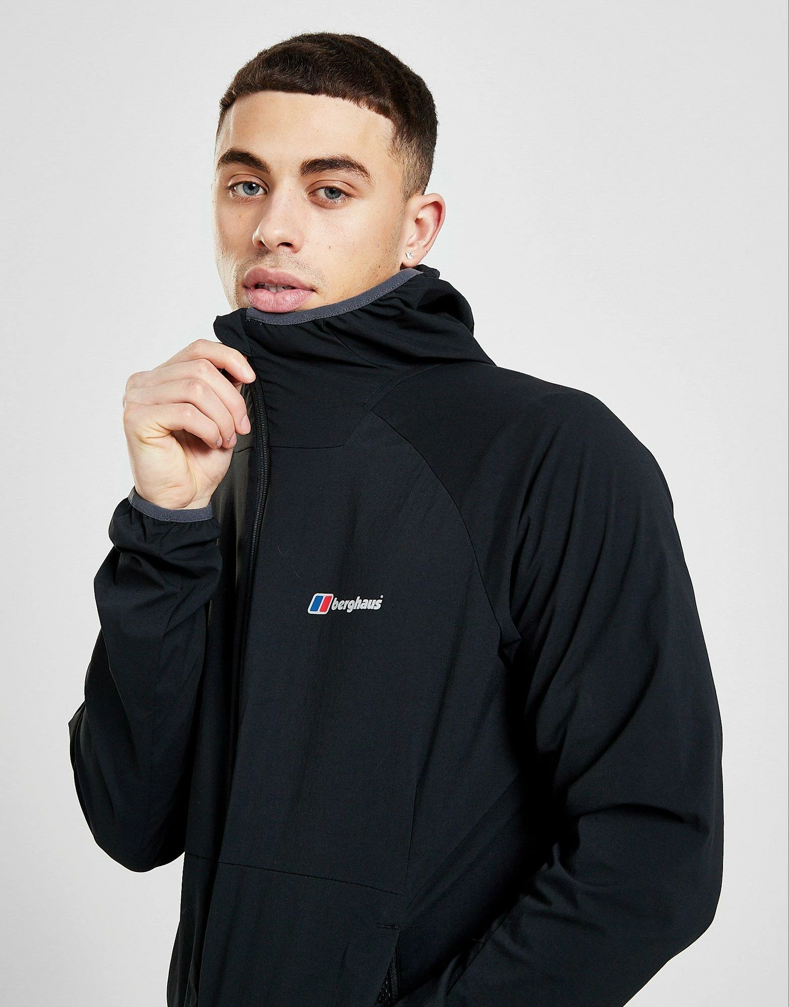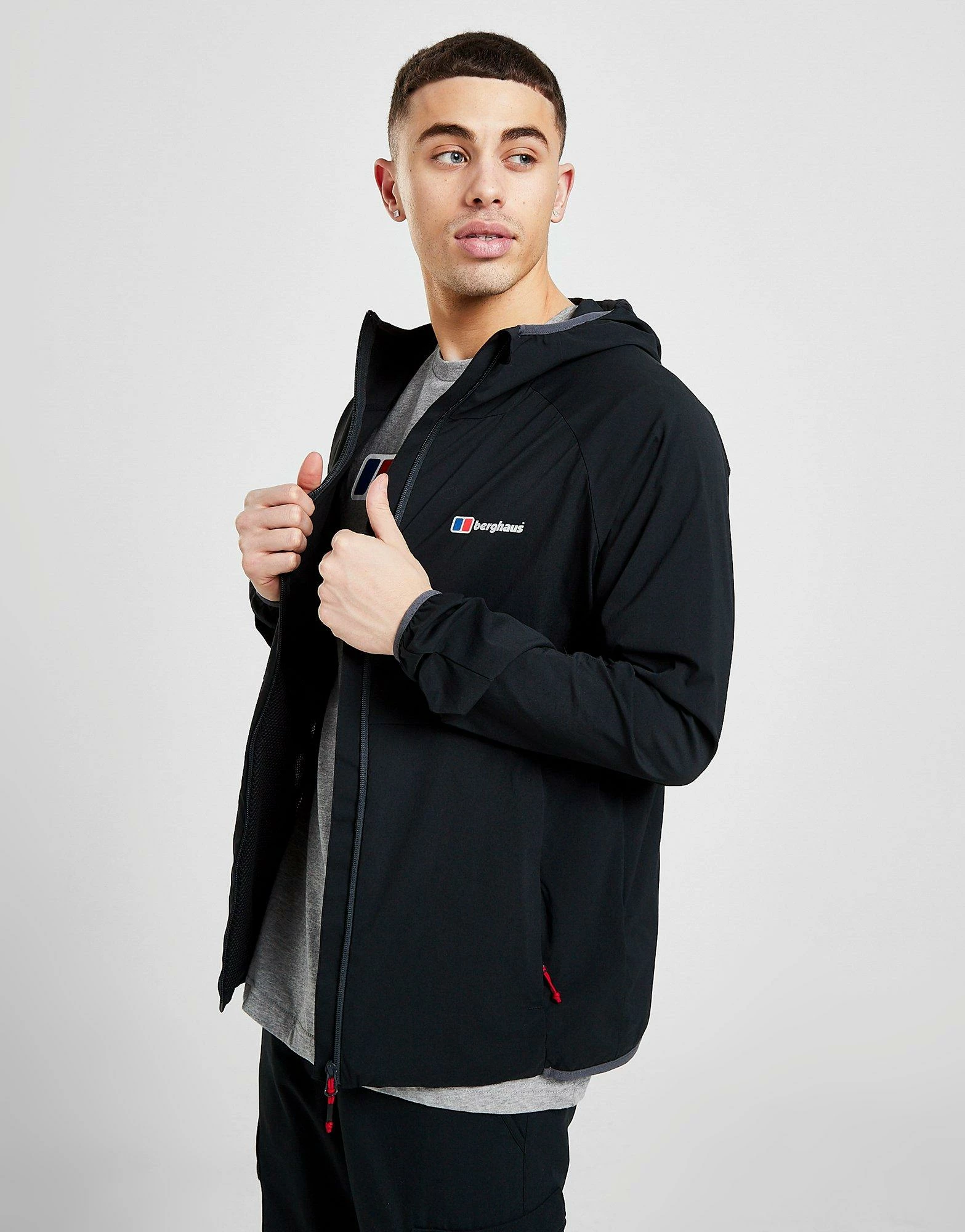 Exclusive. Stay drier for longer with this men’s Theran Full Zip Jacket from Berghaus. In a black colourway, this water resistant jacket is lightweight, breathable and comfy. It has a full zip closure and fitted hood with a stretch bound finish. With a single point adjustment hem for extra warmth, it’s finished up with pockets and Berghaus branding. Machine washable. | Our model is 5’11” with a 38″ chest and wears a size medium.