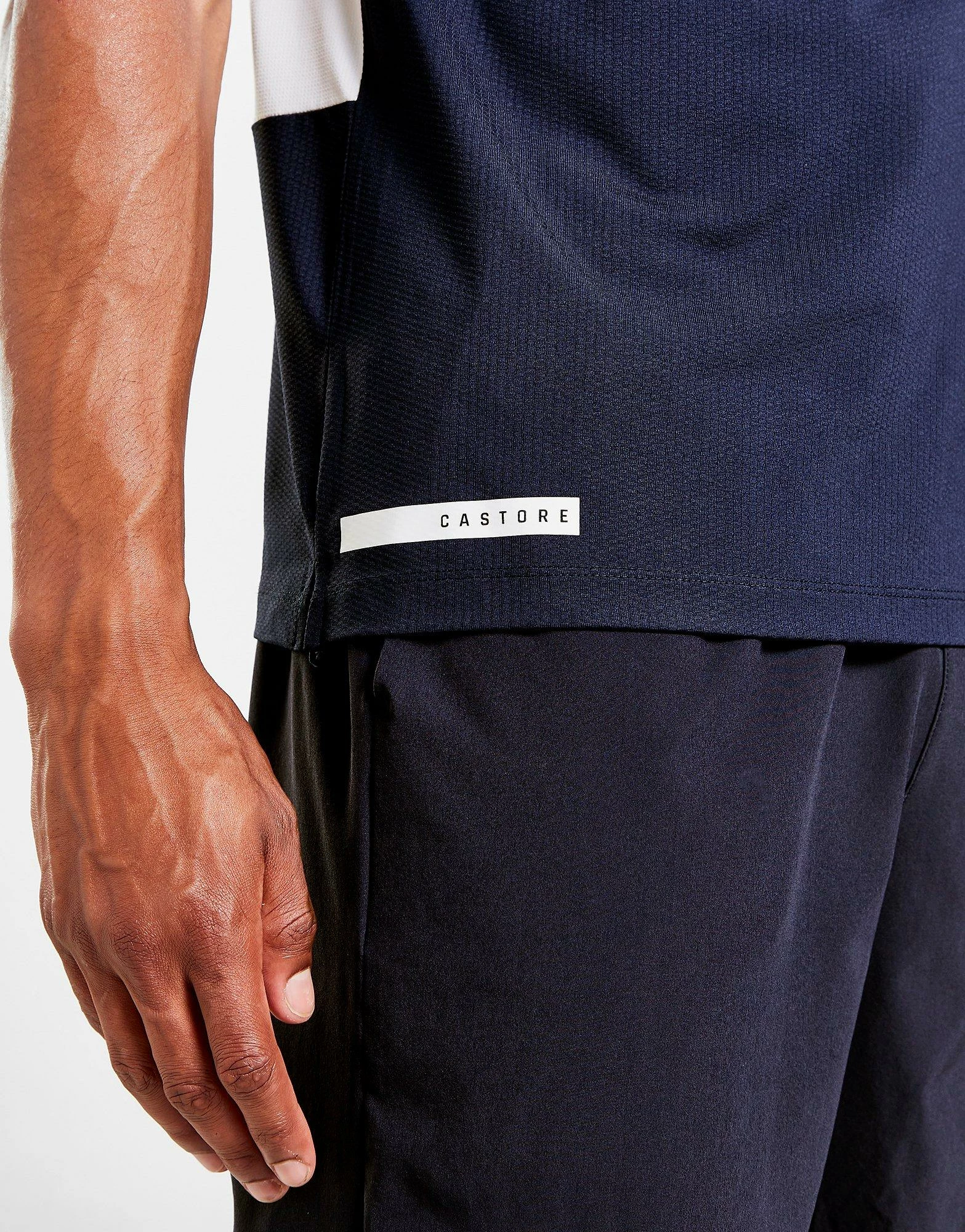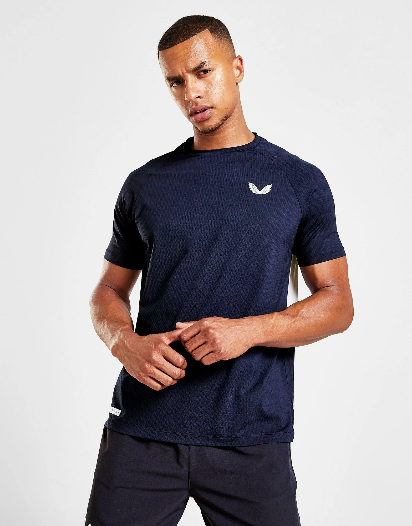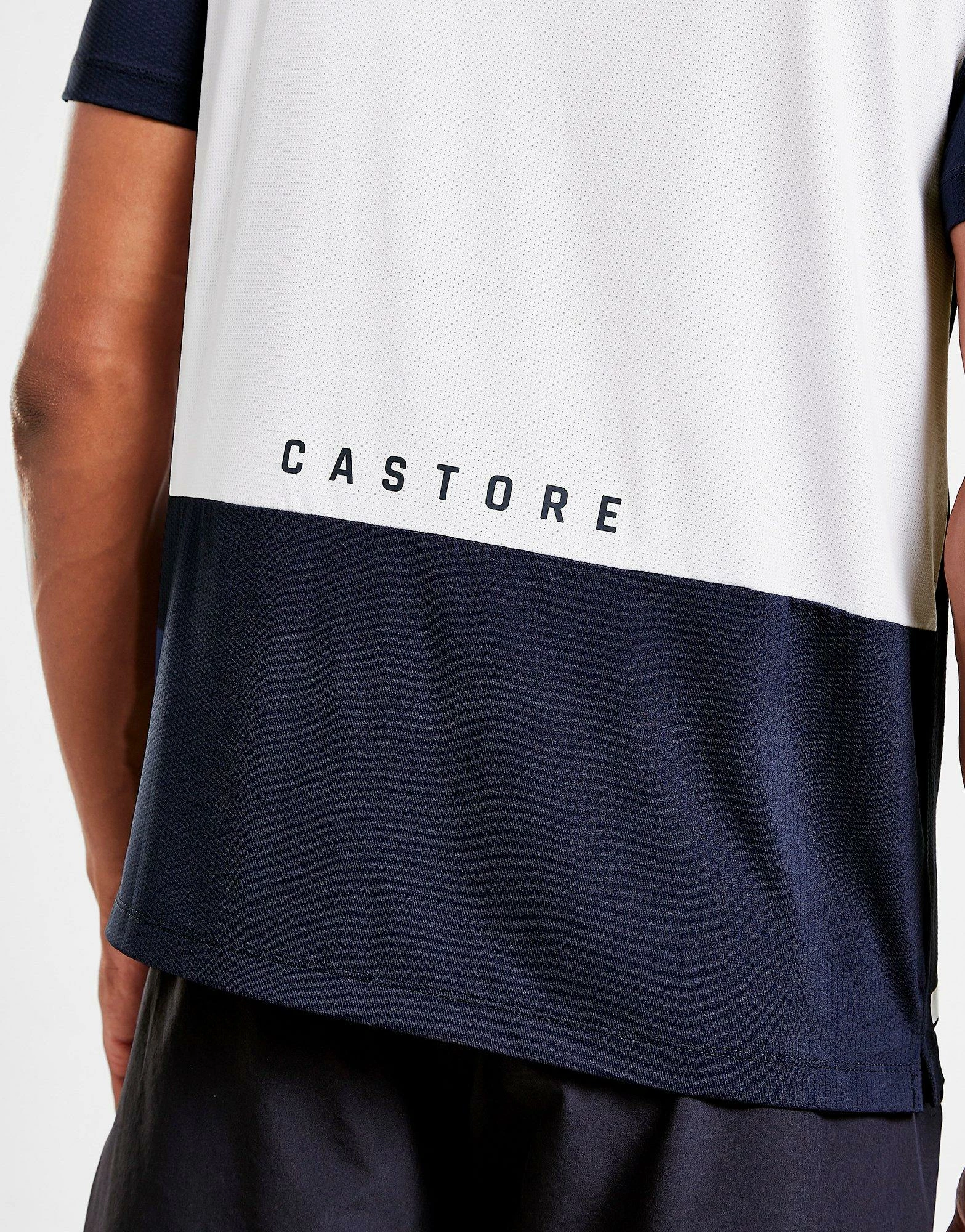 Push your performance with this men’s Cobalt T-Shirt from Castore. In a Navy and White colourway, this standard fit tee is cut from light, breathable poly fabric for cool comfort as you train. It features short sleeves with a crew neckline and comes with built-in sweat-wicking tech to ensure you stay dry and focussed on your goals. Finished up with Castore branding to the chest and back. Machine washable | Our model is 6’1″ with a 40″ chest and wears a size medium.