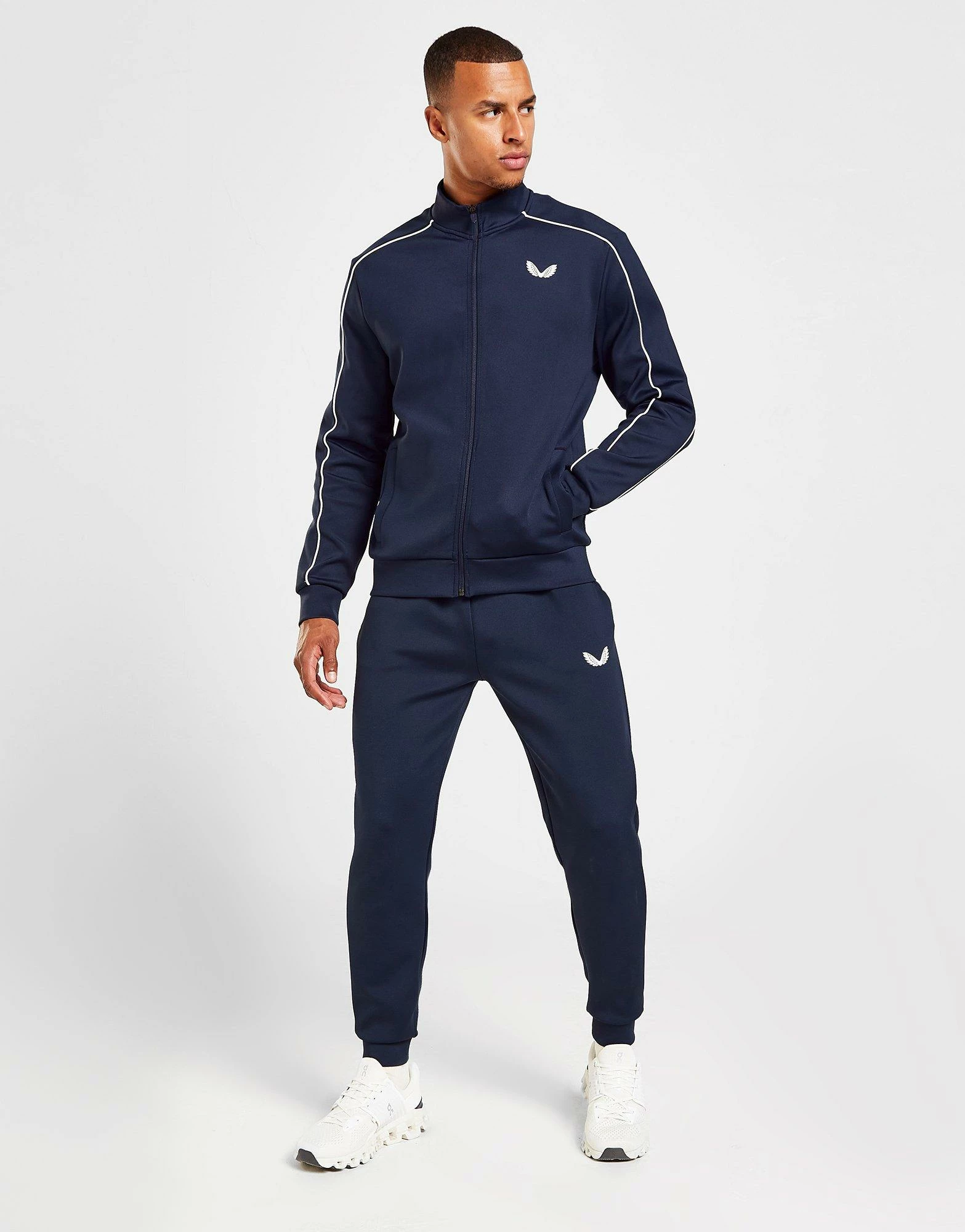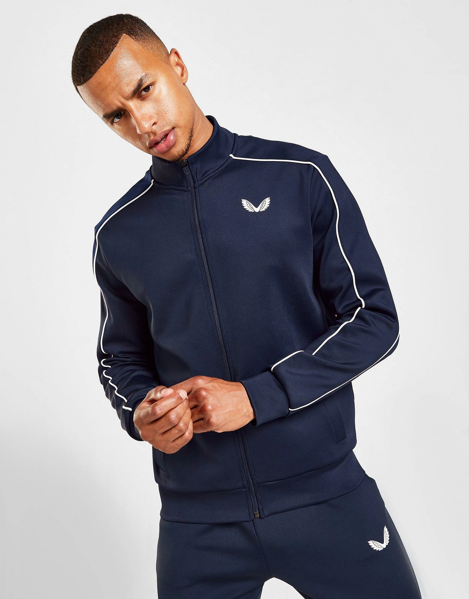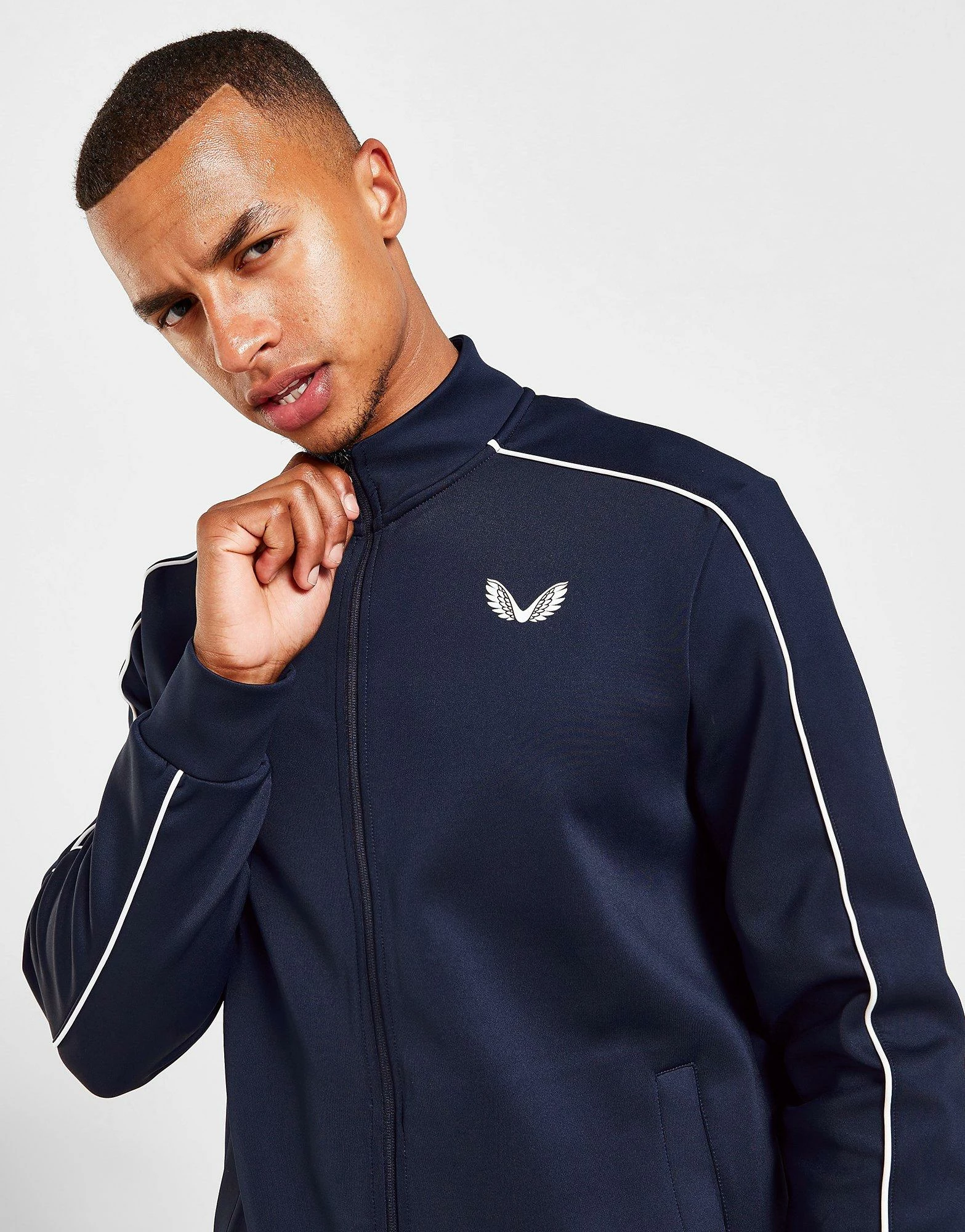 Rep a sporty look with this men’s Cobalt Track Top from Castore. In a Navy colourway, this standard fit top is cut from smooth, lightweight fleecey fabric for everyday comfort. It features a full-zip fastening for custom coverage, with ribbed trims to secure the fit and side pockets for your essentials. Finished up with Castore branding to the chest. Machine washable | Our model is 6’1″ with a 40″ chest and wears a size medium.