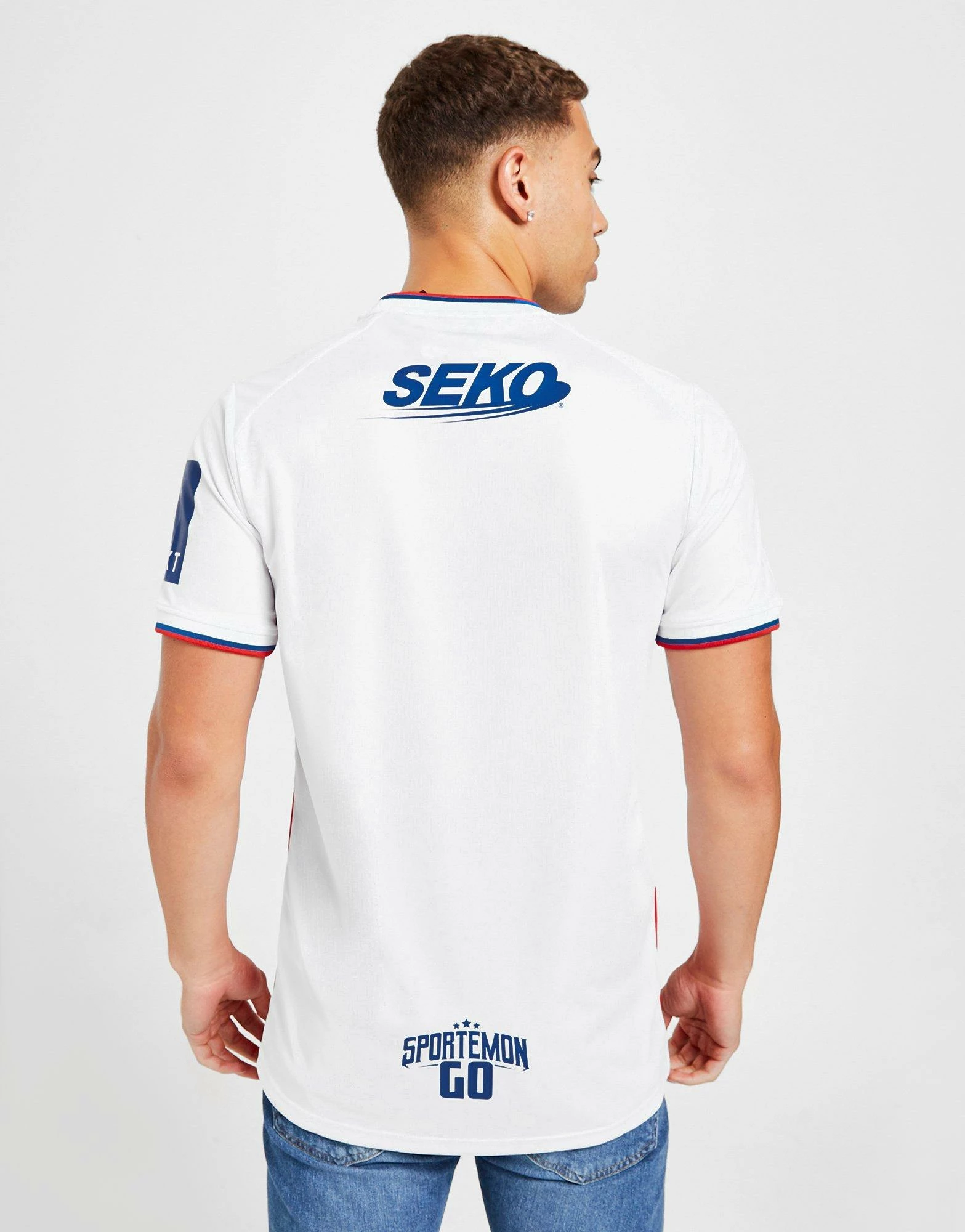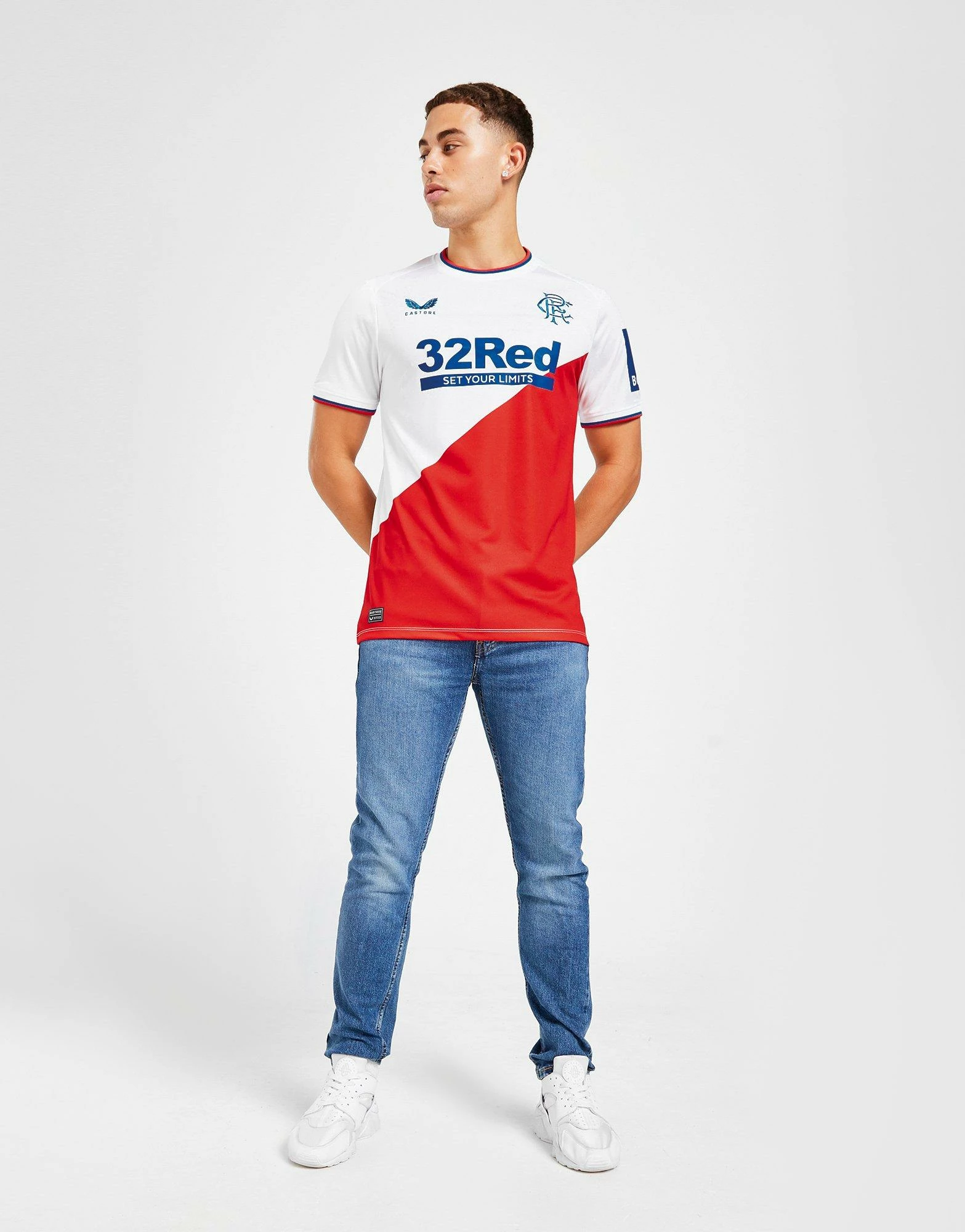 Dial up your support this season in this men’s Rangers FC 2022/23 Away Shirt from Castore. Coming in a White and Red colourway, this standard-fit shirt is cut from smooth, lightweight poly fabric with a natural stretch for essential comfort. Taking design cues from what the pros wear, it features a classic crew neckline and short sleeves, with Red and Blue stripes at the ribbed collar and cuffs. Finished up with Castore branding to the chest, alongside the iconic Rangers FC crest ot highlight your pride. Machine washable. | Our model is 5’11” with a 38″ chest and wears a size medium.