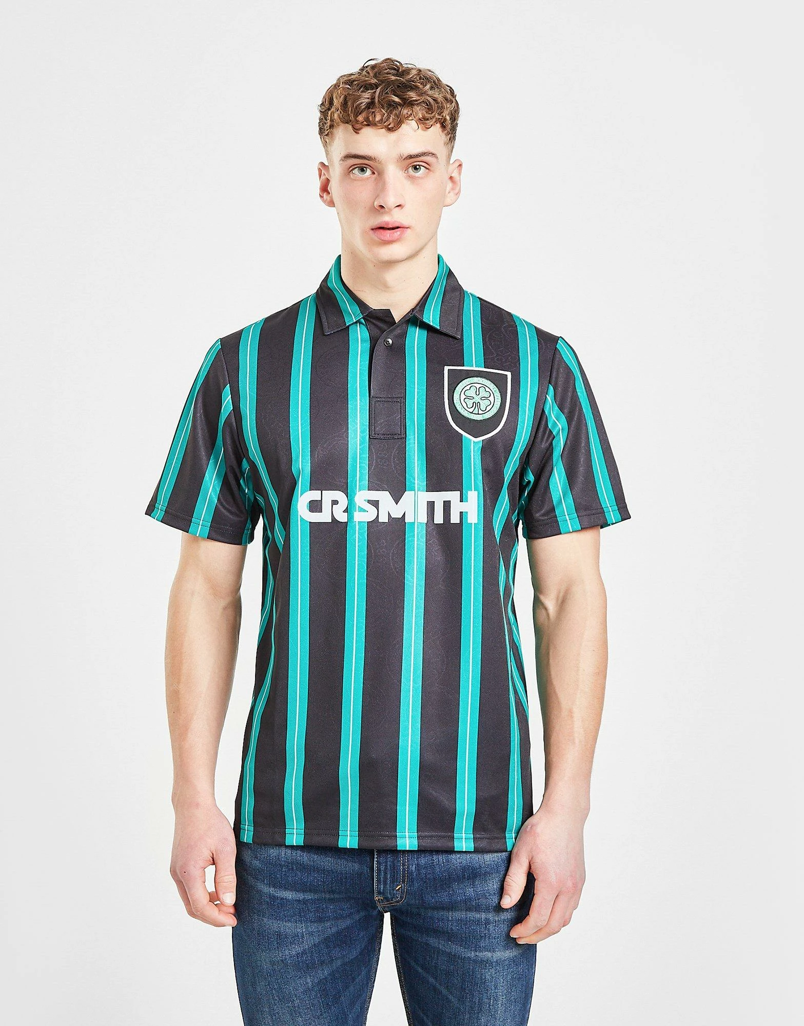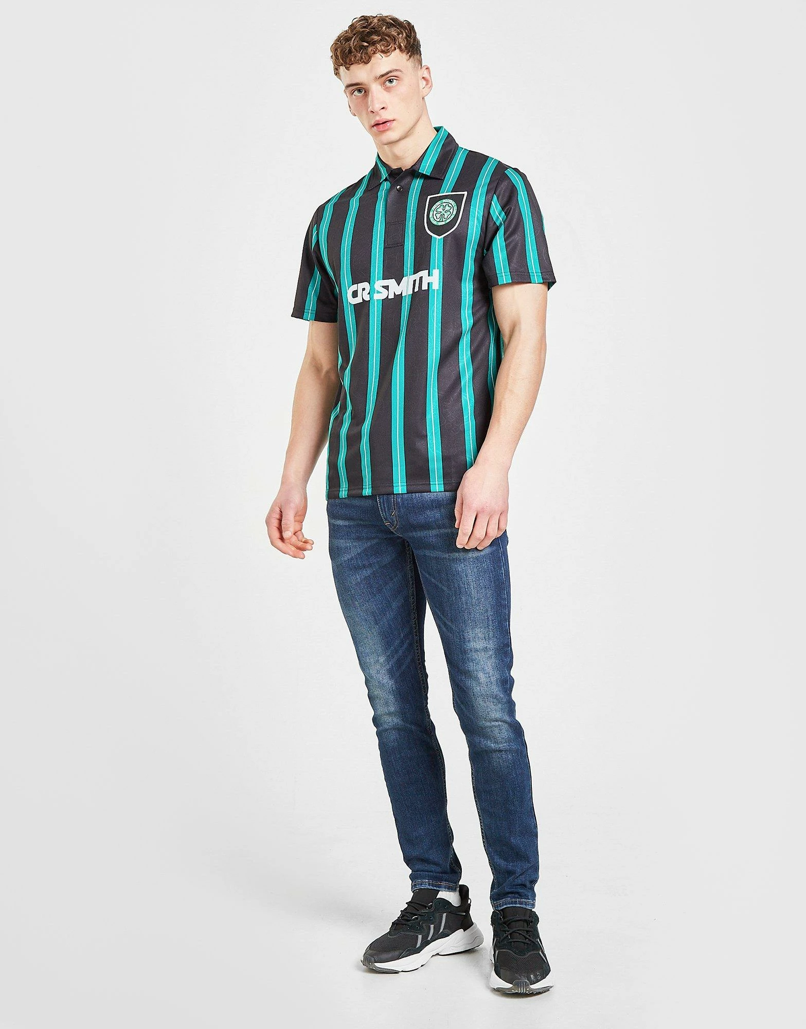 Throw it back with this men’s Celtic FC ’83 Away Shirt from Celtic Retro. In a bold green and black stripe colourway with all-over graphics, this regular-fit shirt is made from lightweight poly fabric. It features a a spread collar, as well as short sleeves. Finished with the iconic Celtic FC crest to the chest. Machine washable. | Our model is 6’2″ with a 39″ chest and wears a size medium._