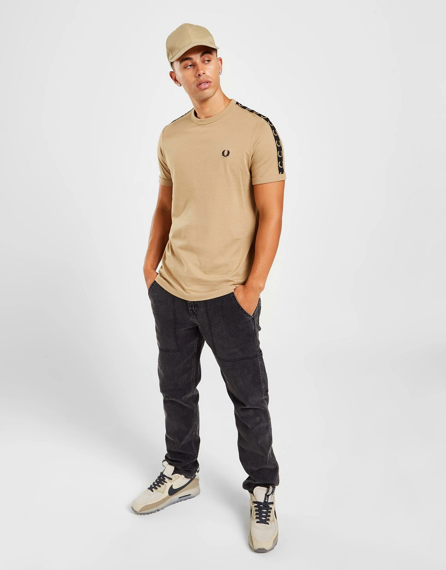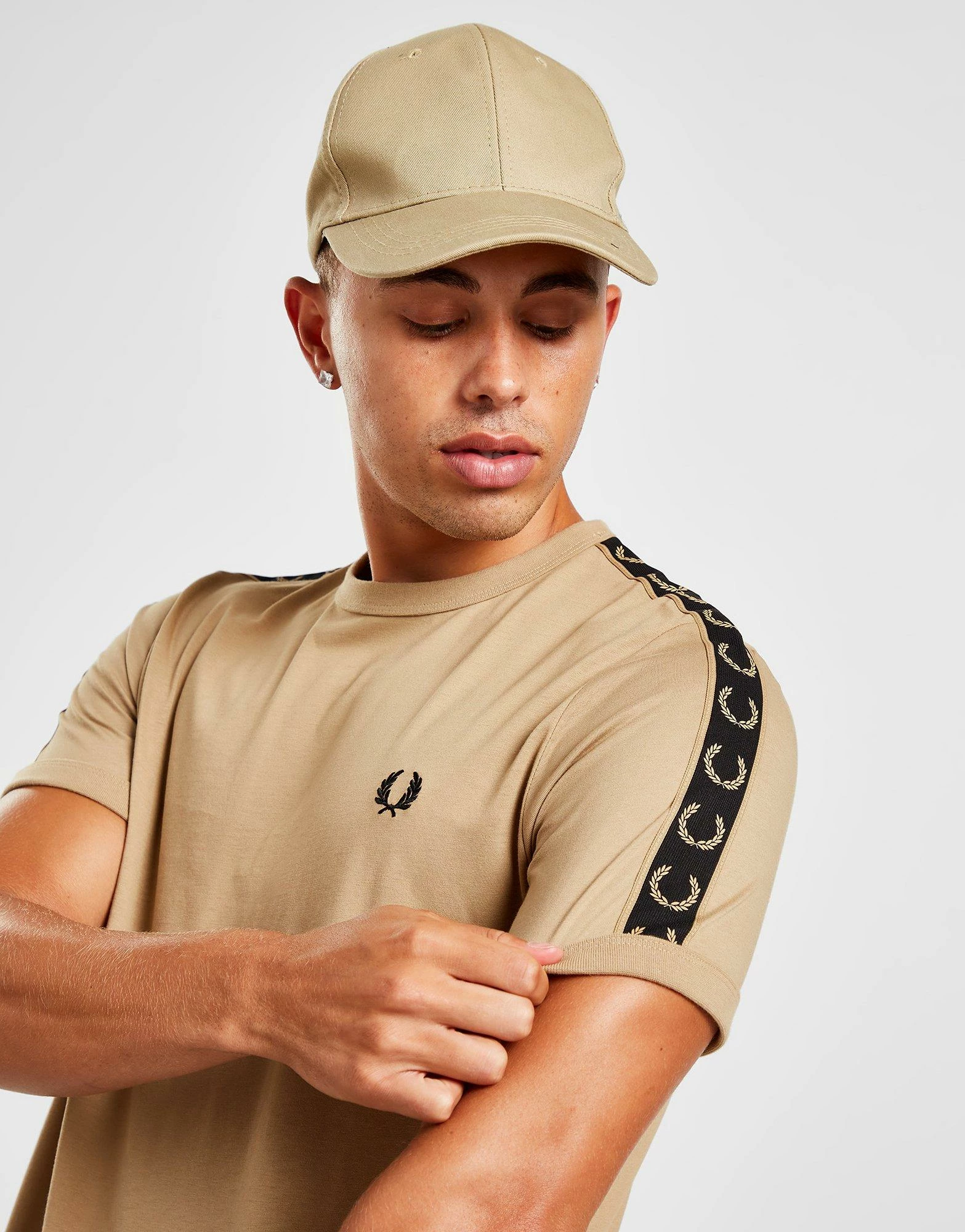 Add some premium heat to your everyday staples with this men’s Taped Ringer T-Shirt from Fred Perry. Coming in a Stone colourway, this tee is cut from soft, lightweight cotton for essential comfort every time. It features a classic crew neckline and short sleeves, with ringer detailing at the collar and cuffs. Finished up with contrast taping at the shoulder complete with repeat Fred Perry branding, and the legendary Laurel Wreath logo at the chest. Machine washable. | Our model is 5’11” with a 38″ chest and wears a size medium.