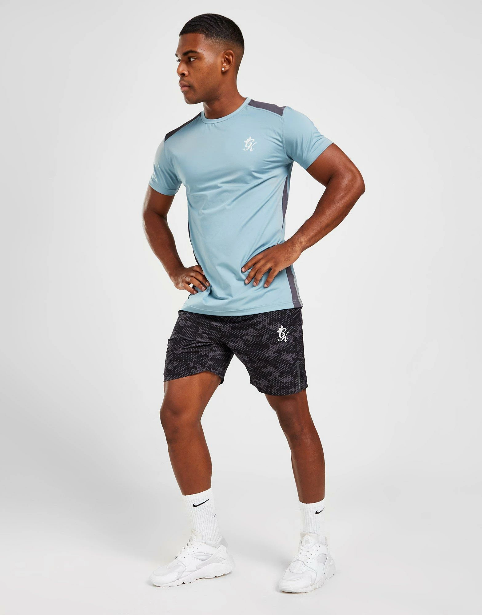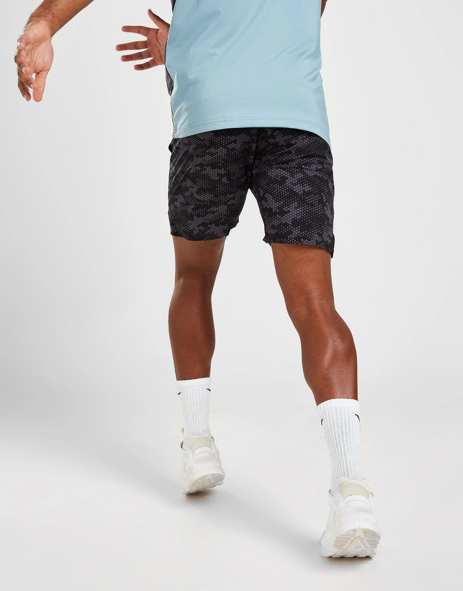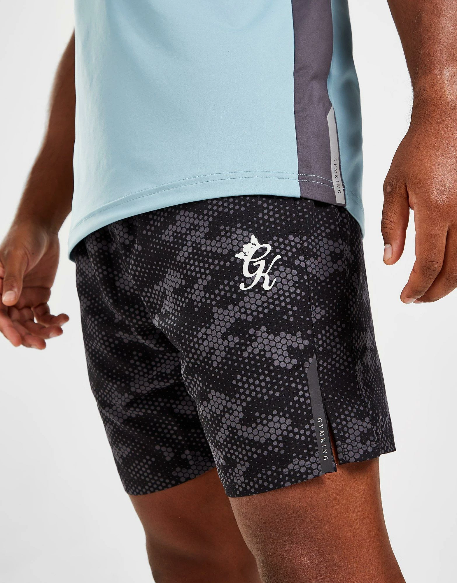 Stay fresh for every training sesh with these men’s Energy Shorts from Gym King. In a Black and Grey camo design, these regular-fit shorts have an elasticated waistband and internal drawcord fastening for custom comfort. They’re made from lightweight, sweat-wicking poly fabric to keep you cool and dry, while hem slits offer unrestricted movments on squats and lunges. These shorts are finished off with reflective GK branding to the left thigh. Machine washable. | Our model is 6’0″ and wears a size medium.