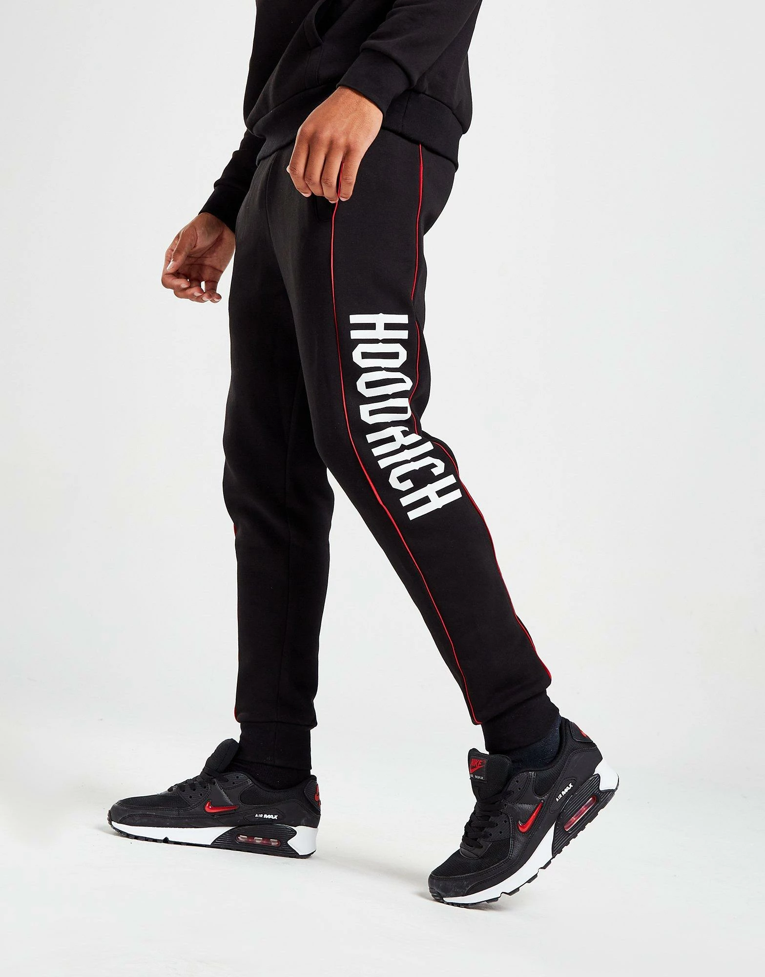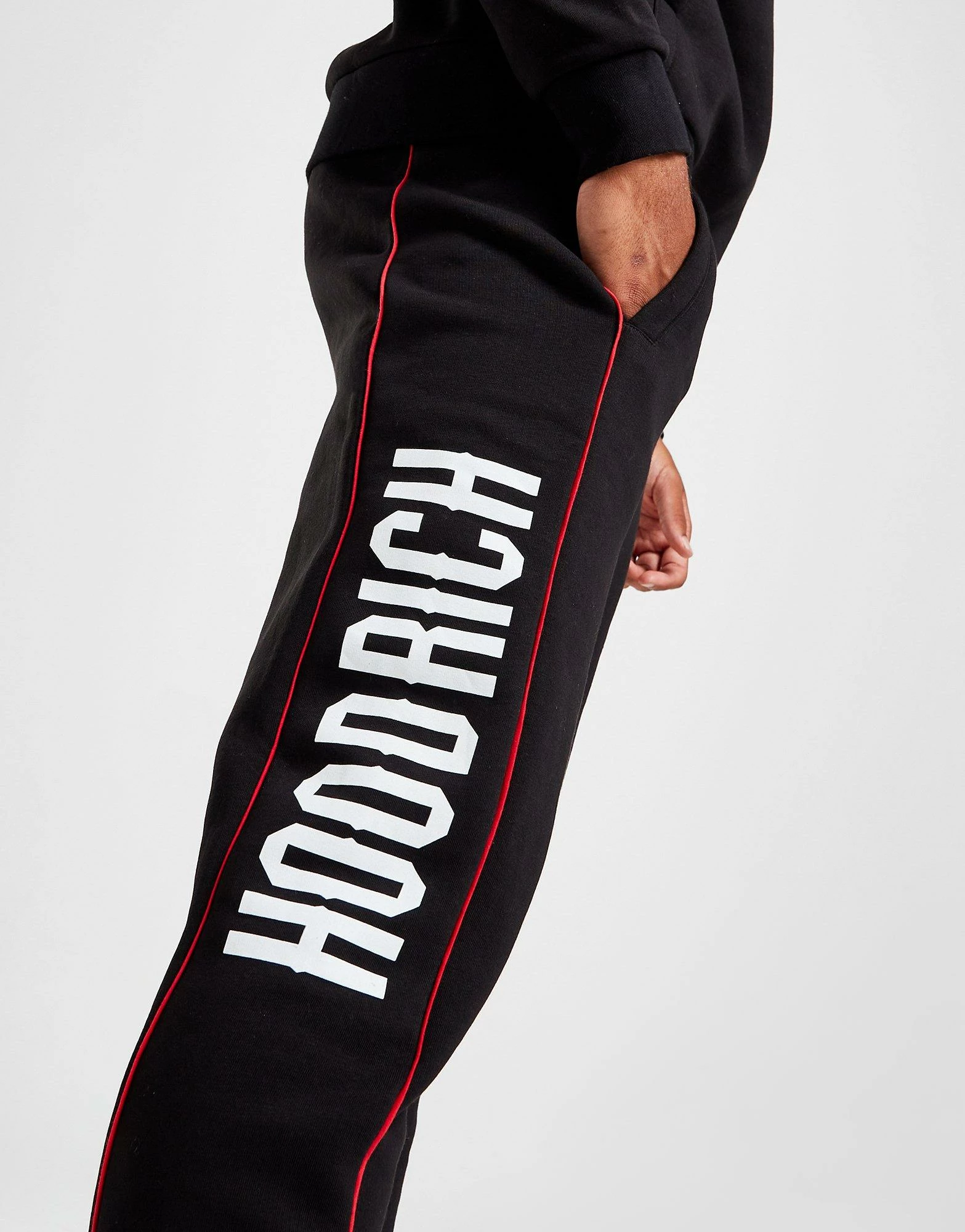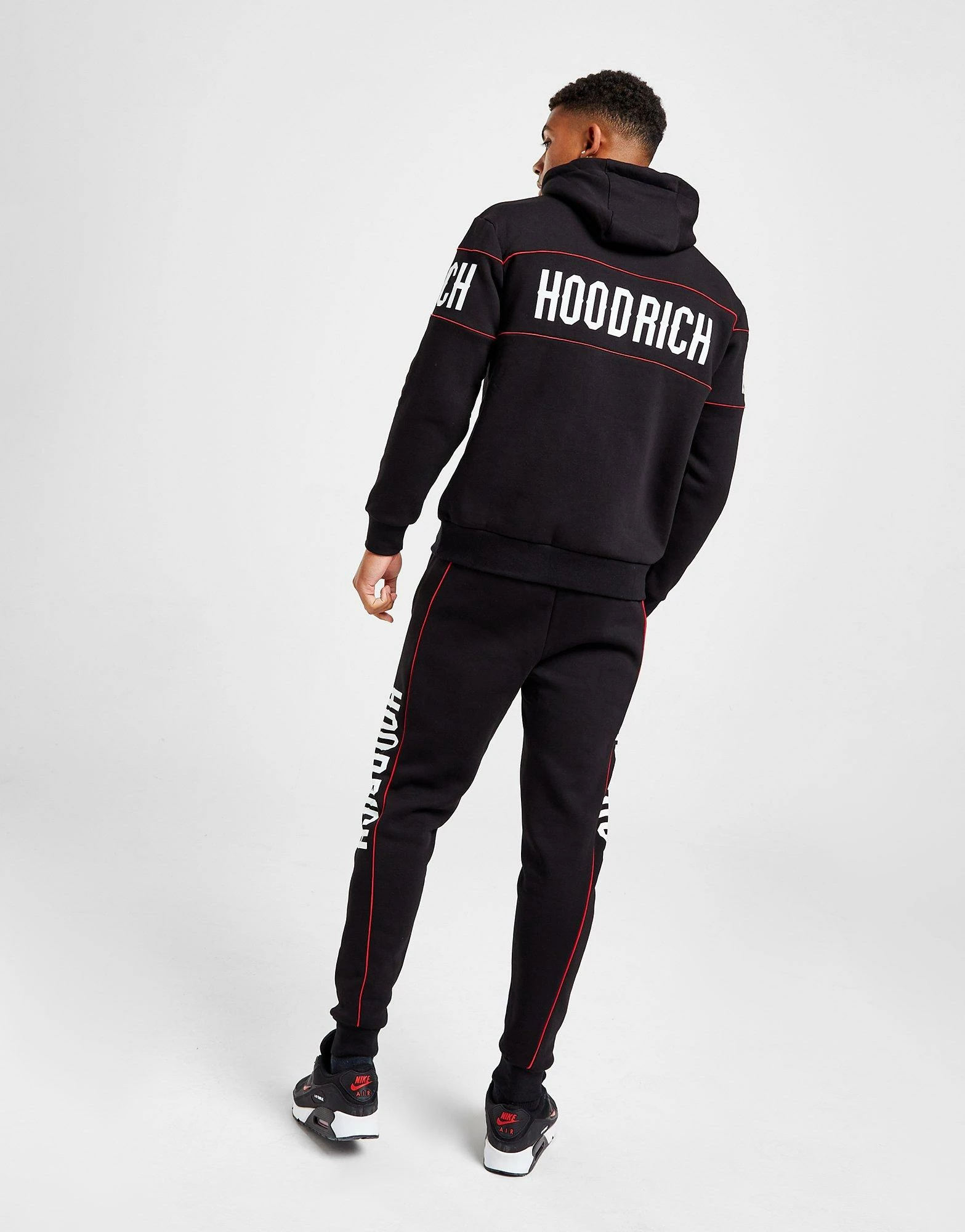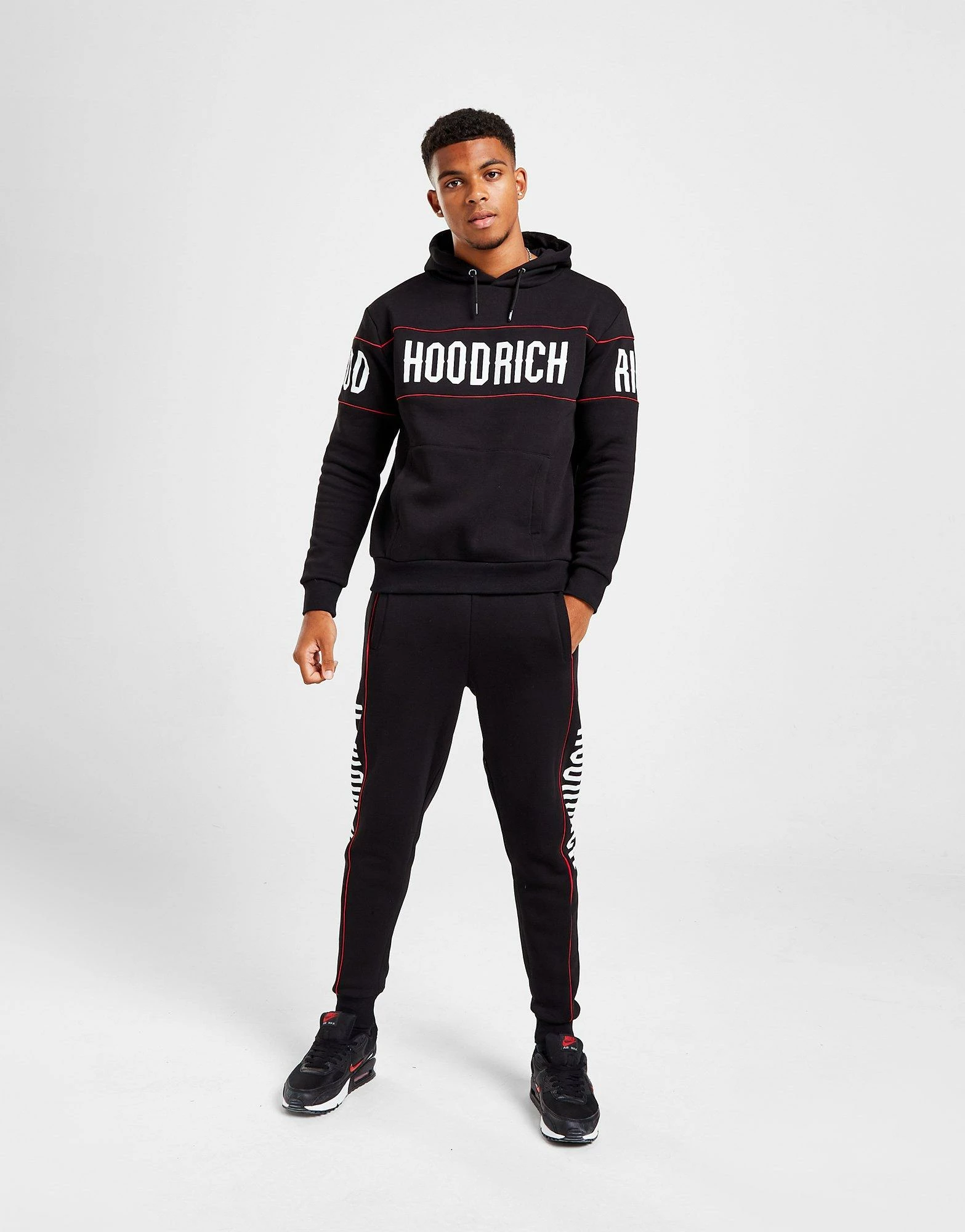 Cop a laidback look with this men’s Repeat Tracksuit from Hoodrich. In a Black colourway, this standard-fit set is made with soft, thick cotton-blend fleece for essential comfort. It features a long-sleeve pullover with an adjustable hood for full coverage, and matching joggers with an elasticated drawcord waist for a custom fit. It has stretchy ribbed trims to secure the fit, with side and kangaroo pockets, and concealed zip pockets to stash your stuff. Finished up with bold Hoodrich branding at the chest and thigh. Machine washable. | Our model is 6’0″ with a 35″ chest and wears a size medium.