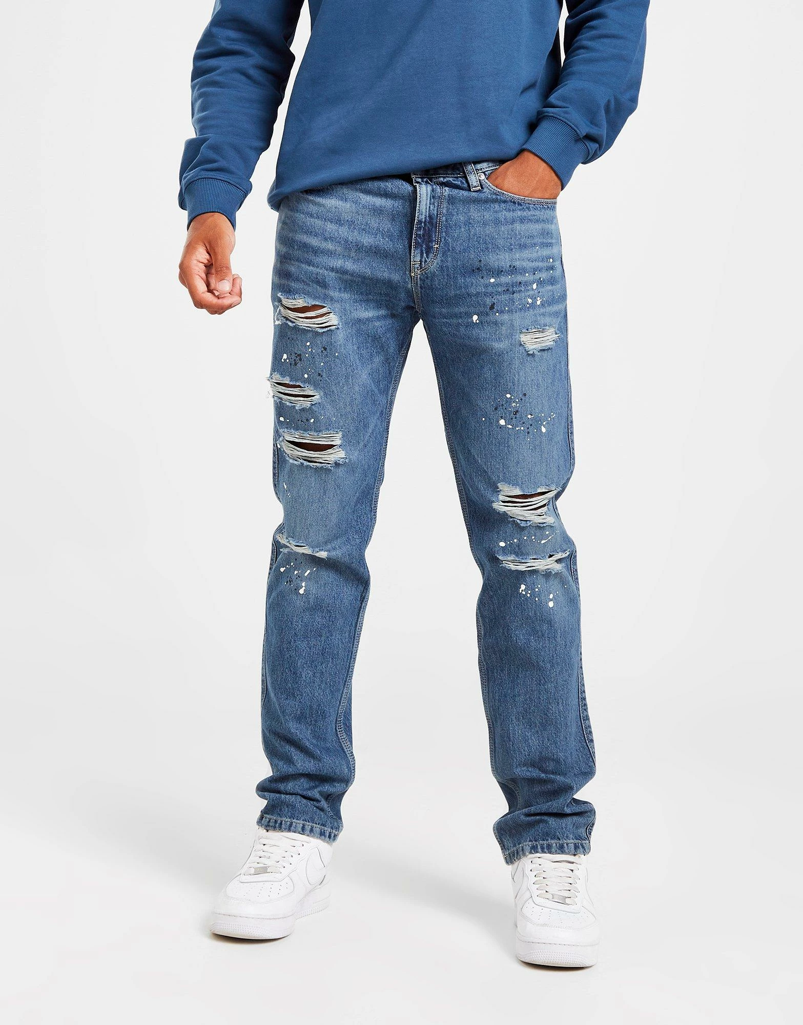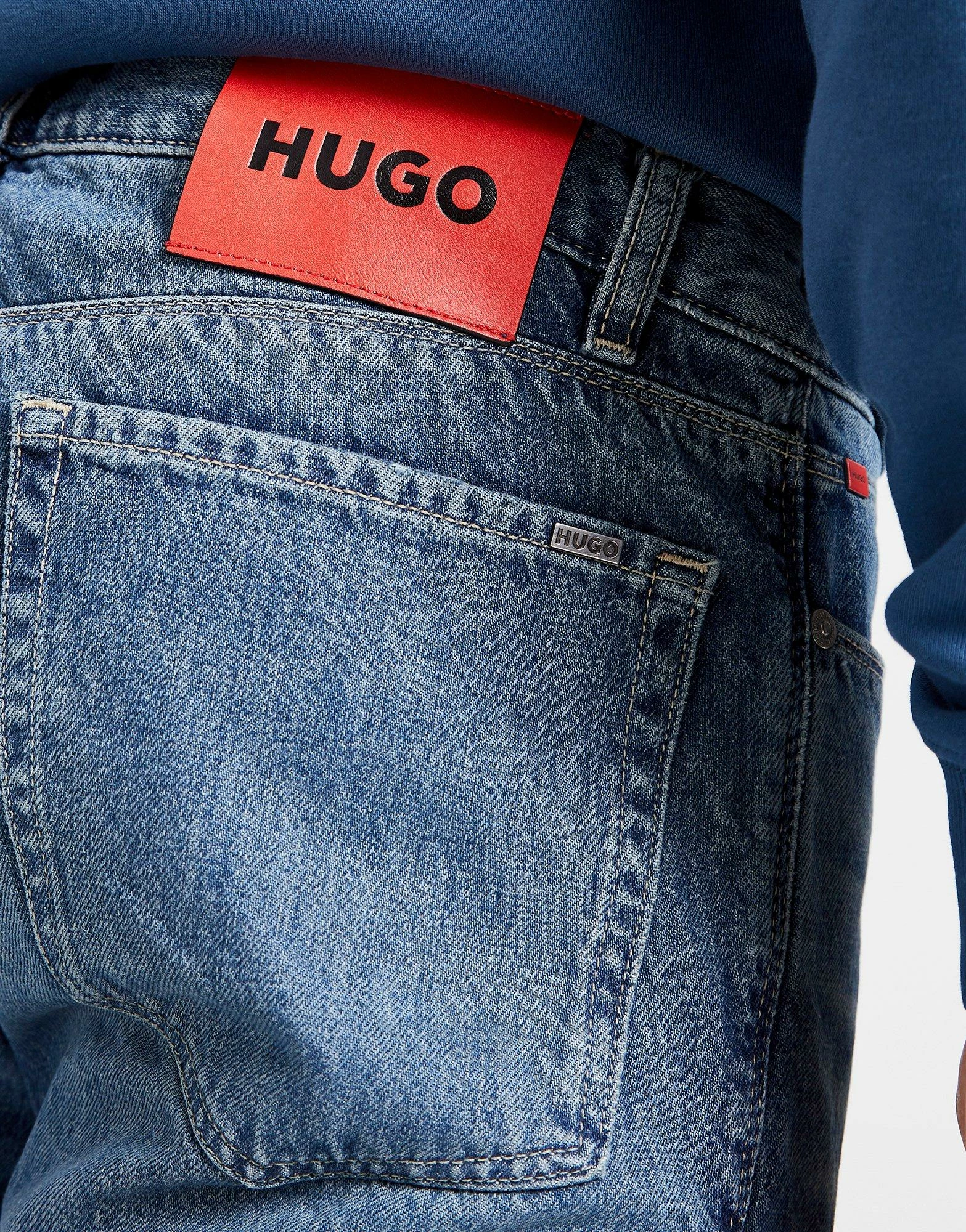 Upgrade your denim with these men’s Distressed Slim Paint Jeans from HUGO. In a Dark Wash, these slim-fit jeans are made from rigid denim with recycled cotton. They feature a button and zip fly fastening, as as as a mid-rise waistband with belt loops to the waist. With a classic five pocket construction, these jeans are finished up with distressed detailing, paint splatters and signature HUGO branding. | Our model is 6’1 and wears a size M.