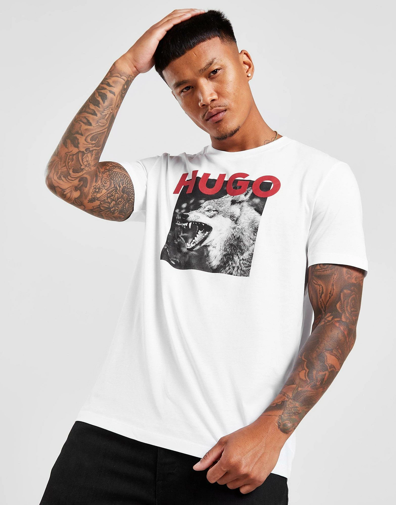 Make a statement with this men’s Dupus Wolf T-Shirt from HUGO. Made from premium cotton fabric for all-day comfort, this weekend tee has a classic crew neckline and short sleeves for a signature fit. Landing in a White colourway, it’s finished off with red HUGO branding and a wolf graphic to the chest. Machine washable. | Our model is 6’0″ with a 40″ chest and wears a size medium.