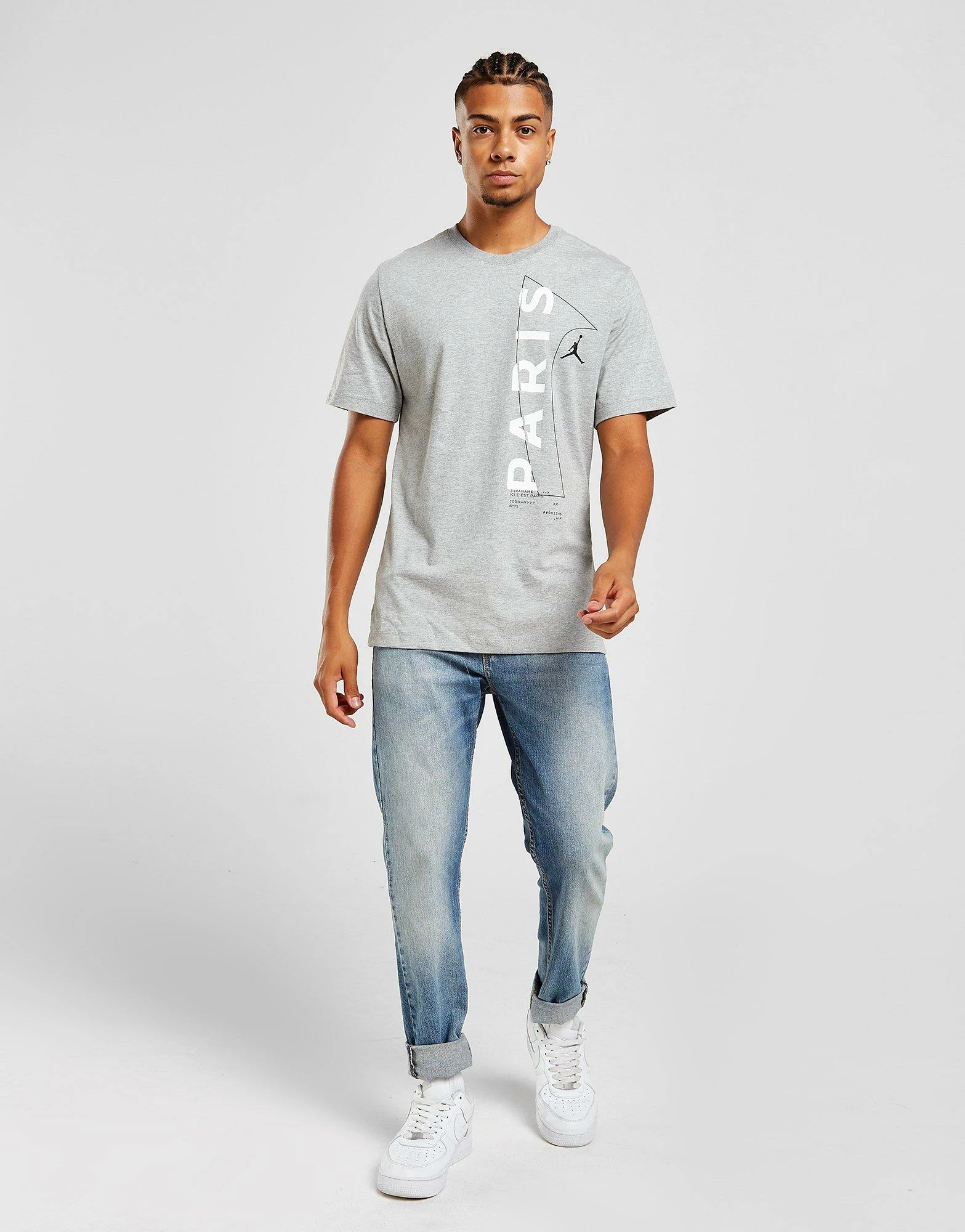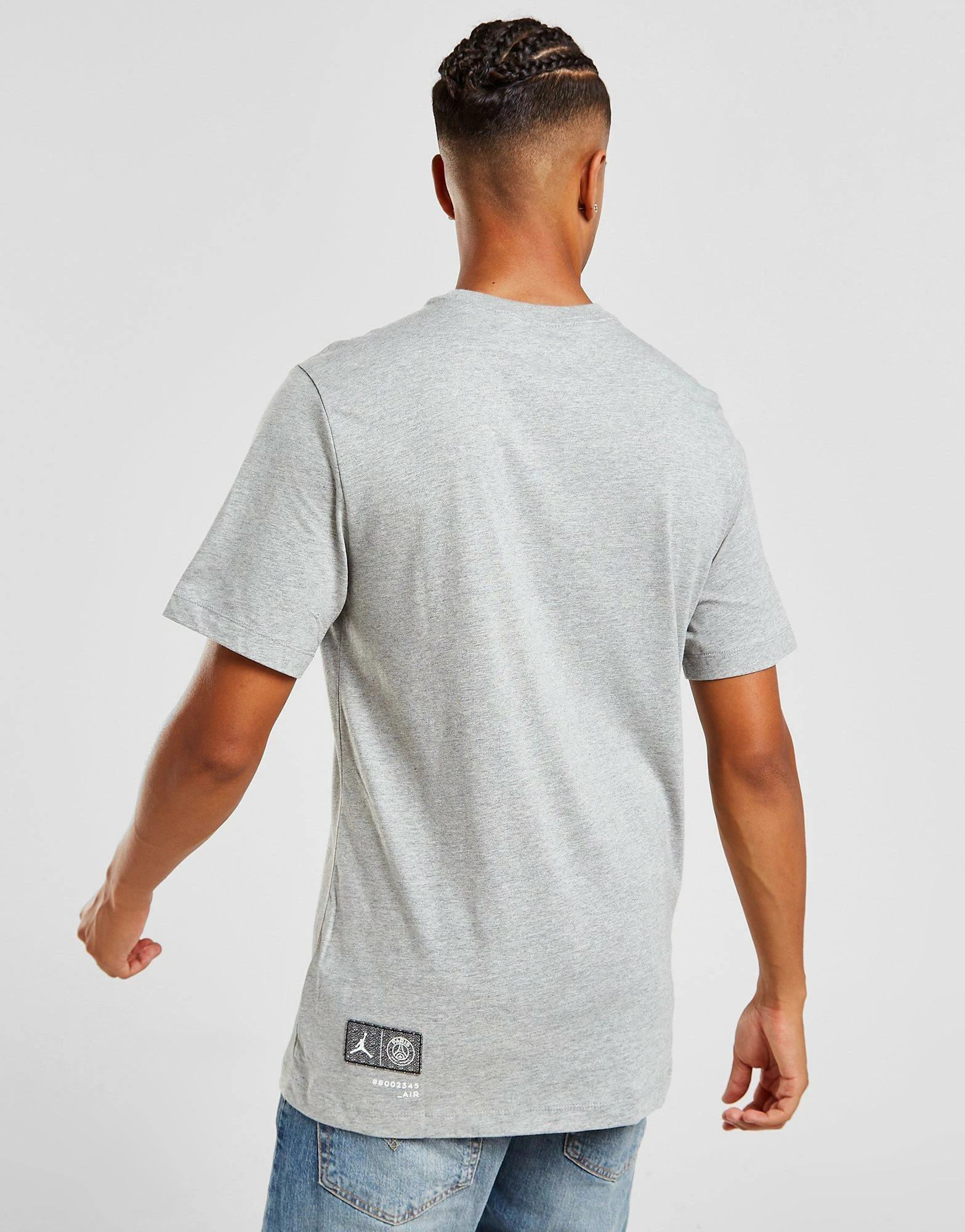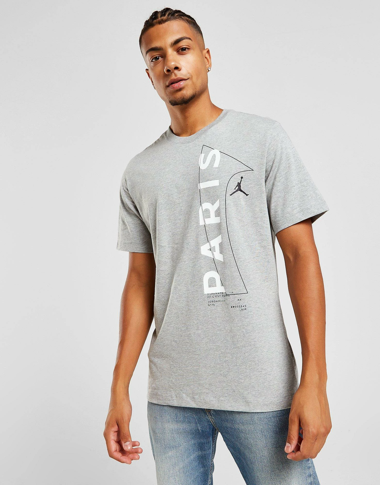 Keep comfy and cop from the latest collab with this men’s Paris Saint Germain Wordmark T-Shirt from Jordan. In a Grey Heather colourway, this standard-fit tee is made from soft cotton fabric for a laidback feel. It features a ribbed crew neckline and short sleeves. With a contrasting Paris wordmark, this T-shirt is finished up with a Jordan Jumpman logo. Machine washable. | Our model is 6’0″ with a 38″ chest and wears a size medium.