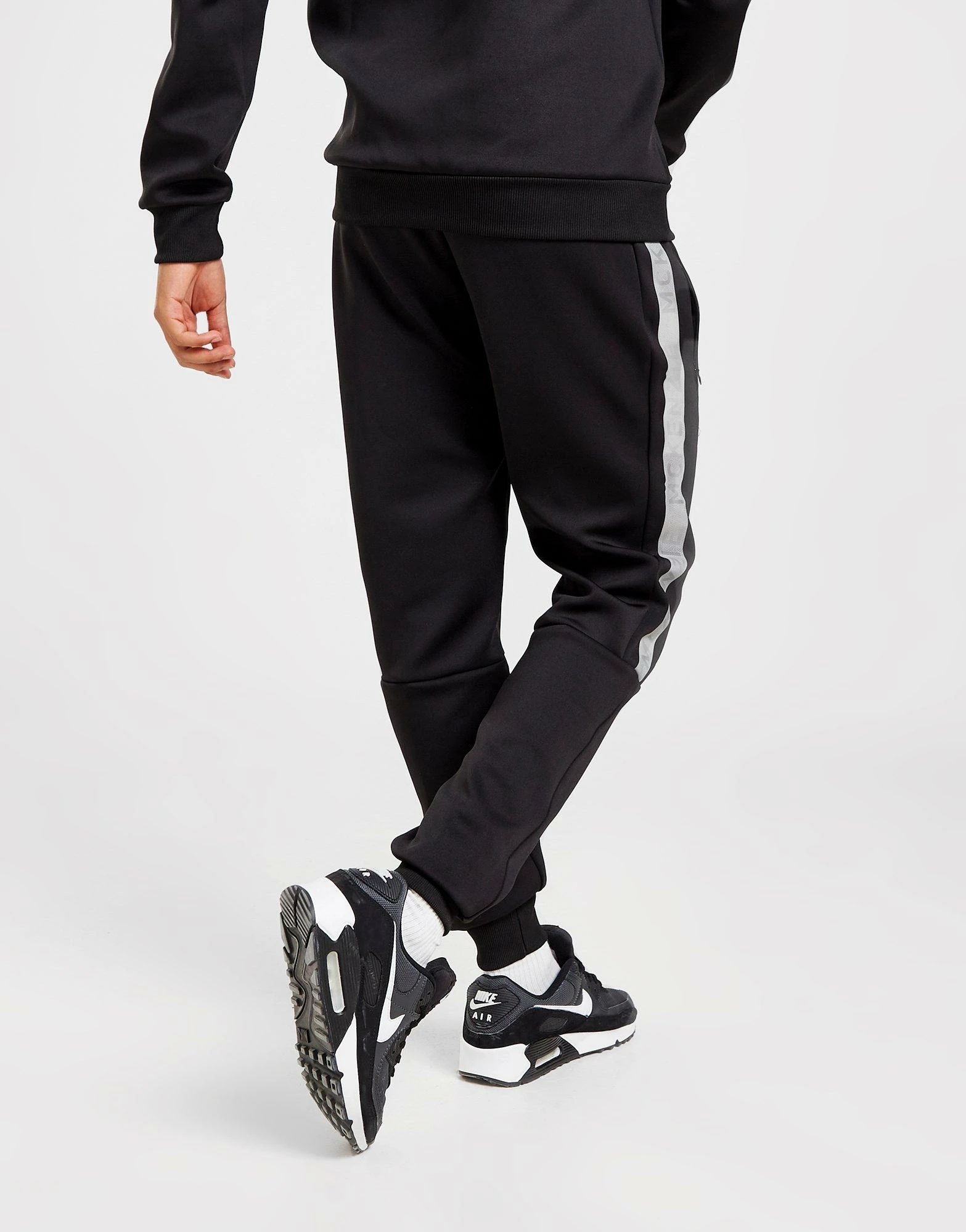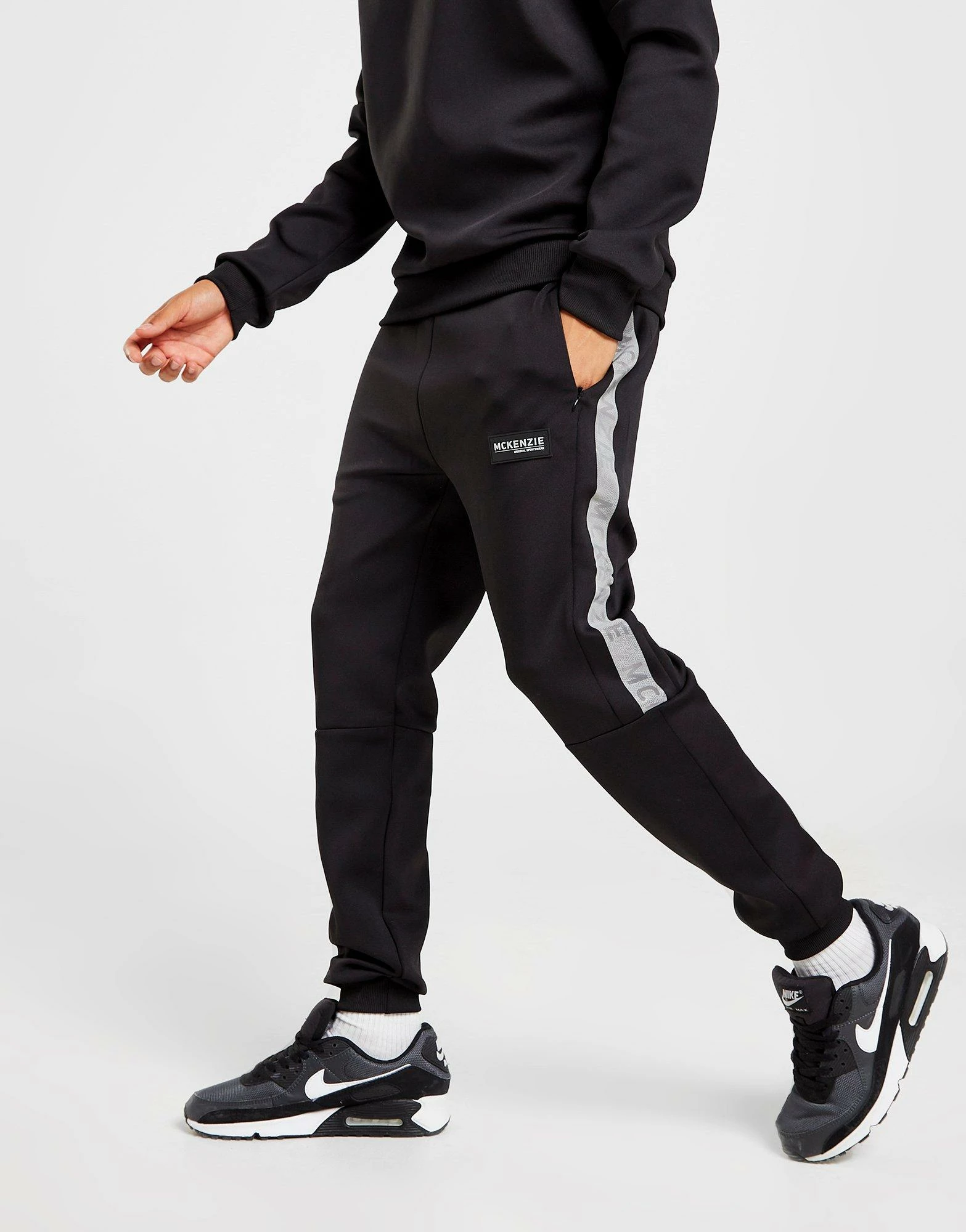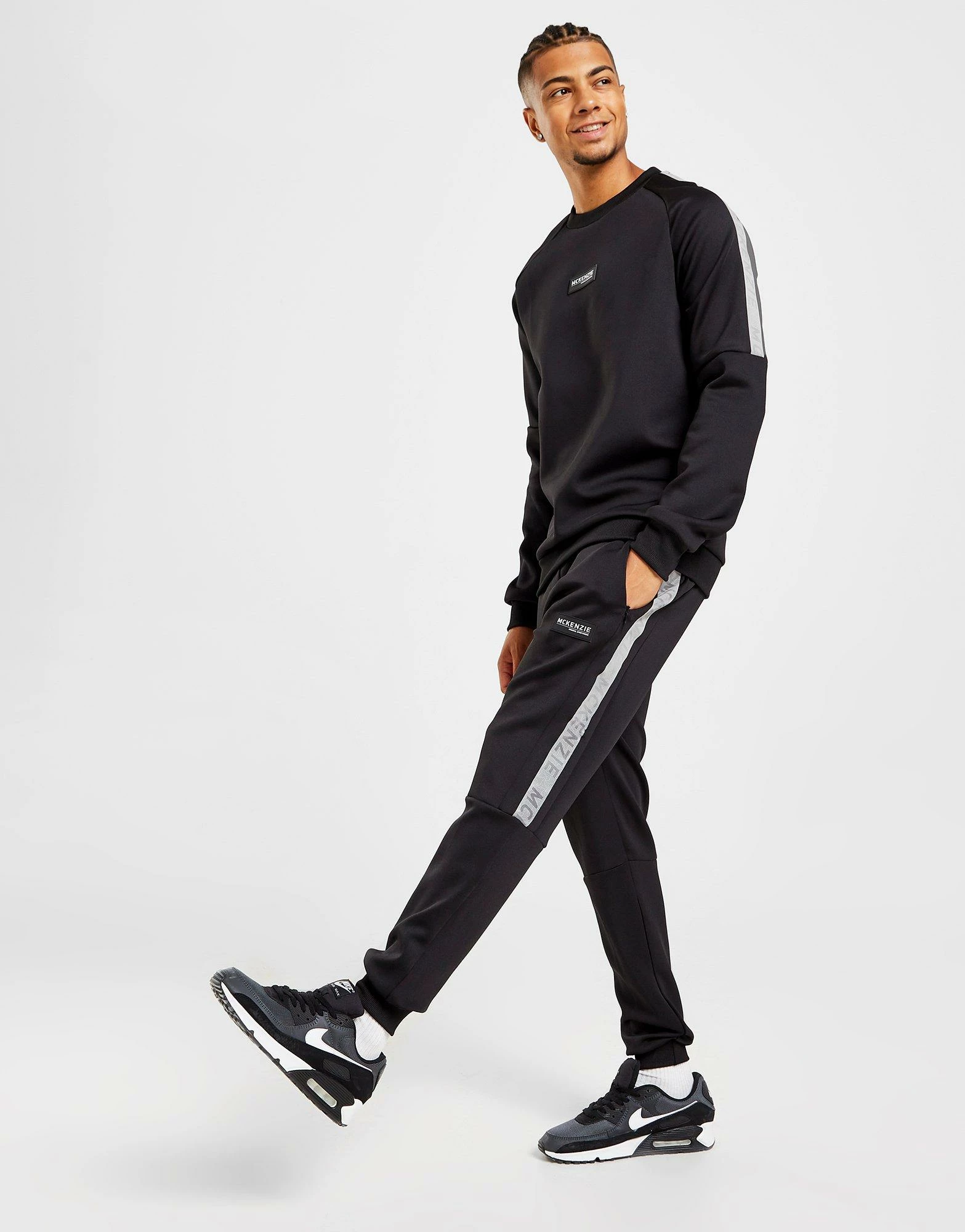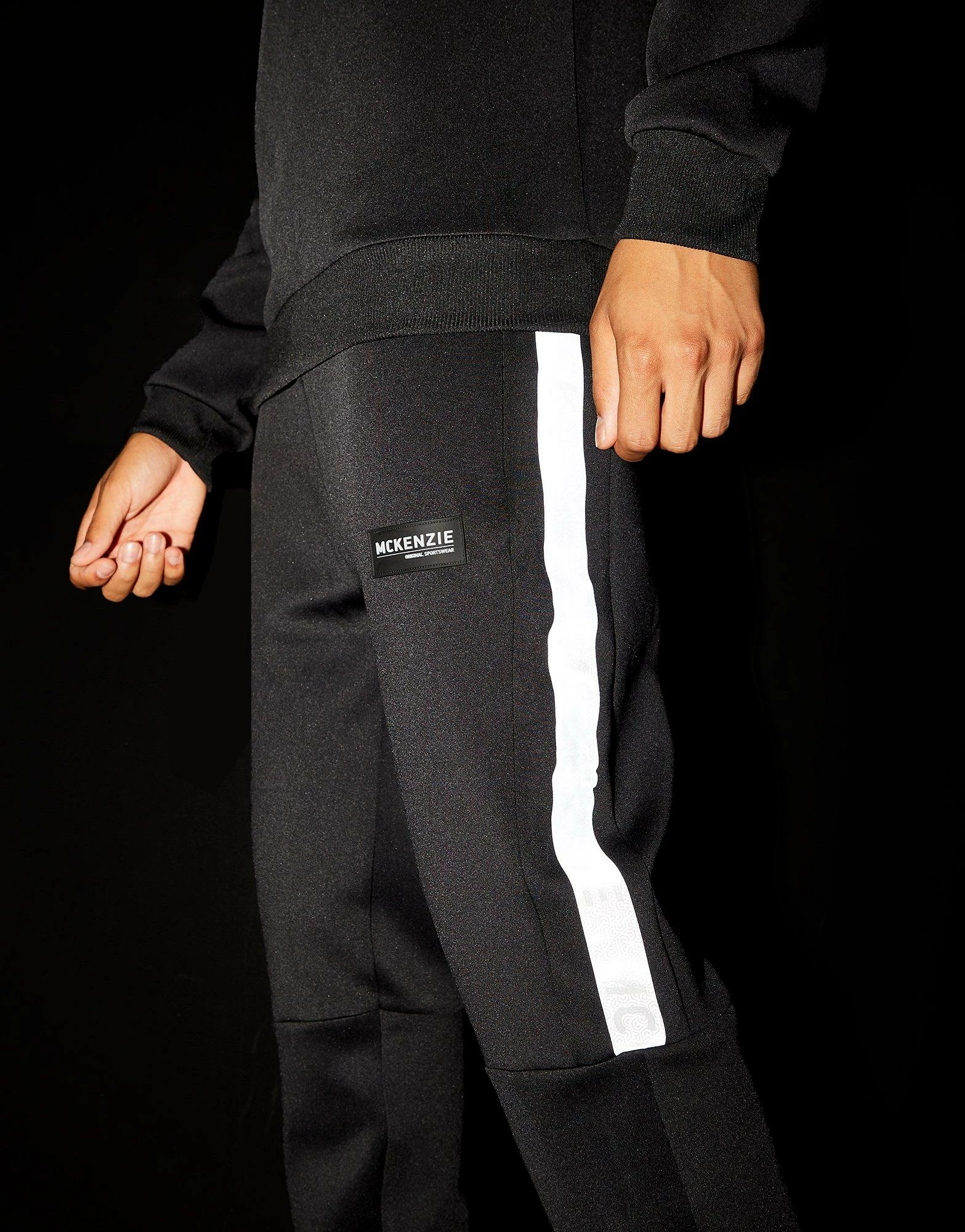 Cop some street-ready heat in these men’s Dempsey Poly Track Pants from McKenzie. In a Black colourway, these exclusive track pants are made with ultra-smooth stretch poly fabric for essential comfort. They feature an elasticated waistband with a drawcord to adjust the fit, and ribbed ankle cuffs for a secure feel. They have side pockets to stash your gear, with bold reflective panels on the sides with repeat McKenzie branding. Signed off with a classic logo on the thigh. Machine washable. | Our model is 6’0″ and wears a size medium.