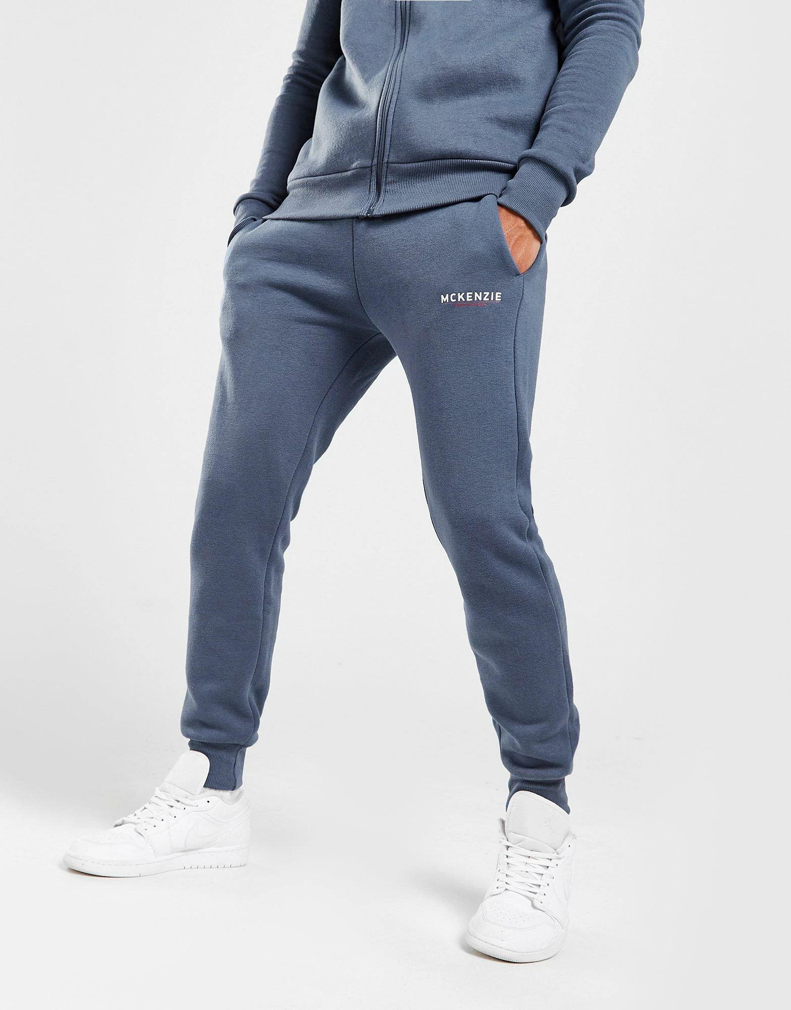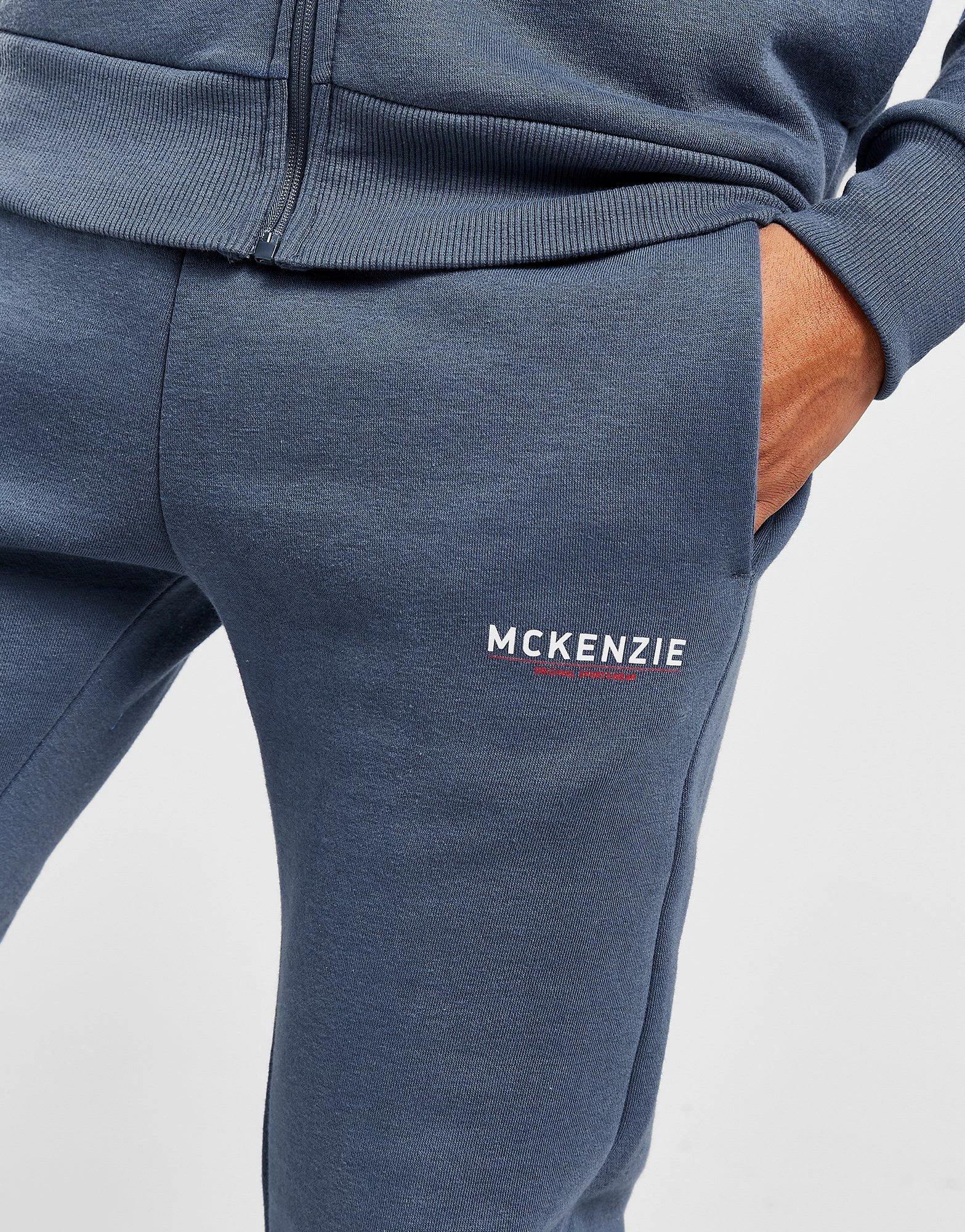 Kick back on off-duty days with these men’s Essential Cuffed Joggers from McKenzie. In an Ensign Blue colourway, these tapered sweats are made from a soft cotton-poly blend, with stretchy ribbed trims for a streamlined fit. They feature a drawcord-adjustable waistband for custom comfort, as well as side pockets to keep your essentials. Finished off with contrasting White McKenzie branding to the left thigh. Machine washable. | Our model is 6’1″ and wears a size medium.