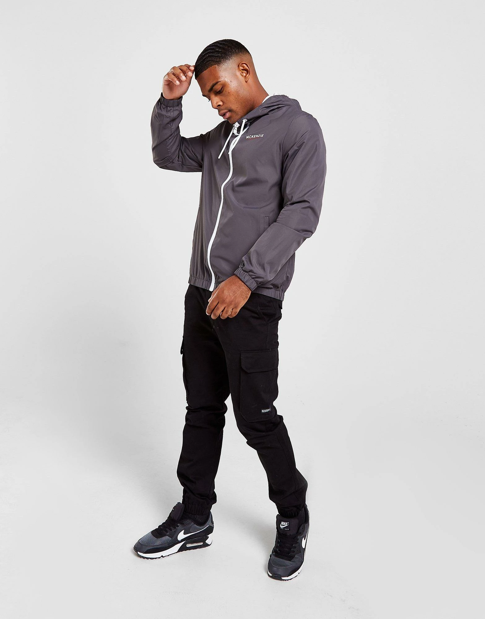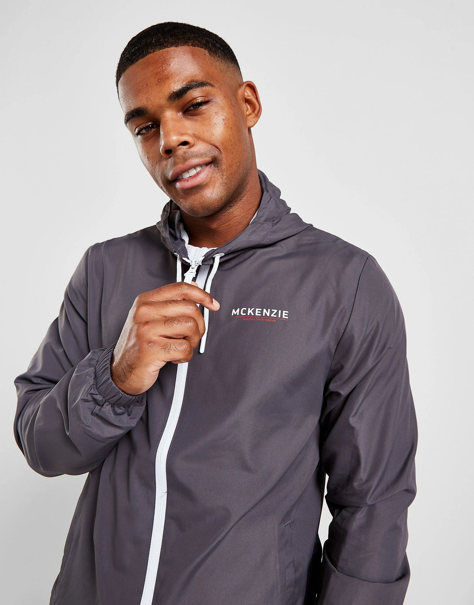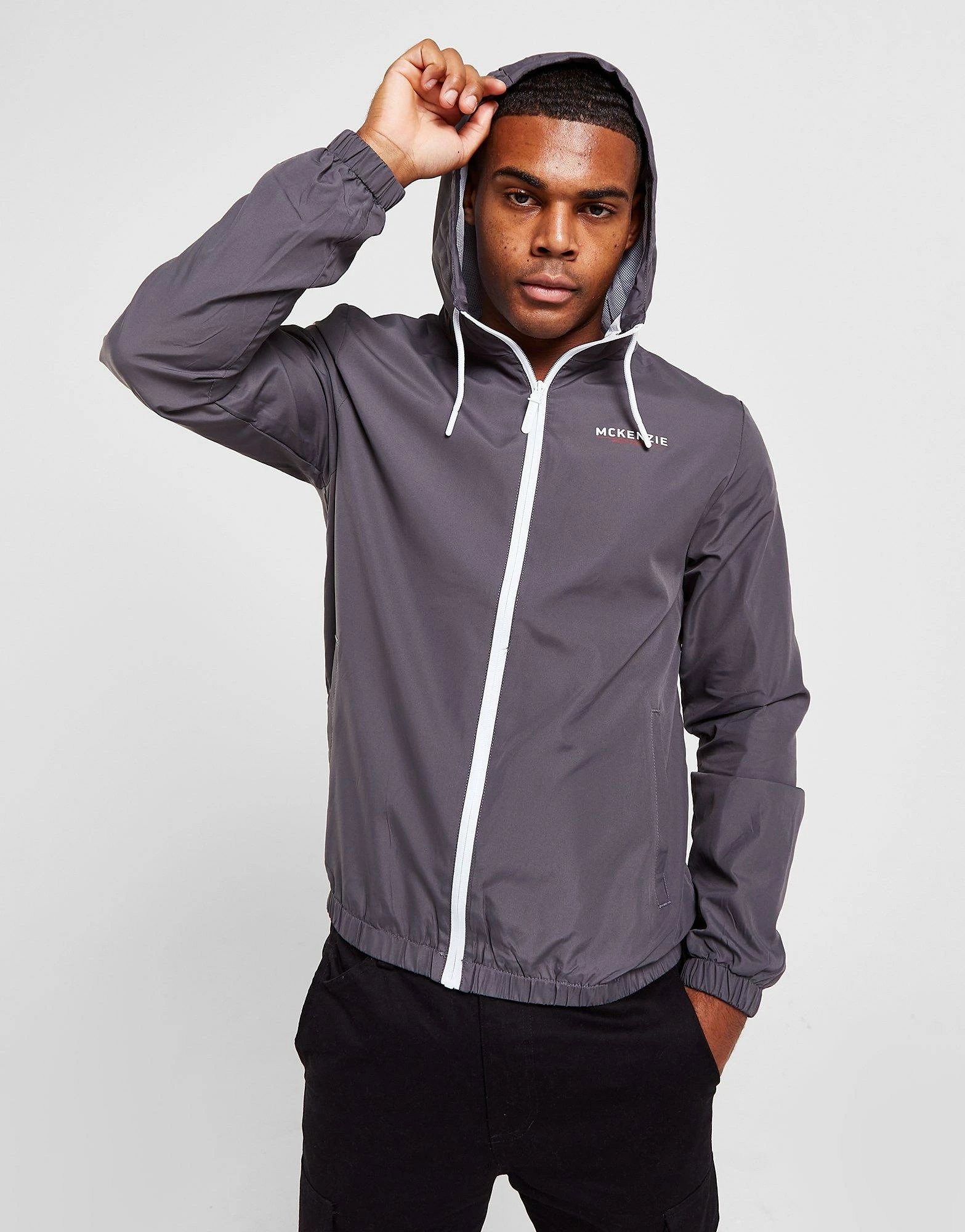 Keep covered in this men’s Essential Full Zip Windbreaker Jacket from McKenzie. Exclusive, this standard-fit jacket is made from durable yet lightweight poly fabric. It comes in a Grey colourway, and features a breathable mesh lining, full zip fastening and an adjustable hood for extra coverage. With elasticated trims to optimise the fit, this jacket is finished with two side pockets and signature McKenzie branding to the chest. Machine washable. | Our model is 6’0″ with a 38.5″ chest and wears a size medium._