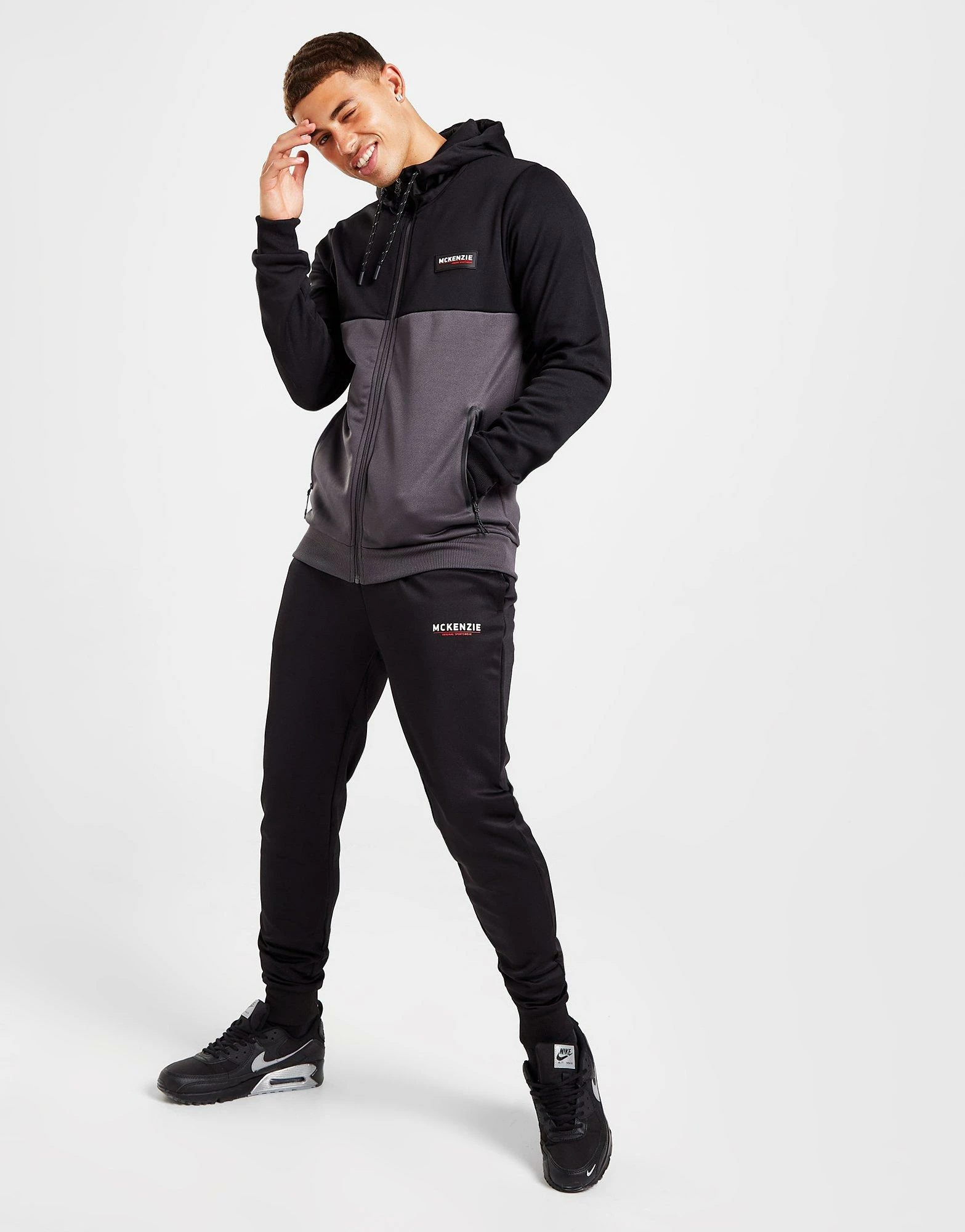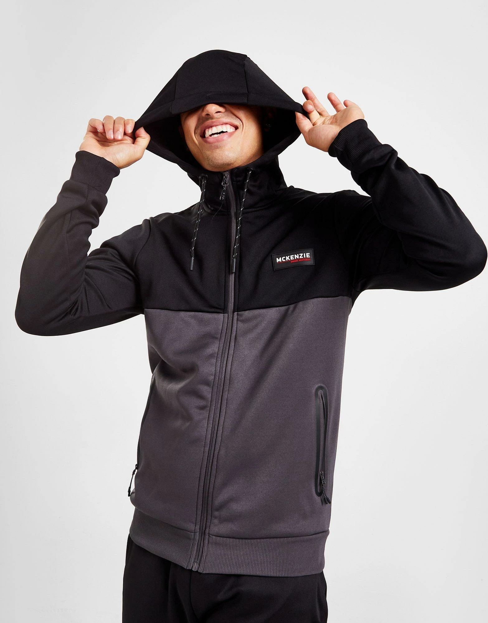 Layer up from the gym sesh to the streets in this men’s Poly Tech Colour Block Full Zip Hoodie from McKenzie. In a Black and Blackened Pearl colour block design, this standard-fit hoodie is made with smooth, durable poly fabric for lasting wear. It features a full-length zipper with a high-cut collar and an adjustable hood for custom coverage, while stretchy ribbed trims secure the shape. With front zip pockets for easy storage, it’s finished up with signature McKenzie branding at the chest. Machine washable. | Our model is 5’11” with a 38″ chest and wears a size medium.