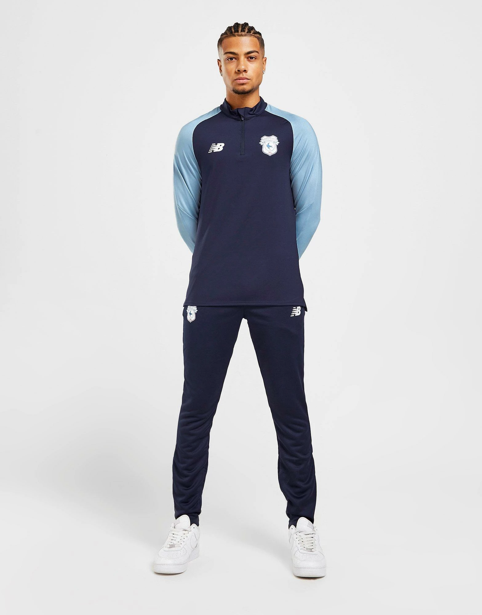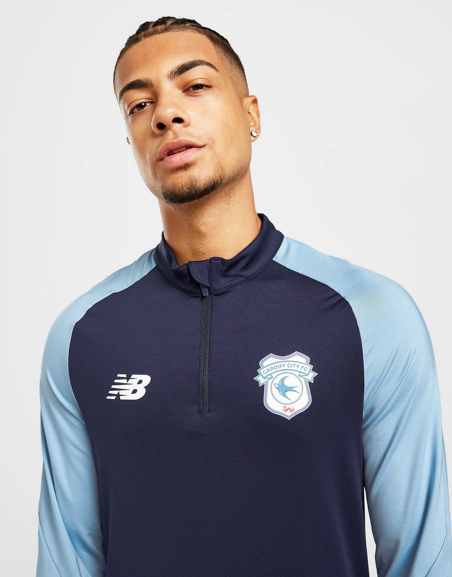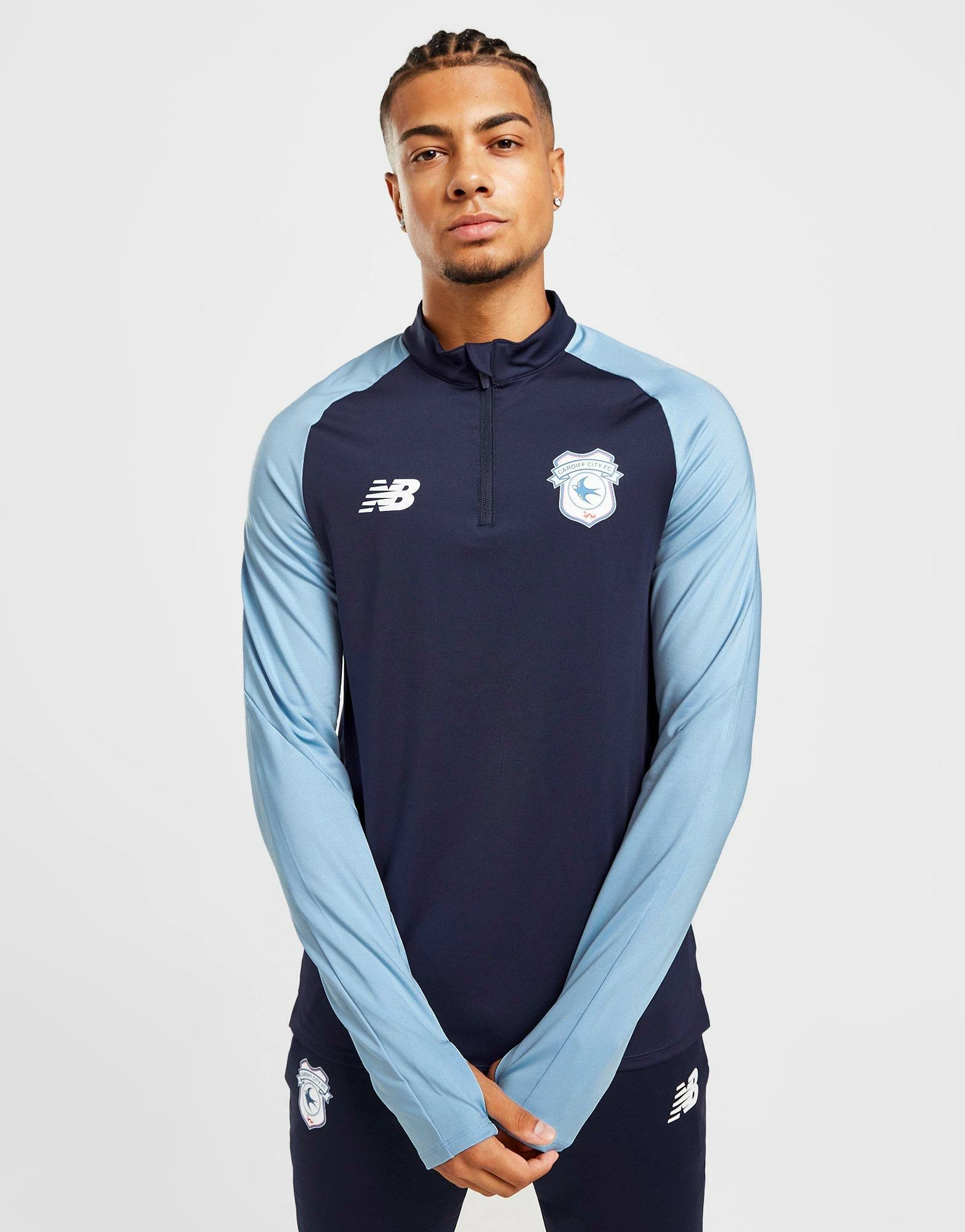 Gear up for the pitch like the pros in this men’s Cardiff City FC Training 1/4 Zip Top from New Balance. Coming in a Navy and Sky Blue colourway, this training top is made with smooth, lightweight poly fabric for essential comfort. Crafted with sweat-wicking NB DRY tech, it features a quarter zip closure and a raised collar to adjust your airflow. It has long, raglan-cut sleeves for maximum movement, while thumb loops deliver a secure, streamlined fit. Finished up with New Balance branding to the chest, and the iconic Cardiff City FC crest to sign off. Machine washable. | Our model is 6’0″ with a 38″ chest and wears a size medium.