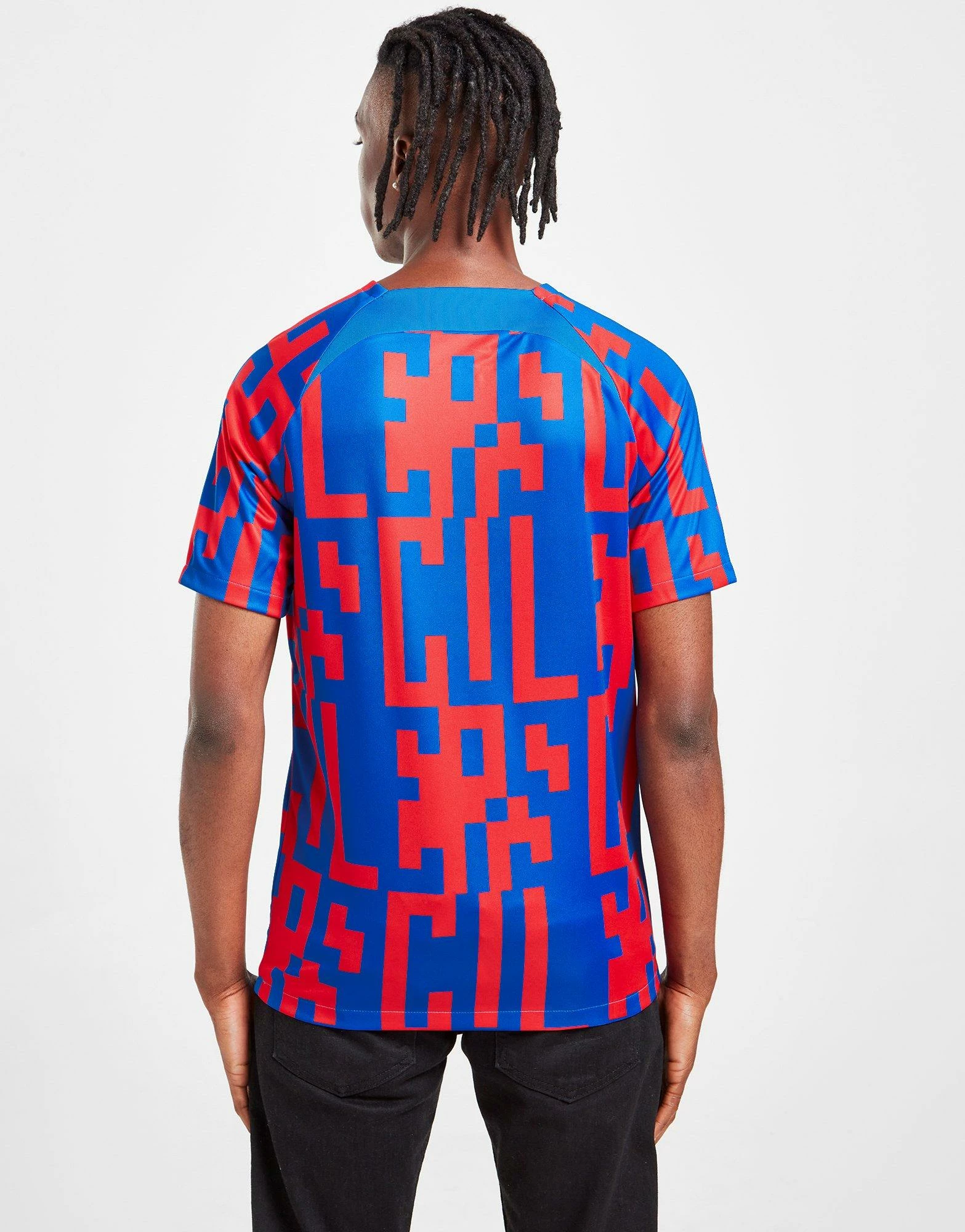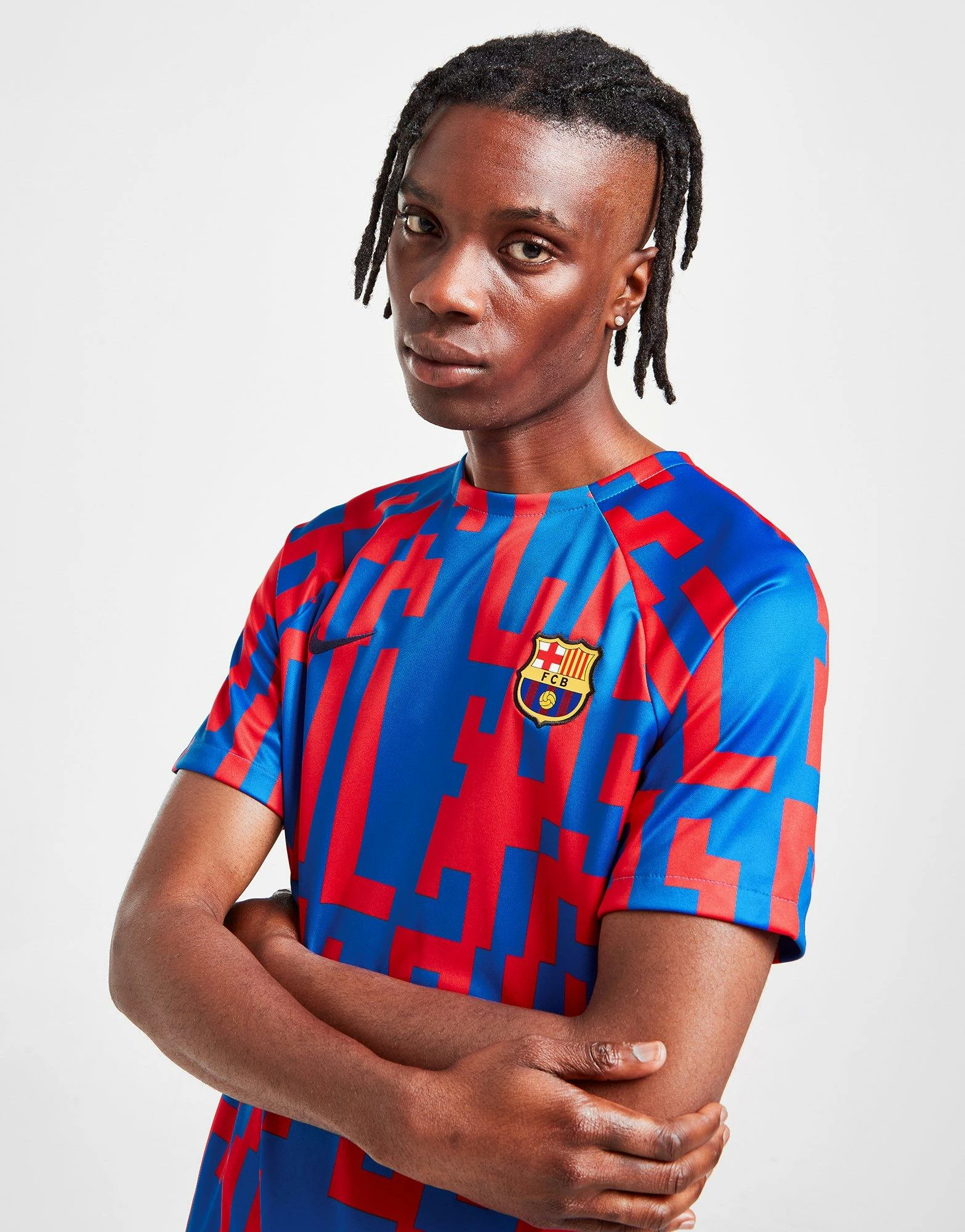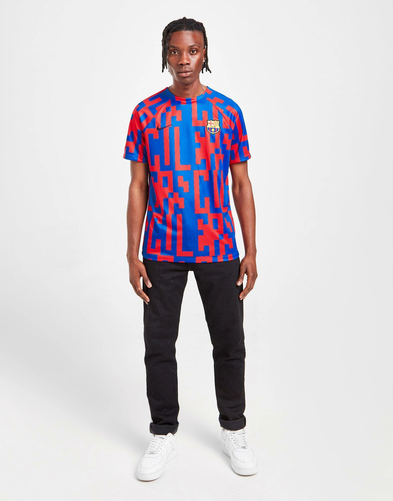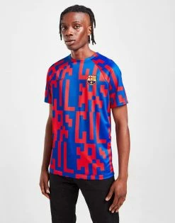 Train like the pros in this men’s FC Barceolna Pre Match Shirt from Nike. In the club’s iconic Blue and Red colourway with a bold all-over print, this standard-fit tee is made with ultra-smooth, lightweight poly fabric for essential comfort. It has a crew neckline and short, raglan-cut sleeves for maximum movement, with Nike’s sweat-wicking Dri-FIT technology for cool wear. Finished up with Barca’s iconic crest at the chest, alongside Nike’s signature Swoosh logo. Machine washable. | Our model is 6’0″ with a 35″ chest and wears a size medium.