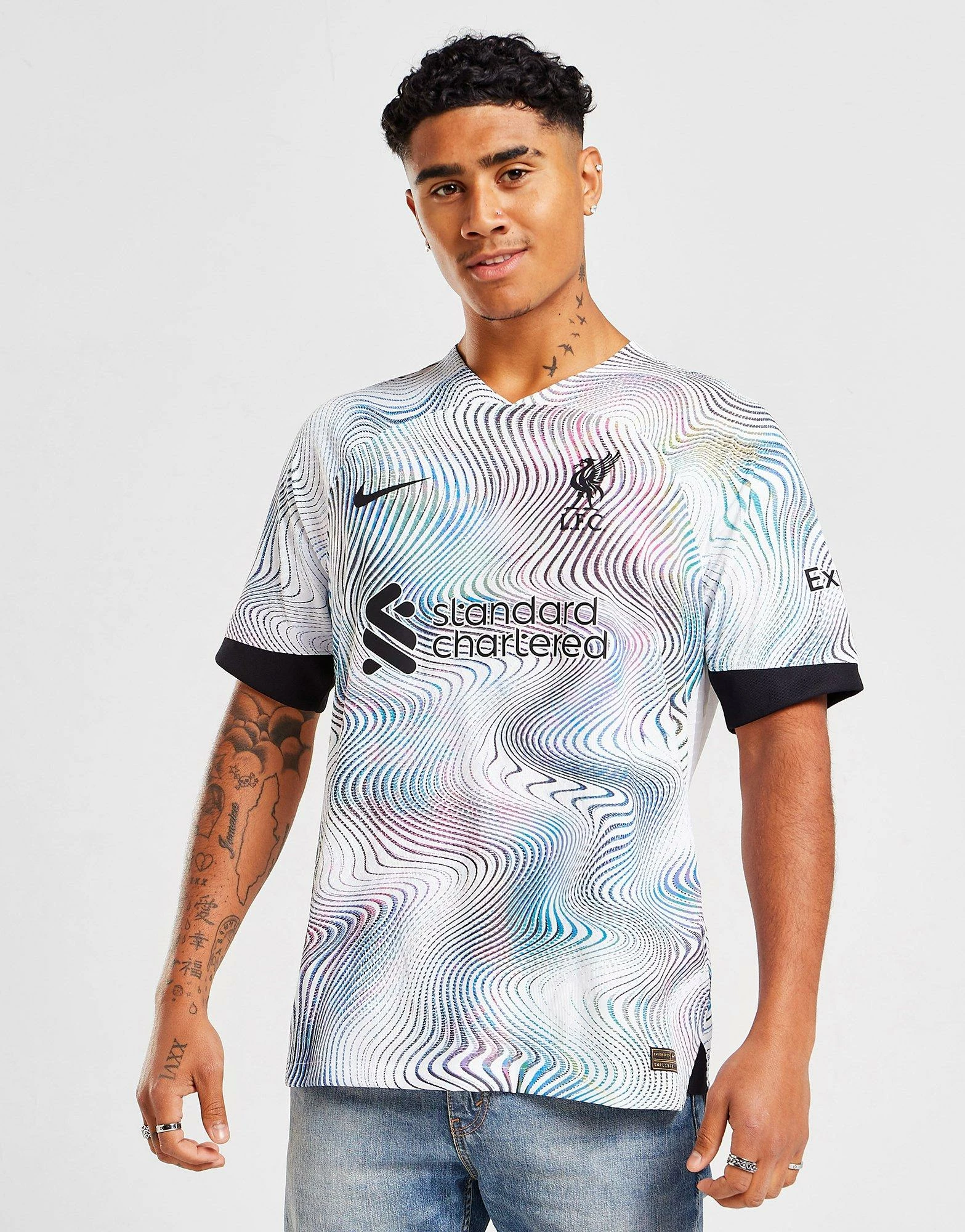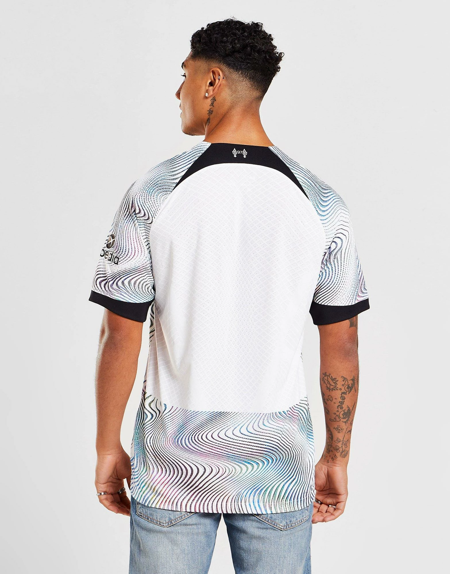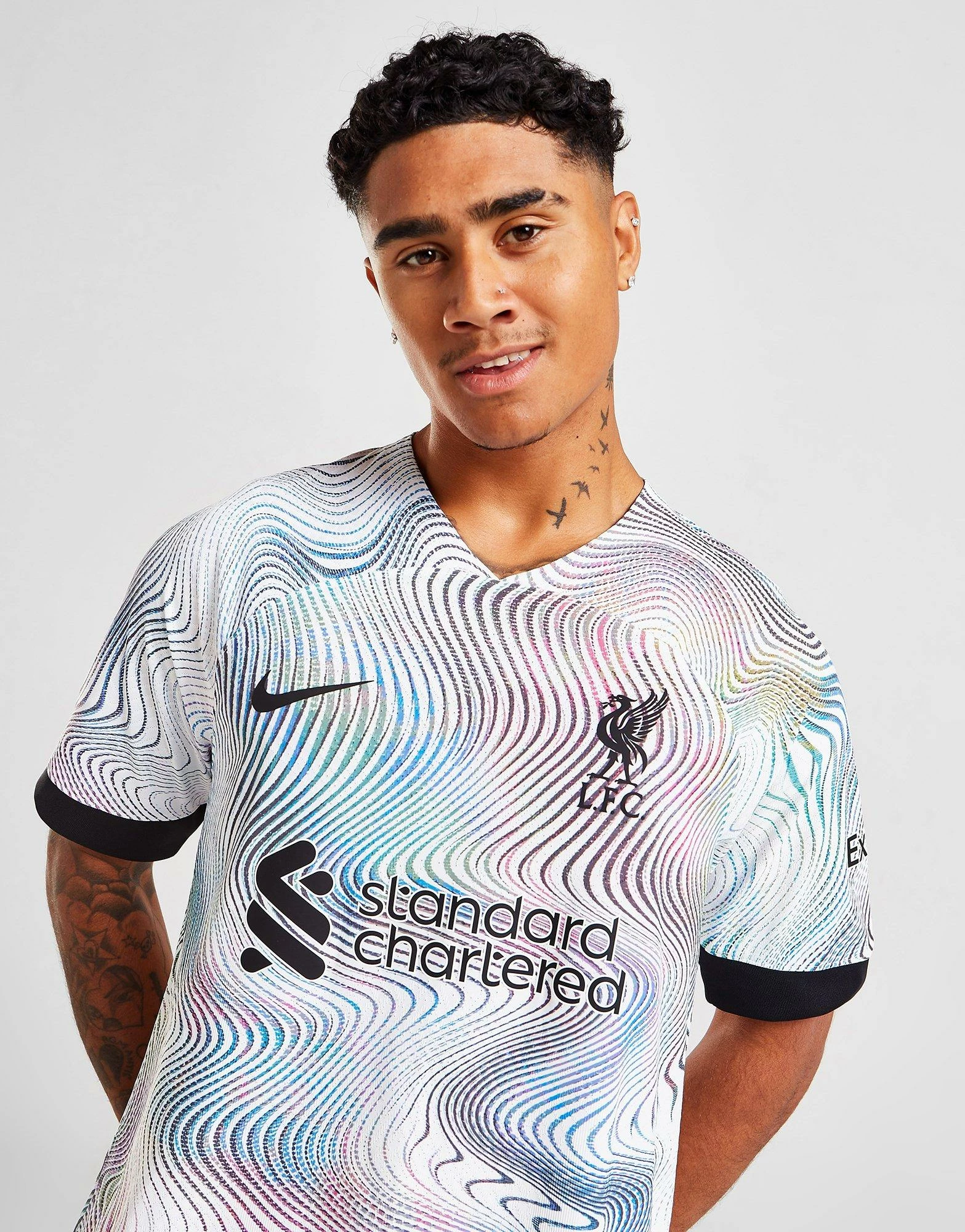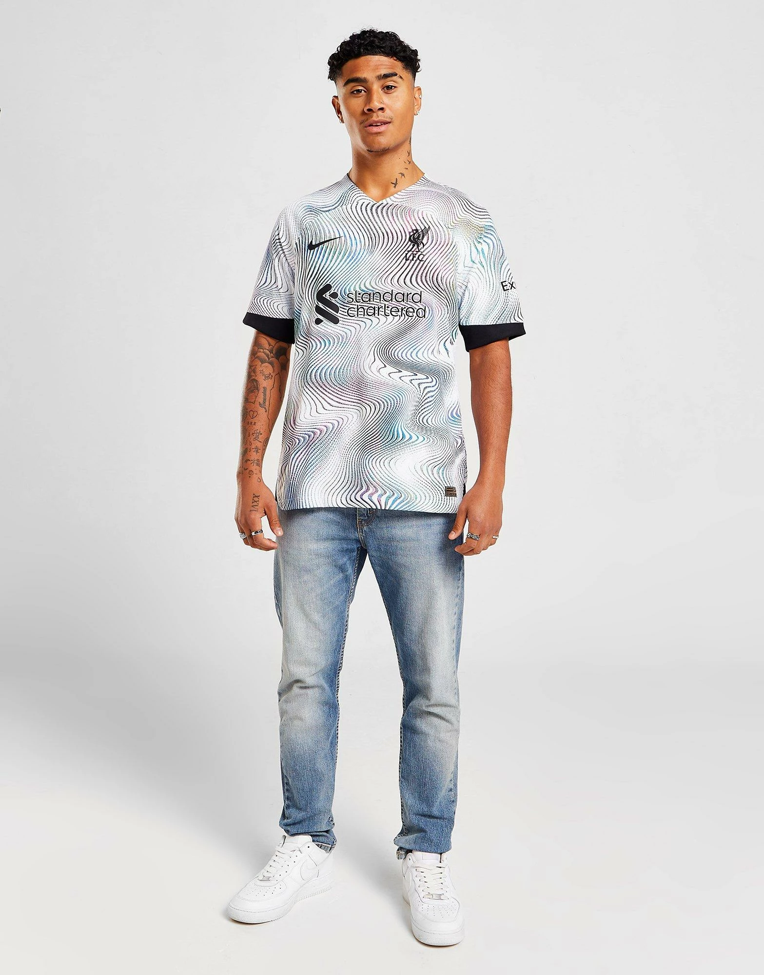 Level up your support on away days with this men’s Liverpool FC 2022/23 Away Shirt from Nike. Landing in a White colourway with a bold, all-over pattern inspired by the city’s music scene, this standard-fit shirt is made with smooth, lightweight poly fabric for lasting comfort. Crafted with sweat-wicking Dri-FIT tech, it feautres a V neckline and short sleeves for a game-ready look, and contrasting Black cuffs. Finished up with sponsorship branding and Nike’s iconic Swoosh to the chest, with the signature Liverpool crest to highlight your pride. Machine washable. | Our model is 5’11” with a 38″ chest and wears a size medium.