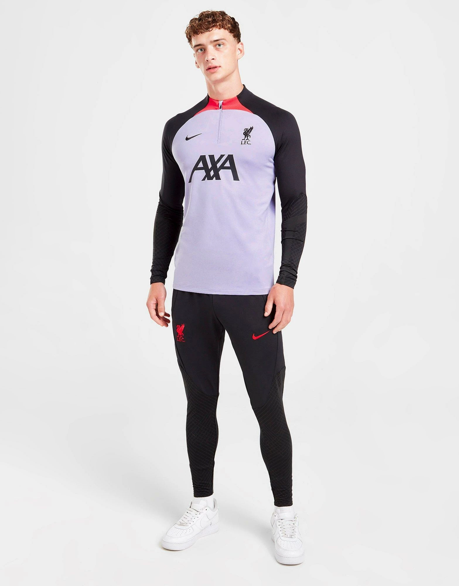 Hit the pitch in this men’s Liverpool FC Strike Drill Top from Nike. In a Purple Dawn colourway, this slim-fit training top is made from smooth and stretchy poly fabric. It has Dri-FIT tech to wick away sweat, and features an overhead design with a quarter zip fastening and long raglan sleeves. With invisible thumb loops to the cuffs for a stay-put fit, this top is finished up with the iconic Swoosh logo and Liverpool FC crest to the chest. Machine washable. | Our model is 6’2″ with a 39″ chest and wears a size medium.