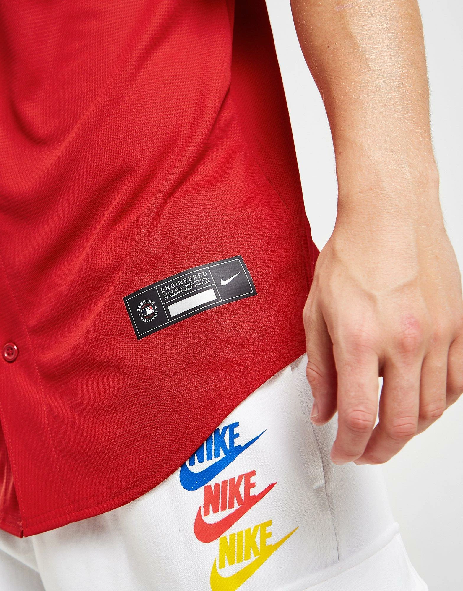 Rep your team in this men’s MLB Boston Red Sox Alternate Jersey from Nike. Coming in a Red colourway, this standard-fit jersey is cut from smooth, lightweight poly for essential comfort. It features short sleeves with a full-length button placket for a classic look, and a curved hem to keep you covered. Finished up with a ‘Red Sox’ wordmark across the front, and signature Swoosh branding at the chest. Machine washable. | Our model is 6’0″ with a 37″ chest and wears a size medium.