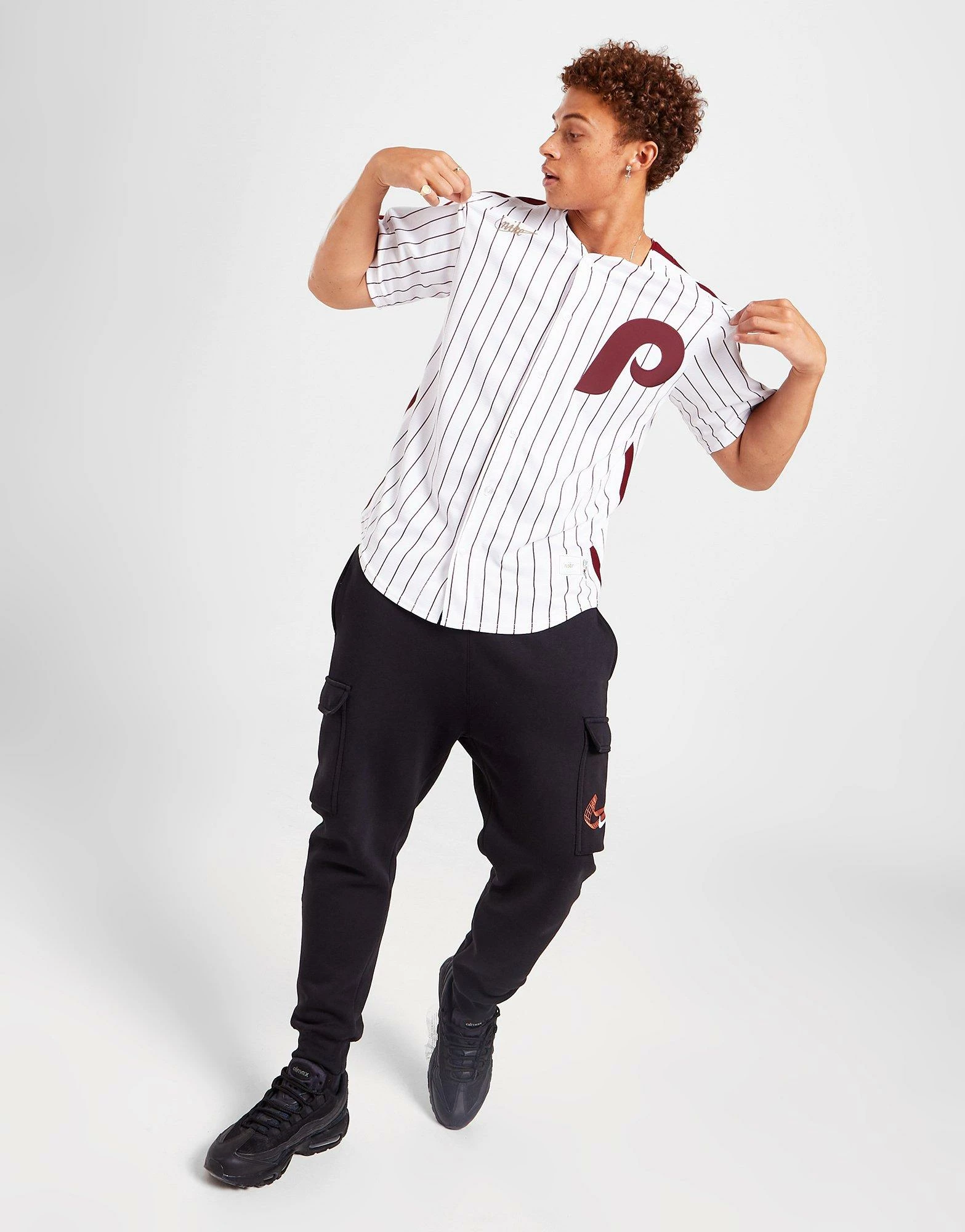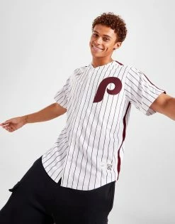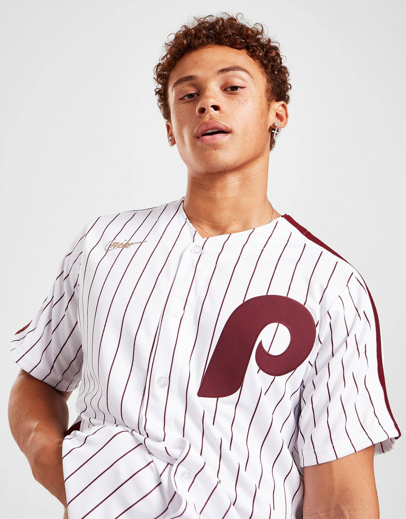 Level up your game-day looks with this men’s MLB Philadelphia Phillies Cooperstown Jersey from Nike. In a White colourway with Maroon pinstripes, this laid-back shirt has a button-up front, short sleeves and an extended hem for custom coverage. It’s made from smooth, lightweight poly fabric, with sweat-wicking tech for cool comfort. Finished off with the iconic Phillies badge, MLB branding and the iconic Swoosh logo. Machine washable. | Our model is 6’1″ with a 40″ chest and wears a size medium.