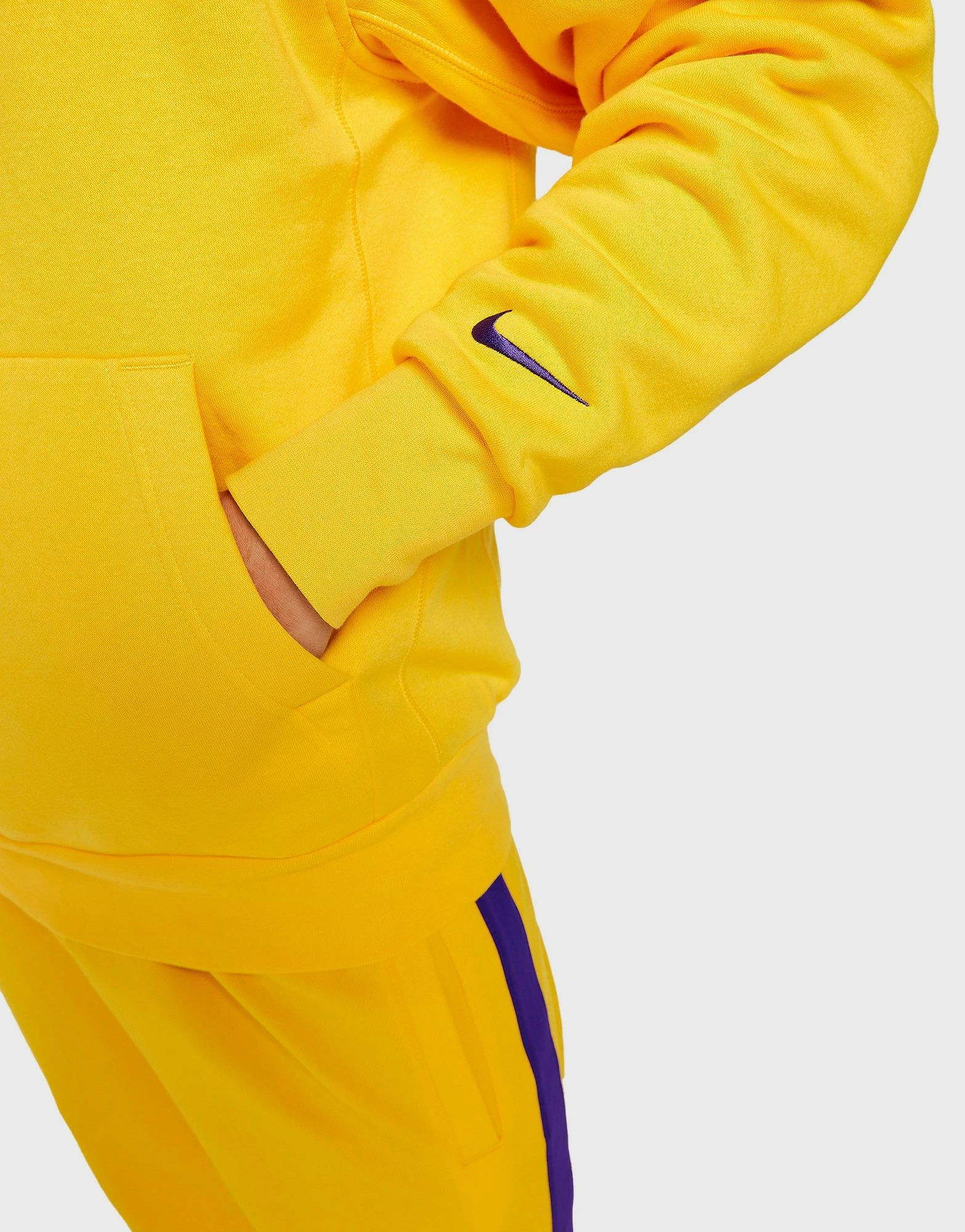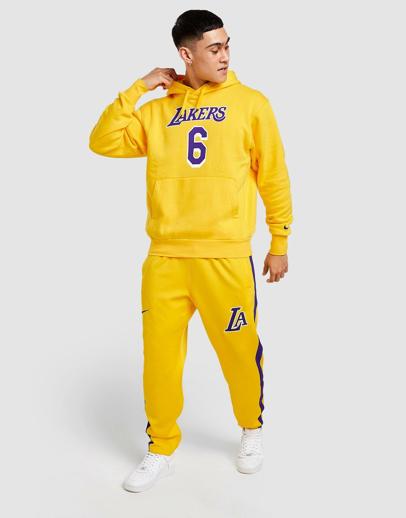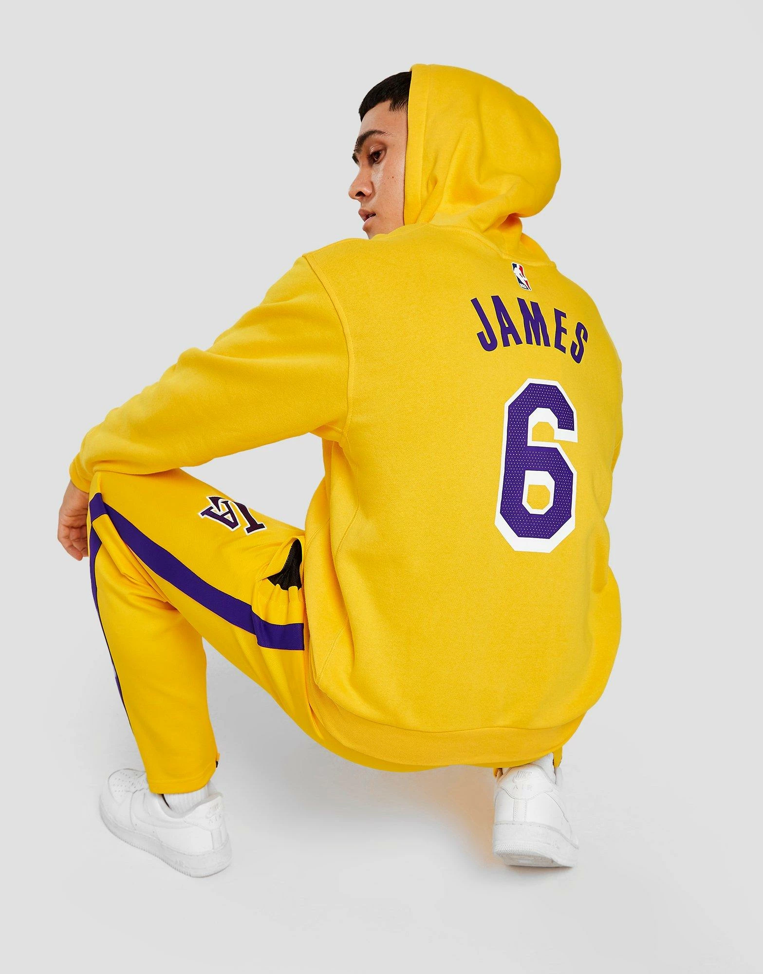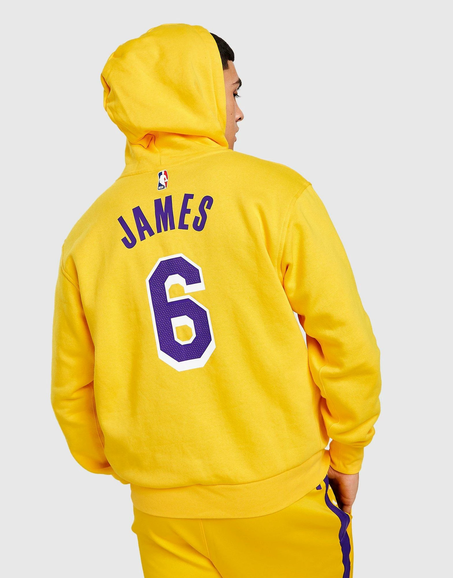 Layer up and show your support with this men’s NBA Los Angeles Lakers Pullover James #6 Hoodie from Nike. In an Amarillo Yellow colourway, this loose-fitting hoodie is made from super-soft, fleecey fabric for next level comfort. In a classic pullover design, this hoodie features an adjustable hood for custom coverage, with long sleeves and ribbed trims for a secure fit. It has a kangaroo pouch for your essentials and is finished up with a Swoosh to the sleeve, Lakers branding to the chest, with James #6 to the back. Machine washable | Our model is 6’0″ with a 40″ chest and wears a size medium.