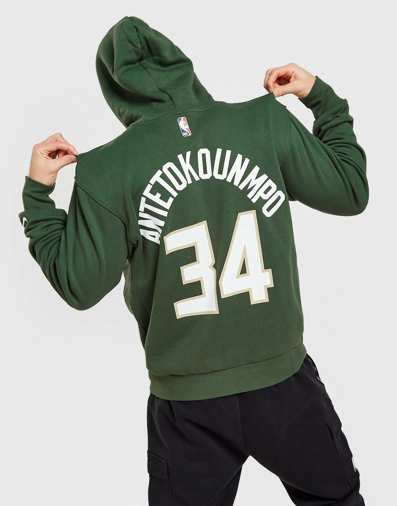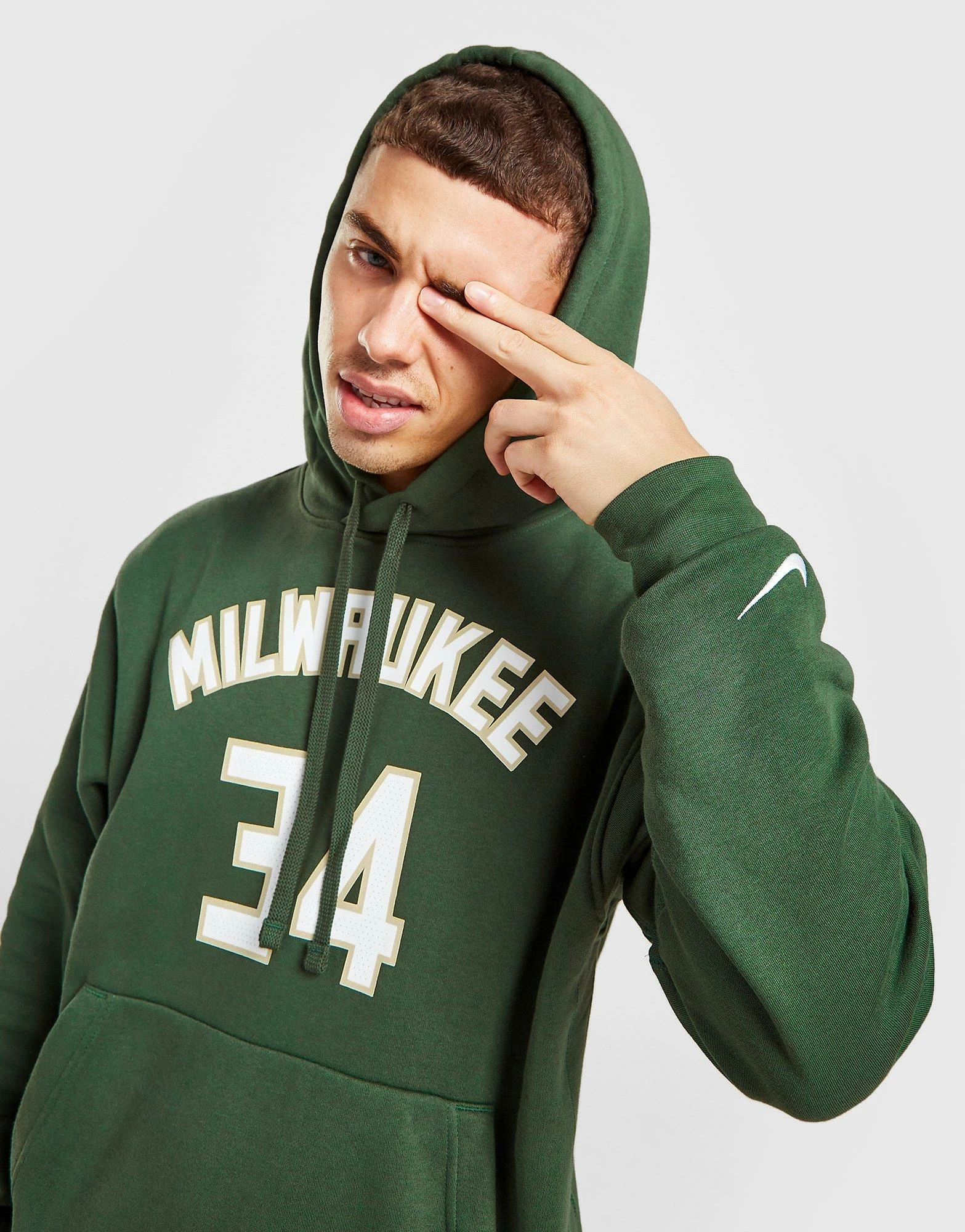 Grab a pro-inspired look and hit the courts with this men’s NBA Milwaukee Bucks Giannis #34 Hoodie from Nike. In a classic Fir Green colourway, this relaxed-fit pullover is made from an ultra-soft cotton fleece blend for total comfort. It features a drawcord hood for custom coverage, as well as ribbed detailing to the cuffs and hem. With a Kangaroo pocket, this hoodie is finished with a Swoosh logo to the sleeve, the NBA badge to the nape and Giannis #34 branding to the front and back. Machine washable. | Our model is 5’11” with a 38″ chest and wears a size medium.