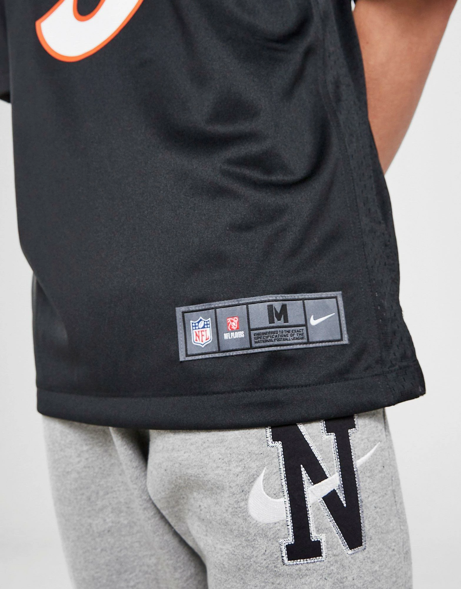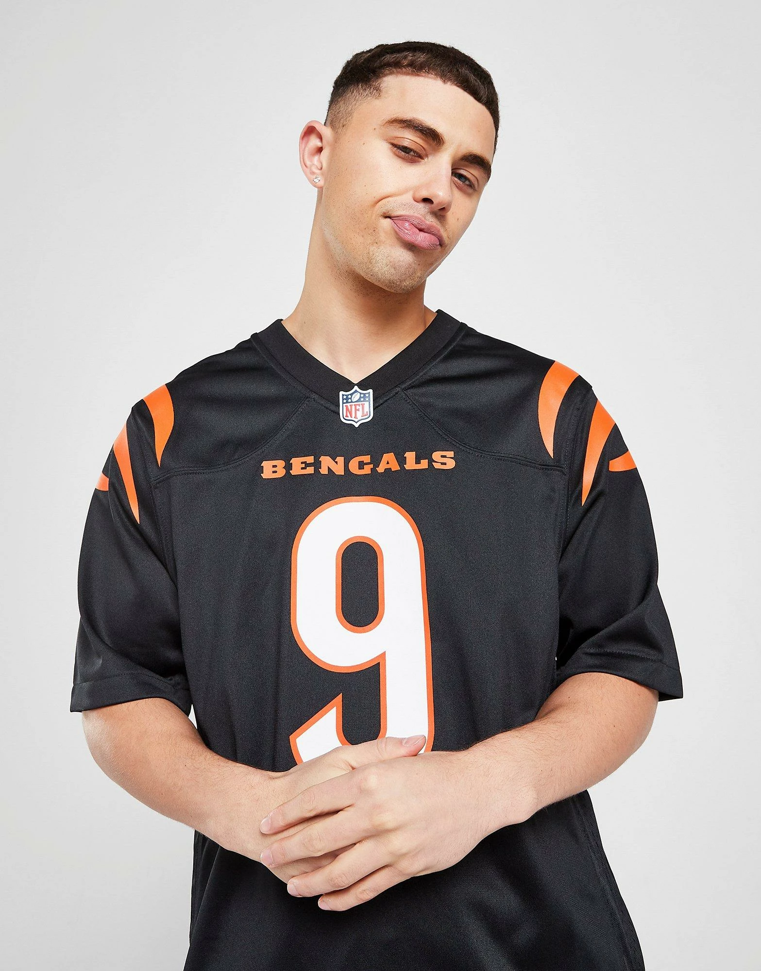 Rep your fave player’s number with this men’s NFL Cincinnati Bengals Burrow #9 Jersey from Nike. In a black colourway with orange stripes to the shoulders, this relaxed-fit jersey is made from lightweight poly-knit fabric with mesh panels for cool comfort. It features a ribbed V-neckline, short sleeves and cut-outs to the hem for unrestricted movement. This top is finished off with signature NFL and Swoosh logos, as well as Bengals #9 branding to the chest and back. Machine washable. | Our model is 5’11” with a 39″ chest and wears a size medium.