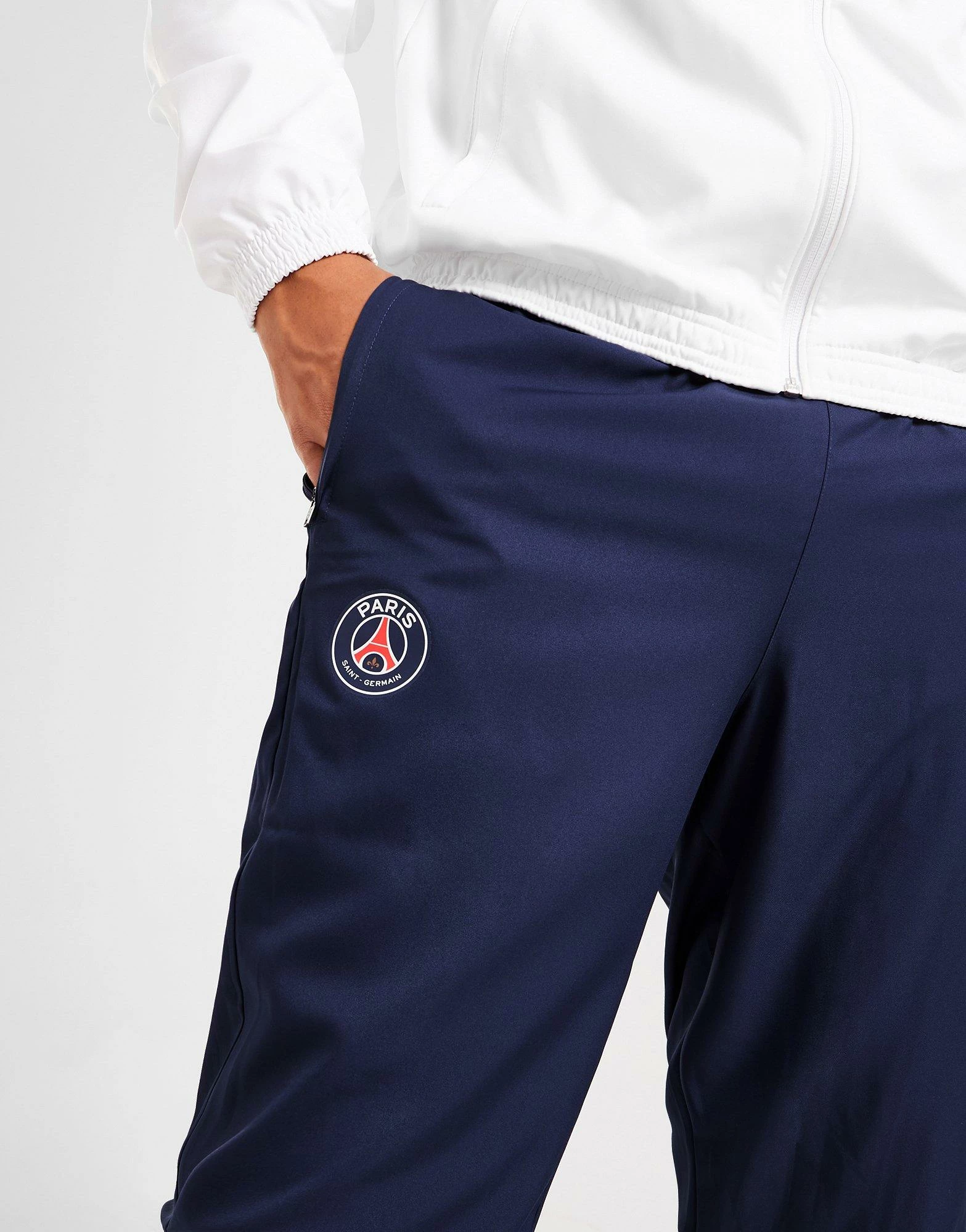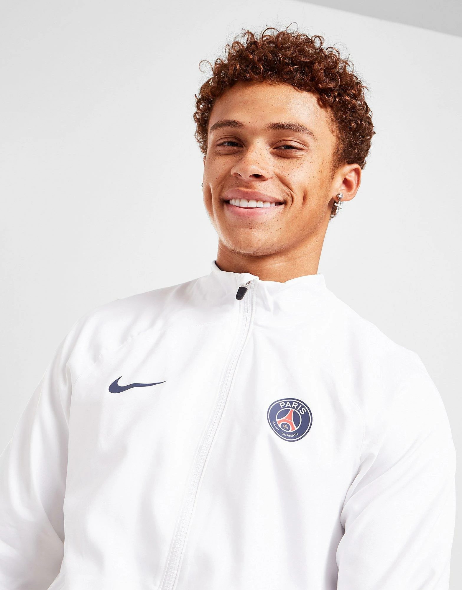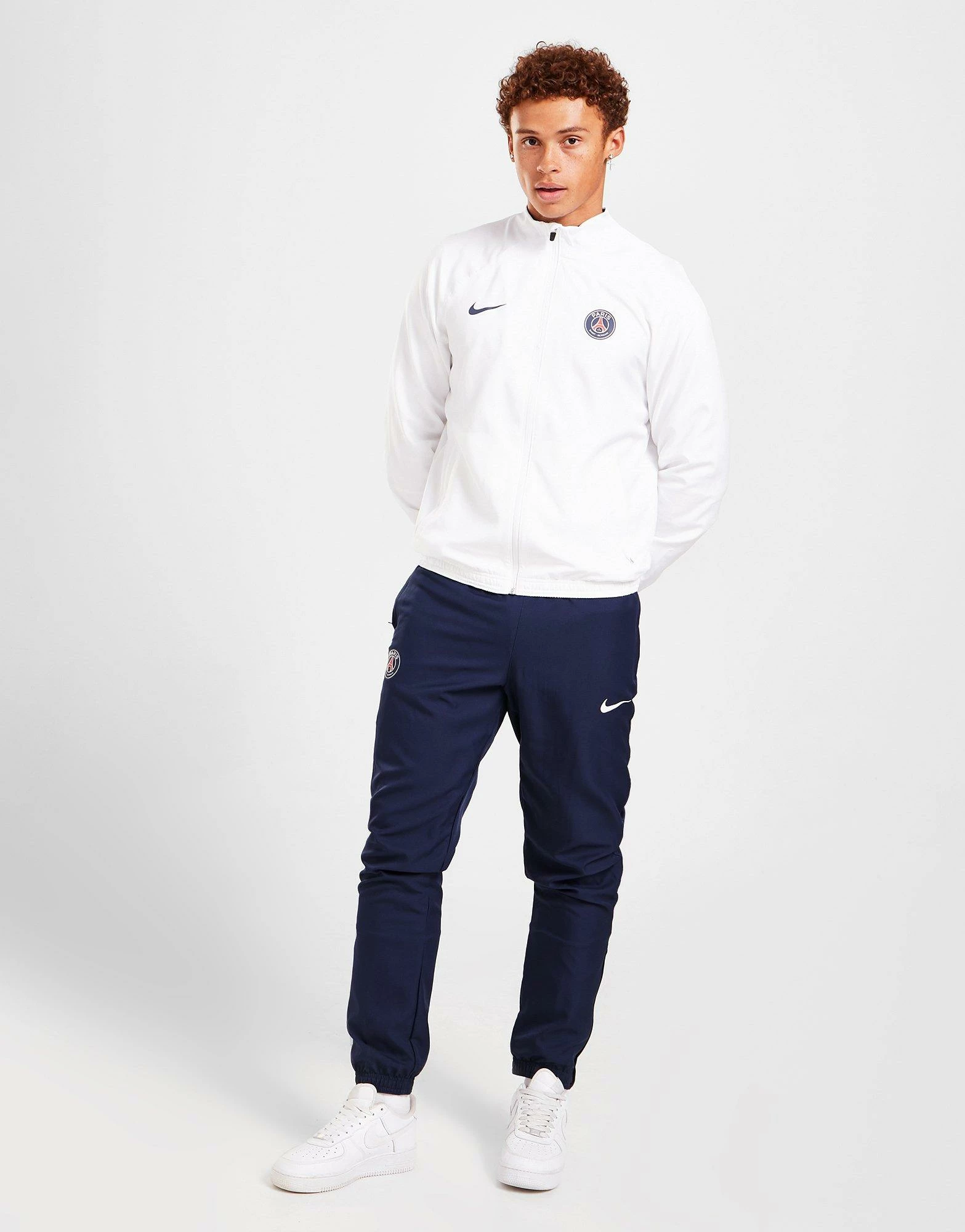 Raise your game with this men’s Paris Saint Germain Strike Tracksuit from Nike. In a White and Midnight Navy colourway, this standard-fit suit is made from at least 75% recycled poly fibres for a lightweight, sweat-wicking feel. The set has a full-zip top with a raised neckline, raglan sleeves and elasticated trims. While the contrasting pants have a drawcord-adjustable waistband and zippered ankles for custom comfort. With zippered side pockets, this ‘fit is finished off with signature Swoosh logos and the classic PSG crest to the chest and thigh. Machine washable.