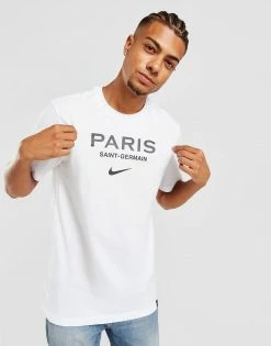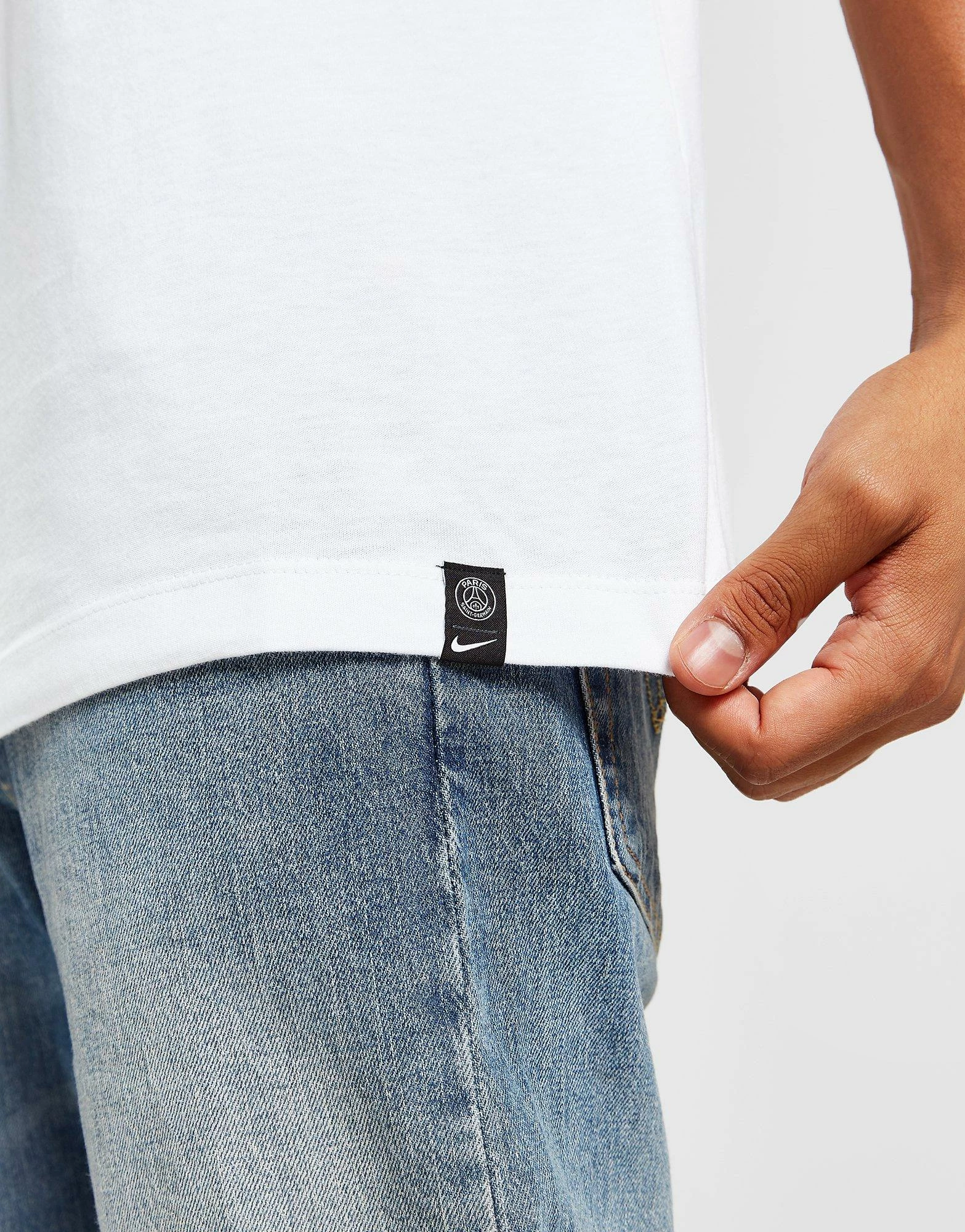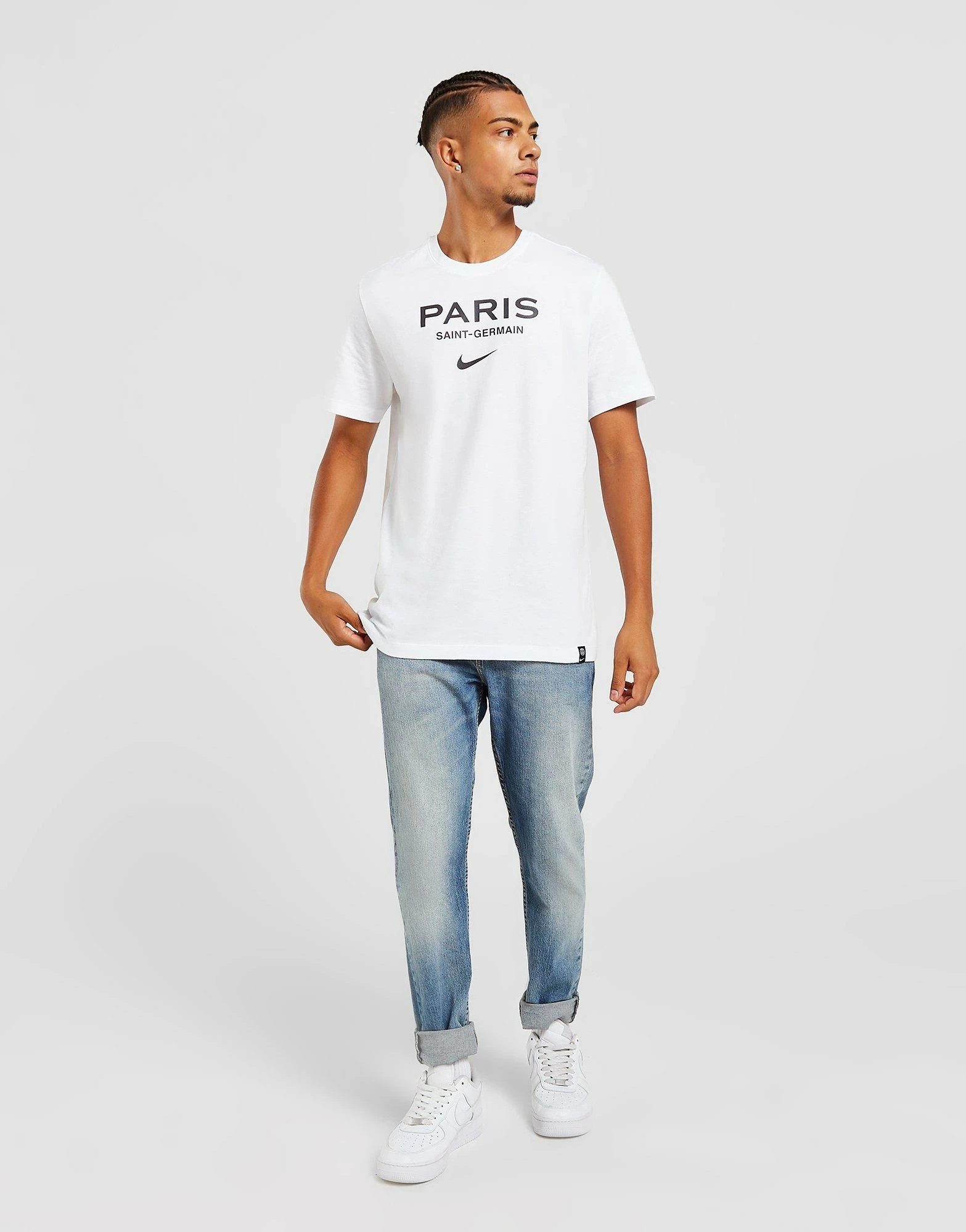 Level up your support for Les Parisiens with this men’s Paris Saint Germain Swoosh T-Shirt from Nike. In a White colourway, this tee is cut from soft cotton fabric for everyday comfort. It features short sleeves with a ribbed crew neckline and comes in a standard fit for a relaxed, easy wear. Finished up with a Nike Swoosh and PSG branding to the chest. Machine washable. | Our model is 6’0″ with a 38″ chest and wears a size medium.