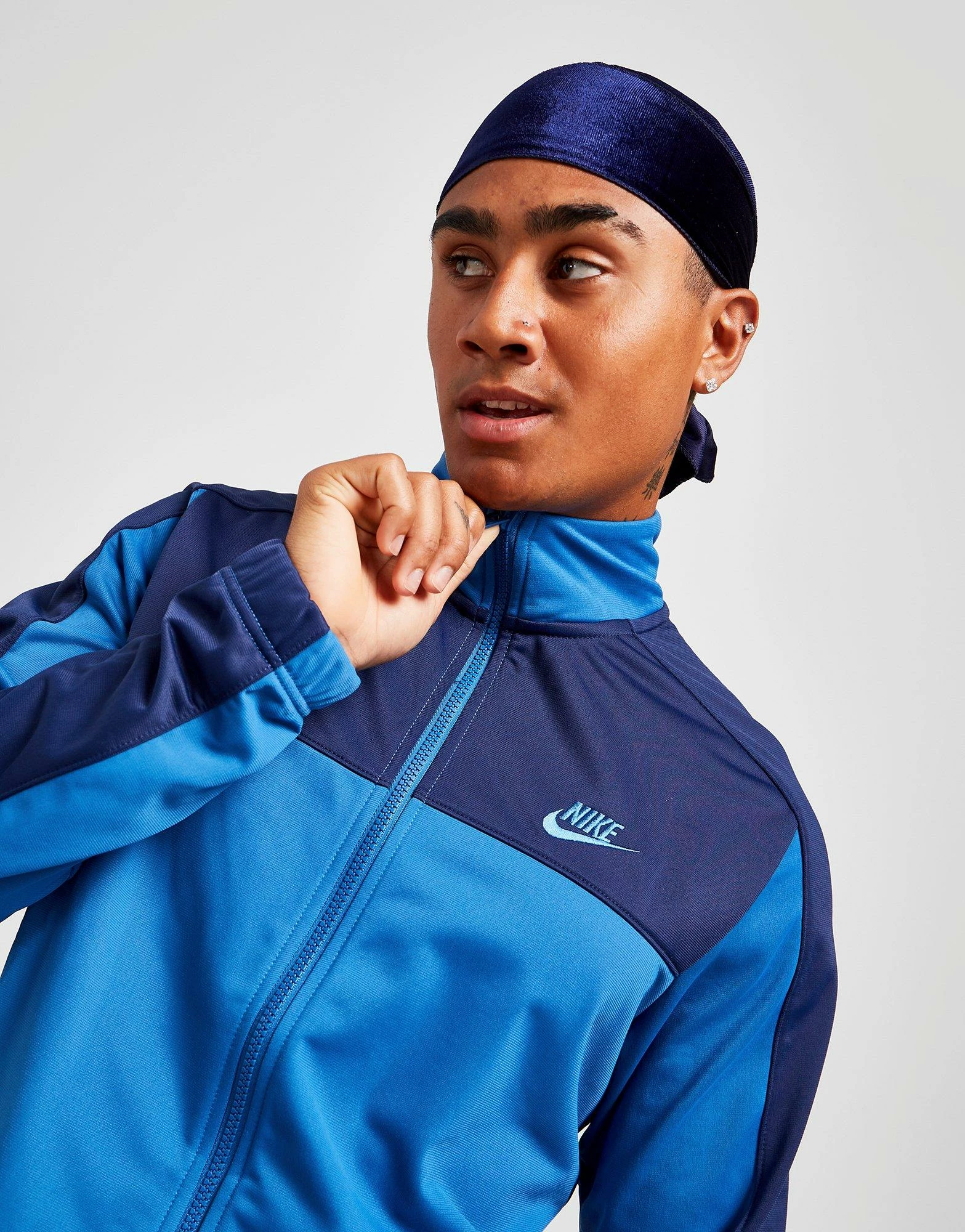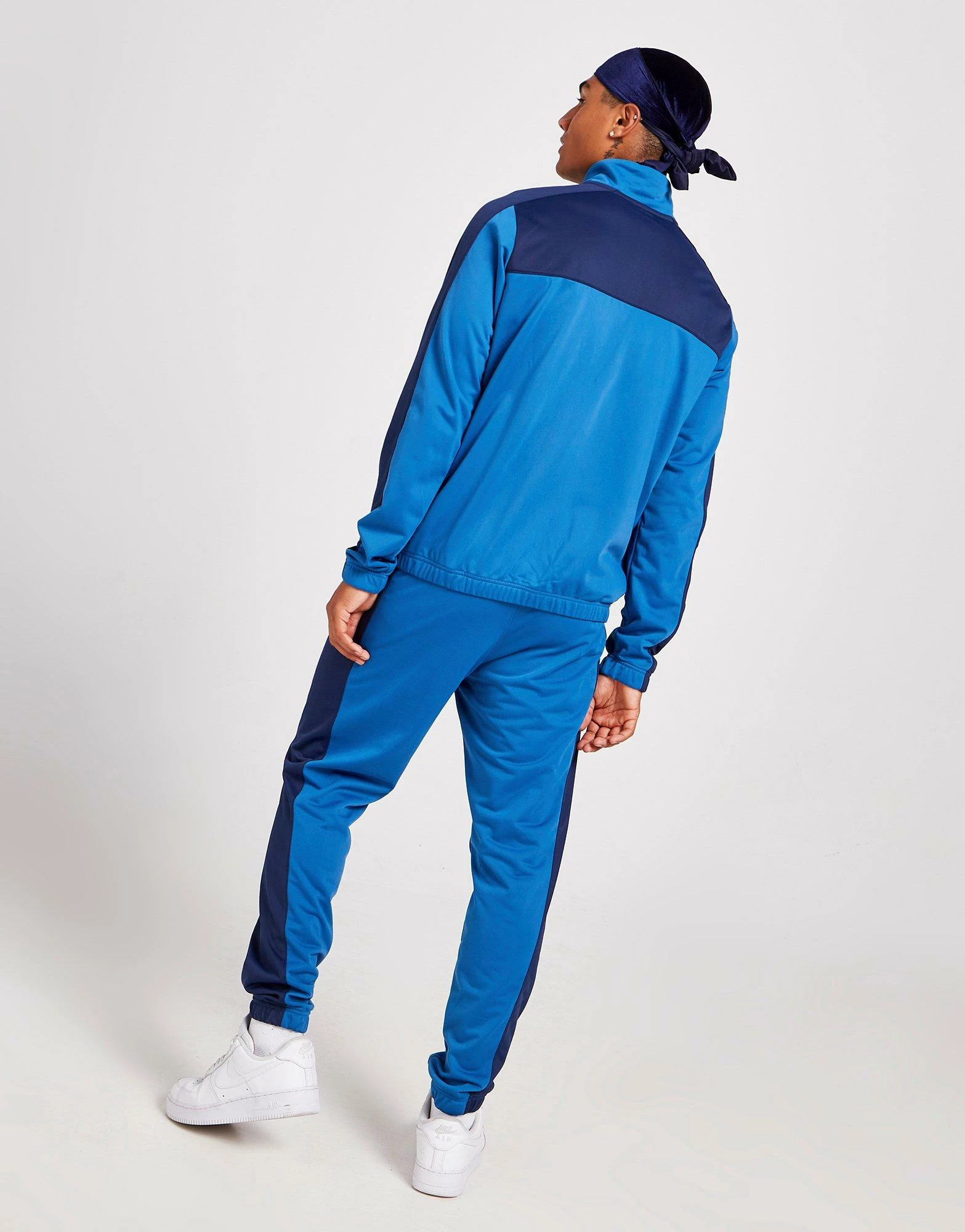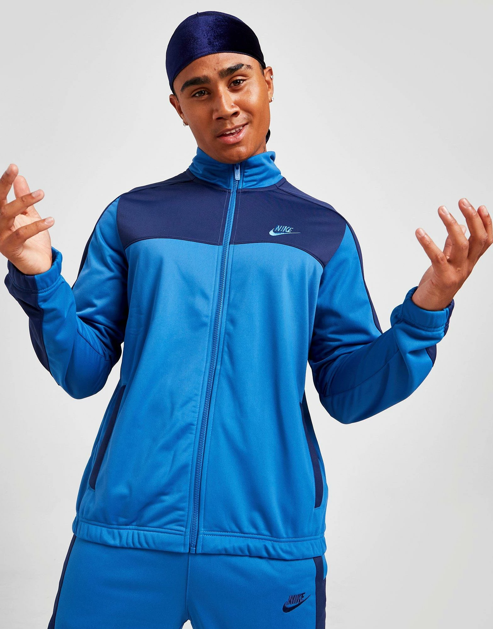Step to the streets in this men’s Polyknit Colour Block Tracksuit from Nike. Coming in a Dark Marina Blue colourway with tonal panels, it’s made with super-smooth polyknit fabric for supreme comfort. This ‘suit features a long-sleeve track top with a full-length zipper and a raised collar for custom coverage, and matching track pants with an adjustable elasticated waistband to customise the fit. It has pockets for easy storage, and elasticated trims to secure the shape. Finished up with signature Swoosh branding at the chest and thigh. Machine washable. | Our model is 5’11” with a 38″ chest and wears a size medium.