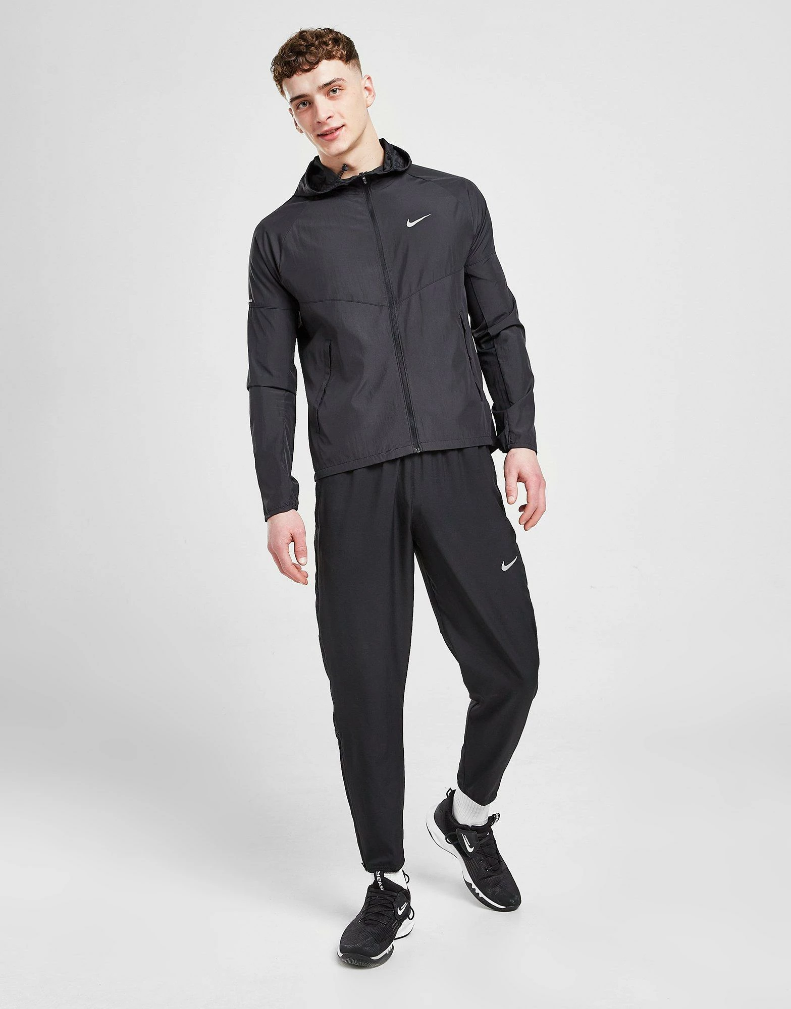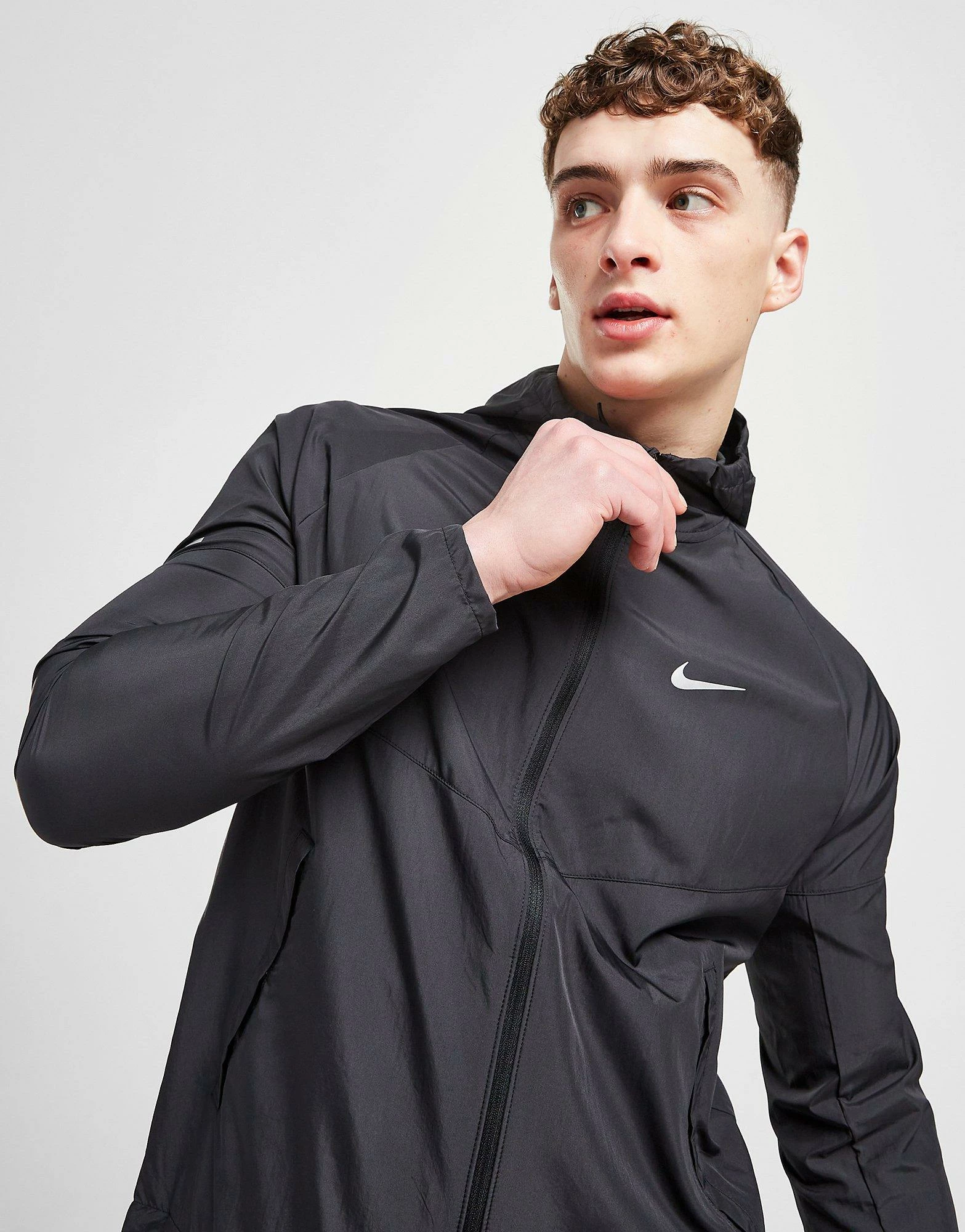 Level up your running essentials with this Repel Miler Jacket from Nike. Built to endure wet weather, it’s made with water-repellent woven poly fibres to help keep you dry when out training. In a Black colourway, this jacket features long sleeves and an adjustable hood with internal cords for premium coverage, with a full-length zip fastening to the front. Snap button pockets secure your gear, and this jacket can be packed into the side pocket for easy carrying on the move. Finished up with Nike’s iconic Chevron design at the front, with a reflective Swoosh to the chest. Machine washable. | Our model is 6’0″ with a 38.5″ chest and wears a size medium.