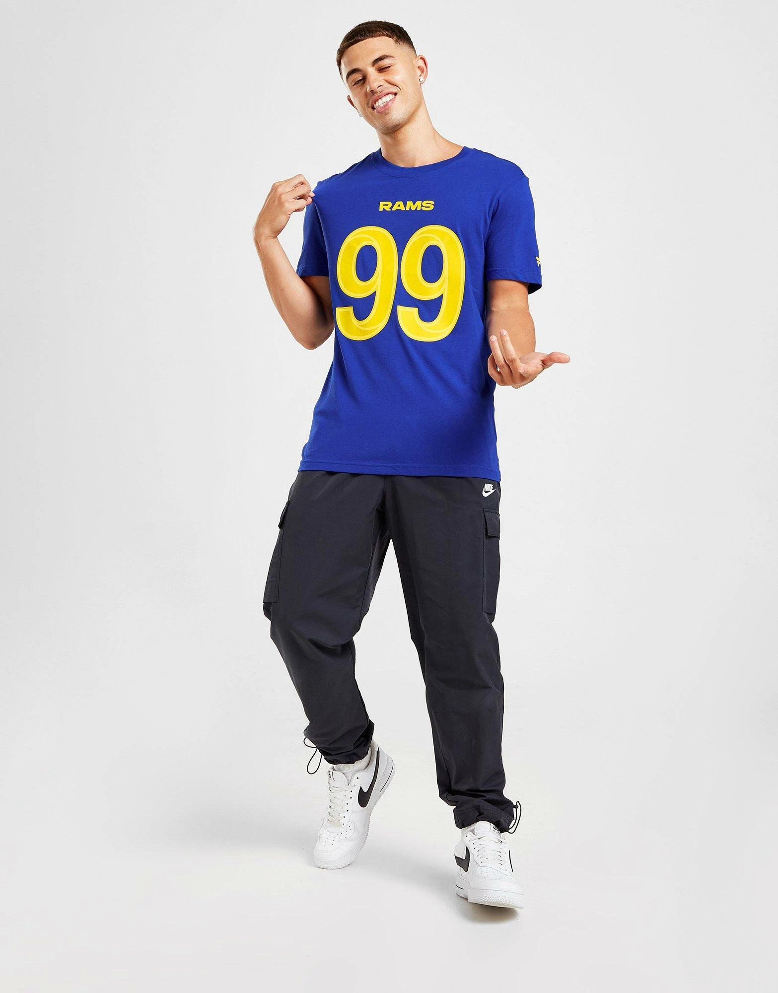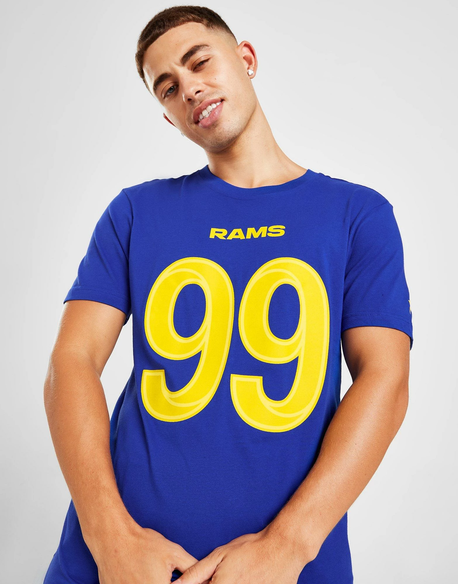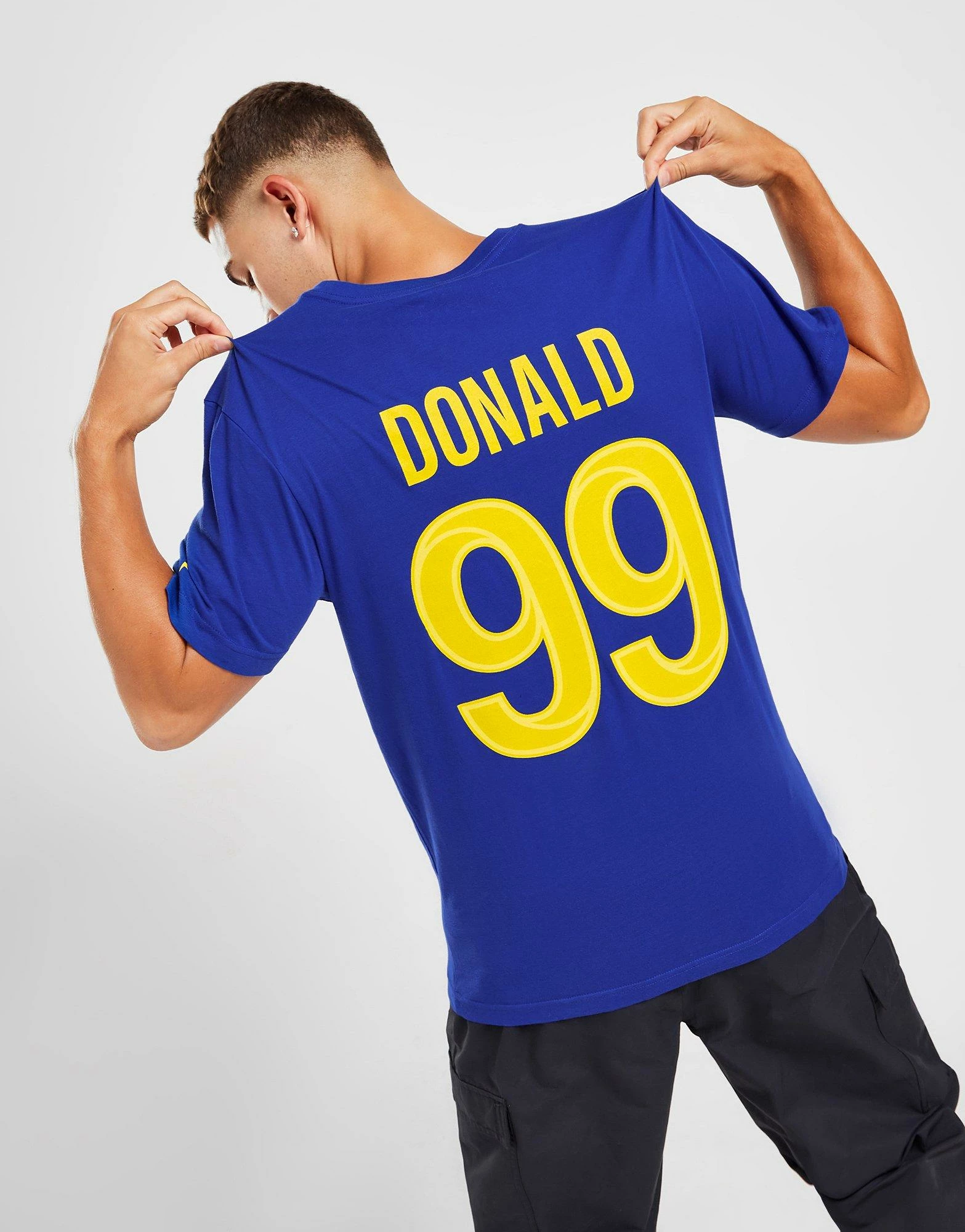 Cop a staple style that shows your support with this men’s NFL Los Angeles Rams Donald #99 T-Shirt from Official Team. Coming in a Blue colourway, this standard-fit tee is made with soft, lightweight cotton for lasting wear. Featuring a classic crew neckline and short sleeves, it’s finished up with Aaron Donaldson’s surname at the rear and a signature #99 at the front and back. Signed off with a Rams wordmark at the chest. Machine washable. | Our modelis 5’11” with a 38″ chest and wears a size medium.