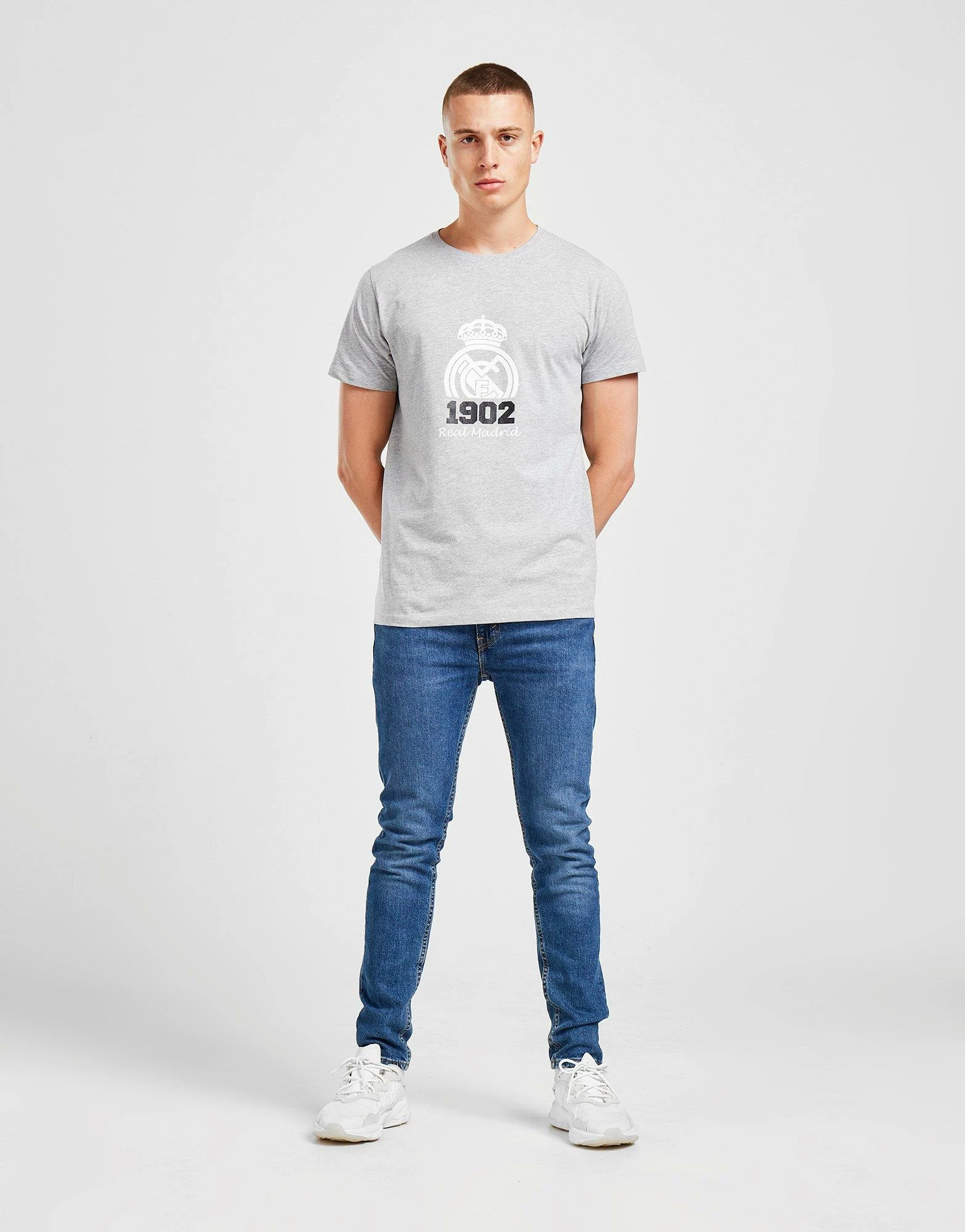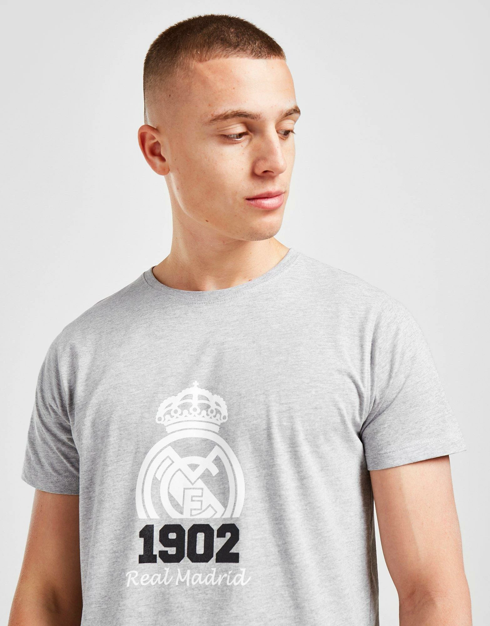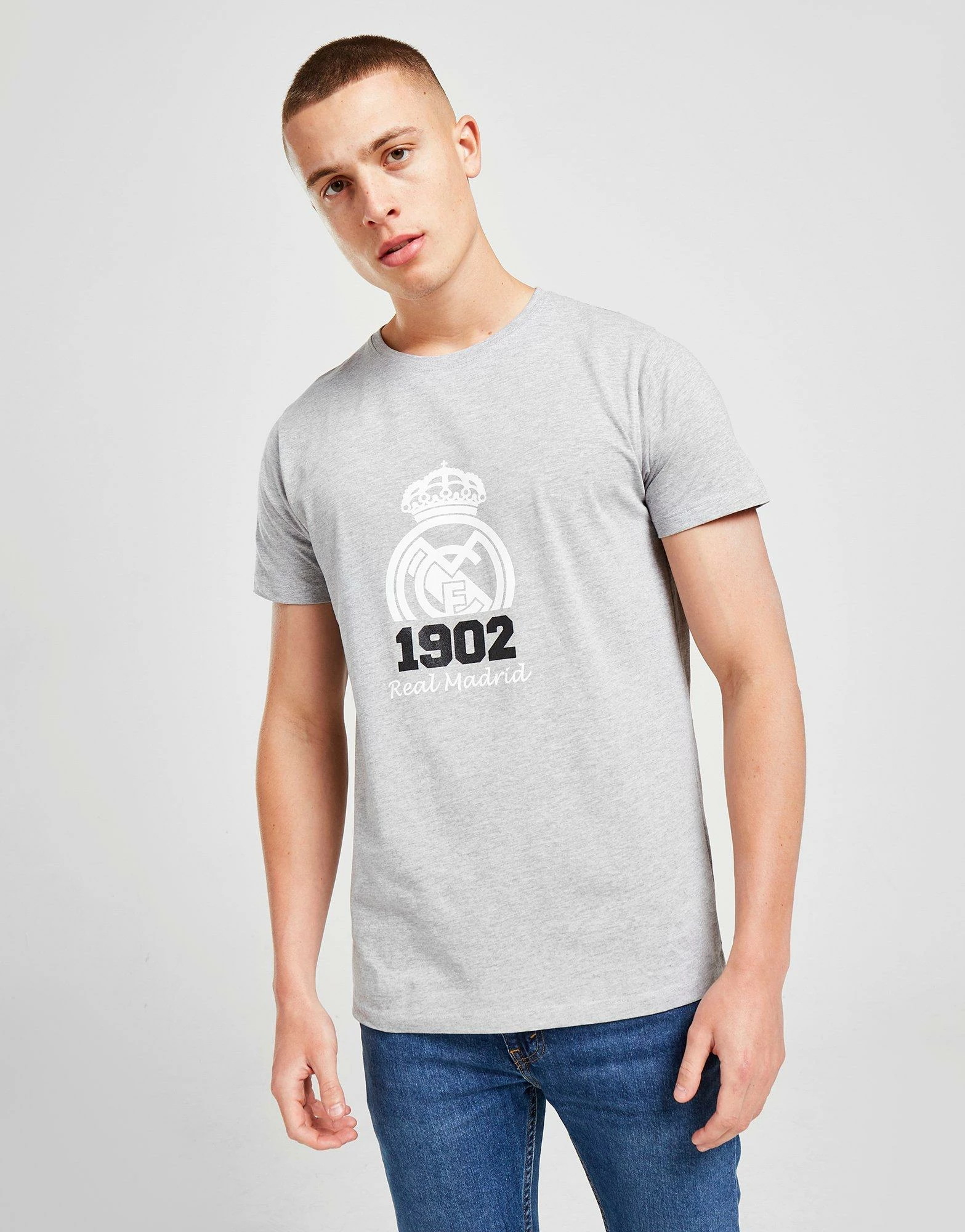 THIS PRODUCT IS PART OF OUR 2 FOR £25 OFFER. THE OFFER WILL AUTOMATICALLY APPLY WHEN YOU ADD TWO QUALIFYING PRODUCTS TO YOUR BASKET. Highlight your pride in your staple styles with this men’s Real Madrid 1902 T-Shirt from Official Team. Coming in a Grey colourway, this regular-fit tee is cut from soft, lightweight cotton for everyday comf’. It features a classic crew neckline and short sleeves for an easy feel, and is finished up with a Real Madrid crest printed to the chest. Machine washable. | Our model is 6’1″ with a 37.5″ chest and wears a size medium.
