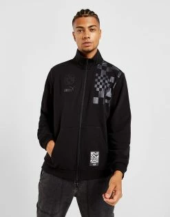 Zip up and rep your side in this men’s Borussia Dortmund Culture Track Jacket from PUMA. In a Black colourway, this standard-fit layer is made from a soft, poly-cotton blend for a laidback feel. It features a full zip fastening with a split kangaroo pocket and a risen collar, as well as ribbed trims, which optimise the fit. With tonal checkerboard graphics to the shoulder, this track top is finished up with PUMA branding and Borussia Dortmund team detailing. Machine washable. | Our model is 6’0″ with a 38″ chest and wears a size medium.