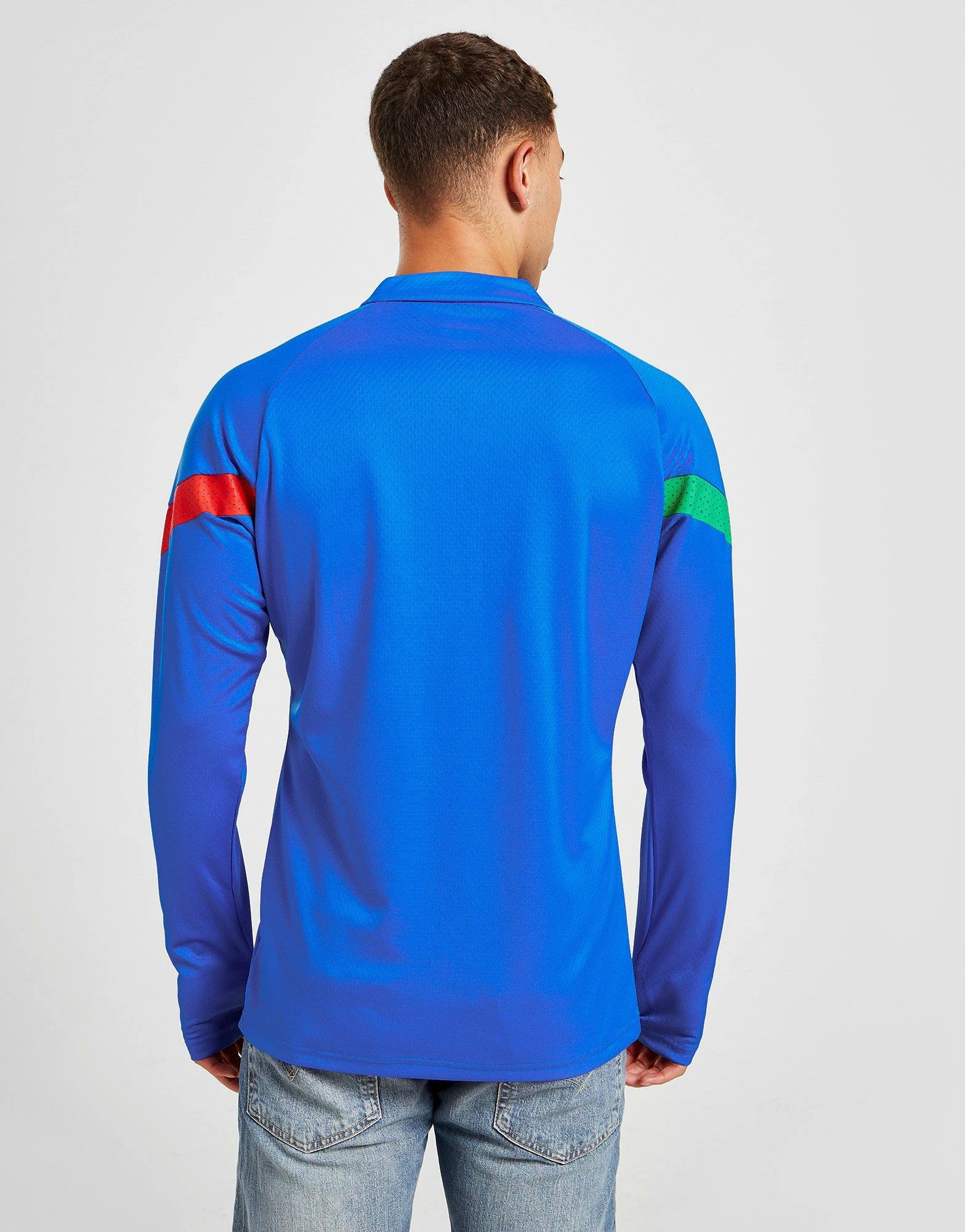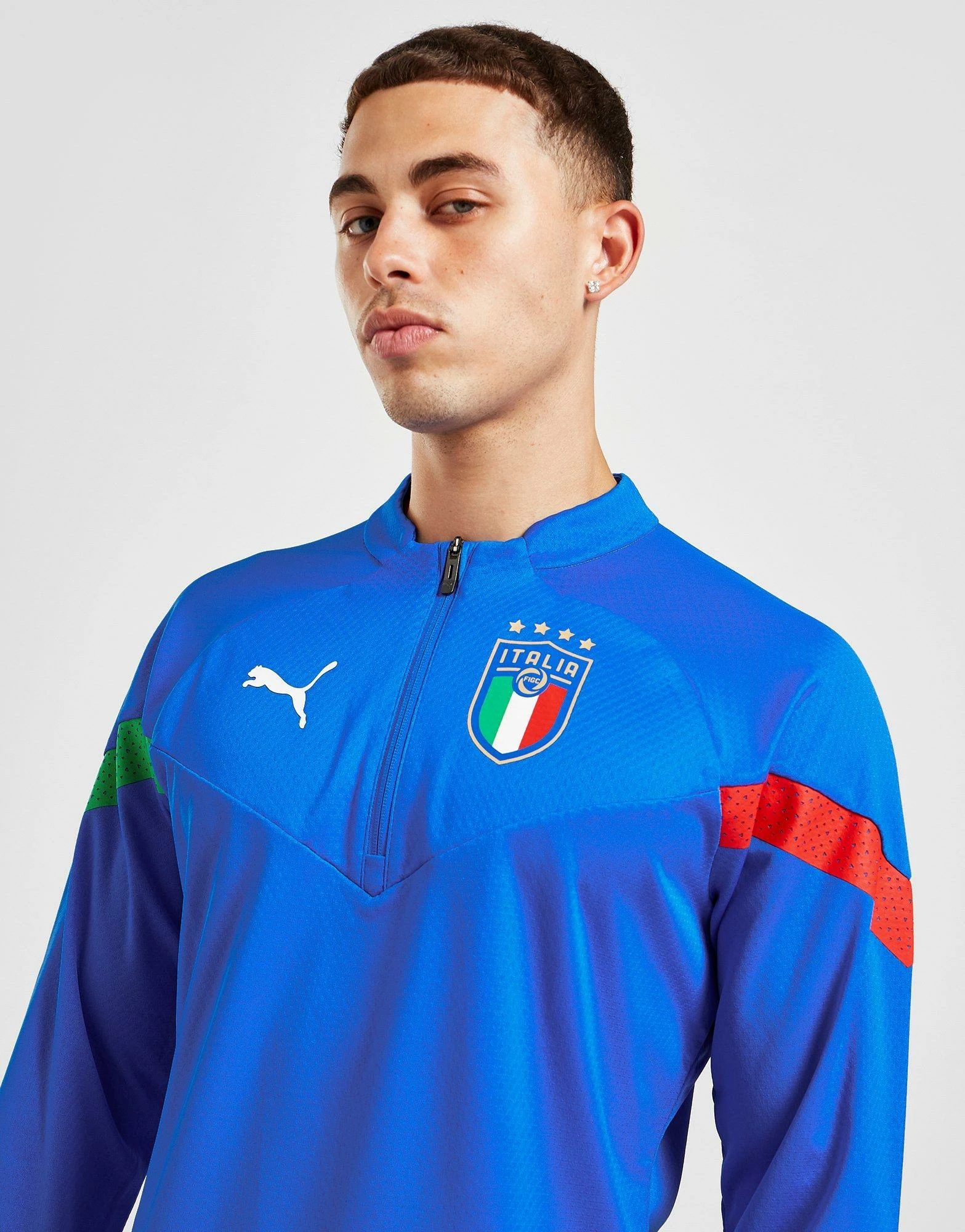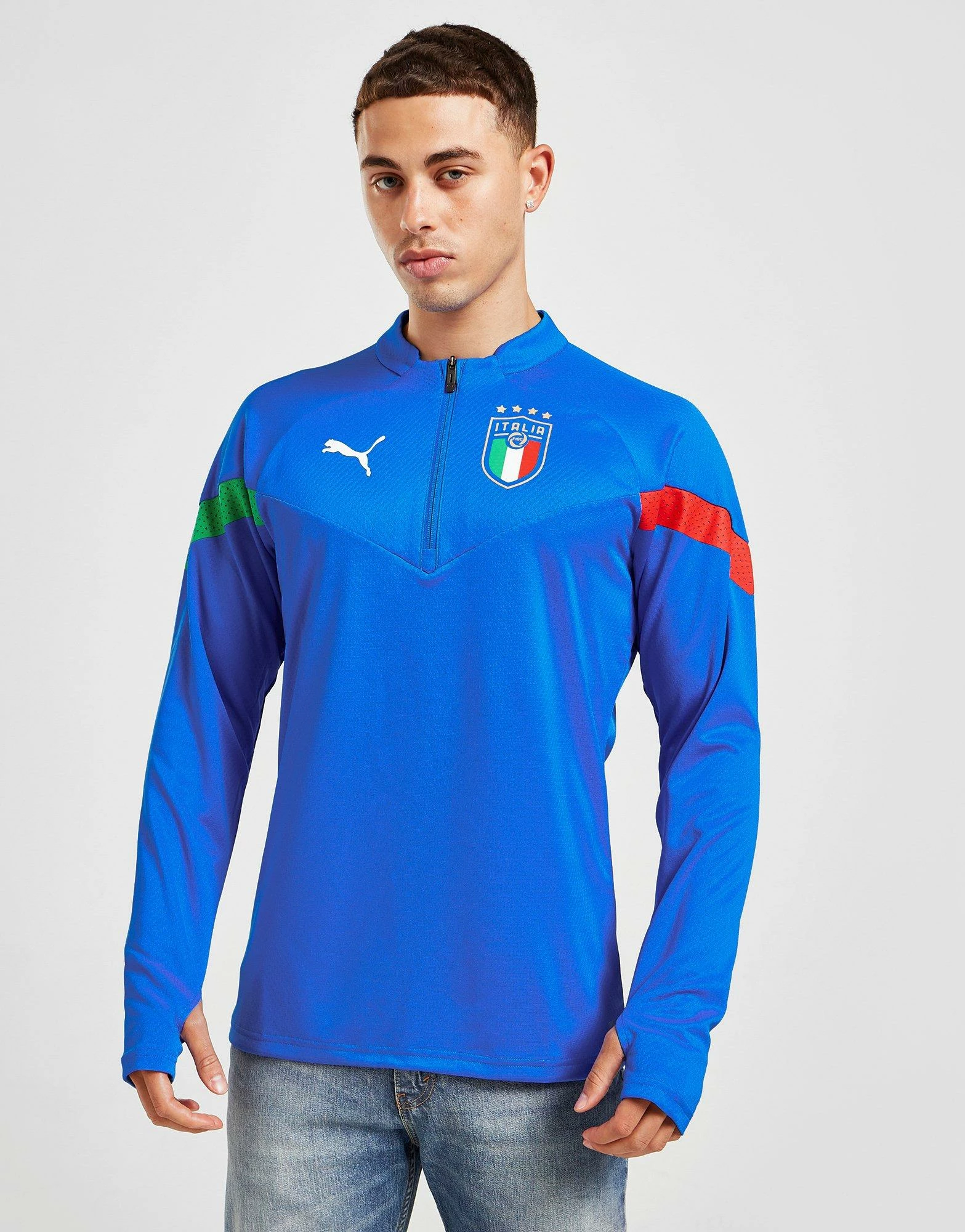 Gear up for the pitch in this men’s Italy Training 1/4 Zip Top from PUMA. Landing in an Ultra Blue colourway, this standard-fit top is cut from smooth, lightweight recycled poly for lasting comfort. It features a 1/4 zip closure with a mock neckline to adjust your airflow, and long, raglan-cut sleeves that let you move easily. With slim, tailored cuffs for a secure fit, it’s signed off with the iconic Italy crest and PUMA branding to the chest. Machine washable. | Our model is 5’11” with a 38″ chest and wears a size medium.