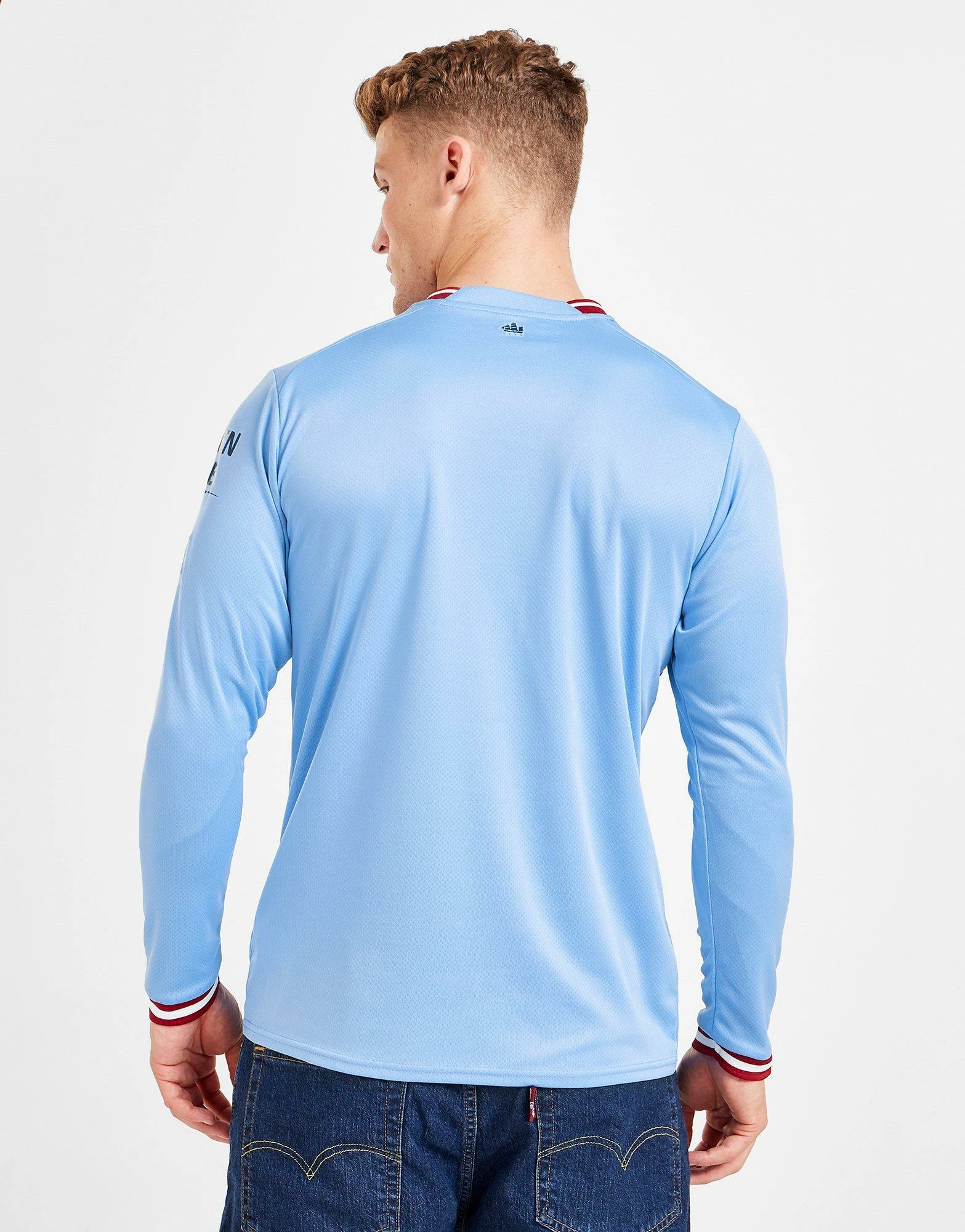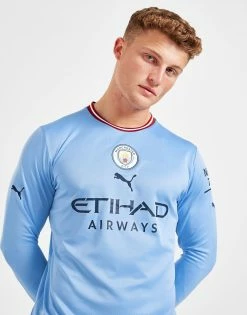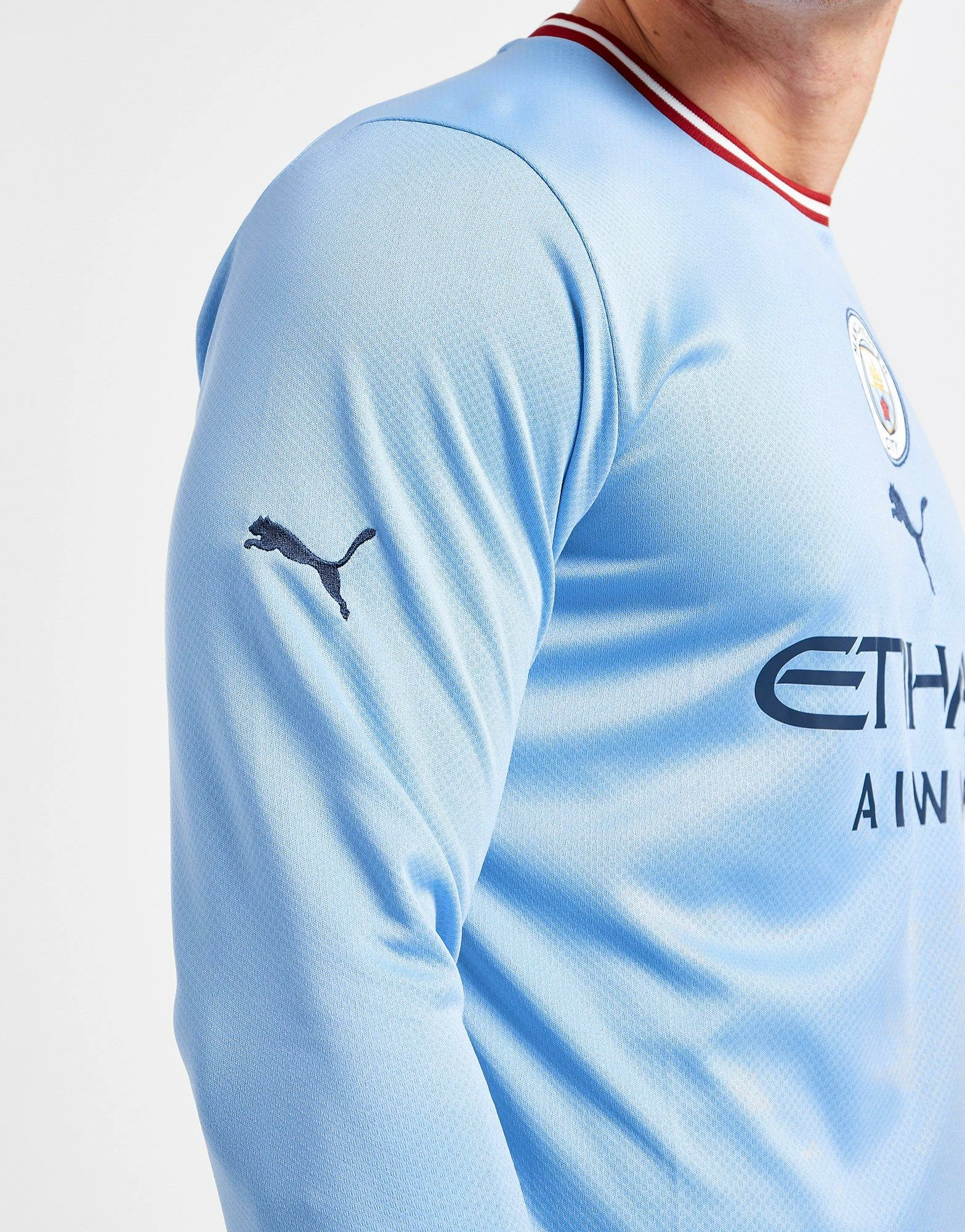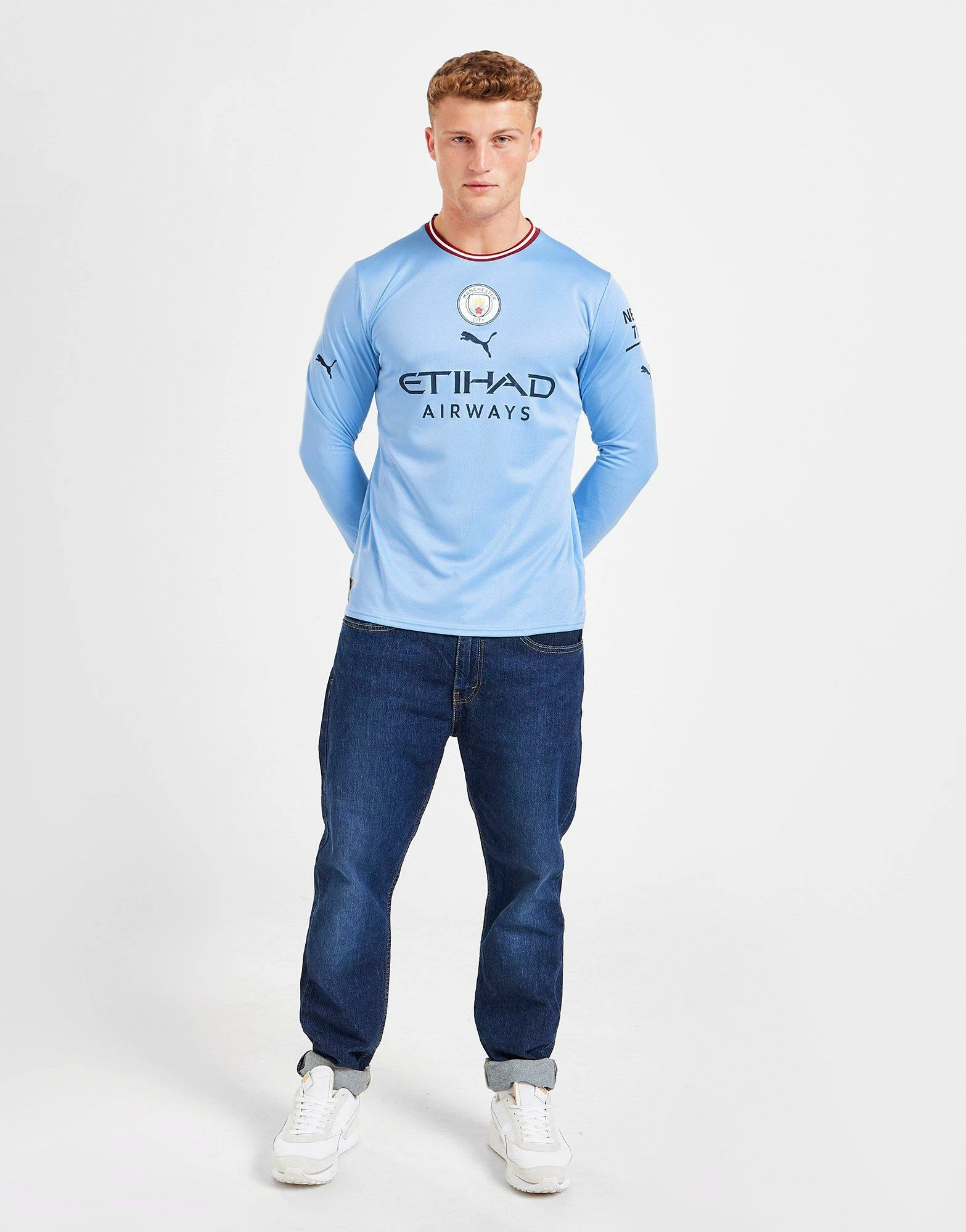 Rep your team this season with this men’s Manchester City FC 2022/23 Home Shirt from PUMA. In the club’s signature sky blue colourway, this slim-fit shirt is made with smooth, sweat-wicking poly for essential comfort on and off the pitch. It features a classic crew neckline and long sleeves, with a burgundy and white striped trim at the collar and cuffs. Signed off with City’s iconic crest at the chest, alongside classic PUMA branding to sign off. Machine washable.