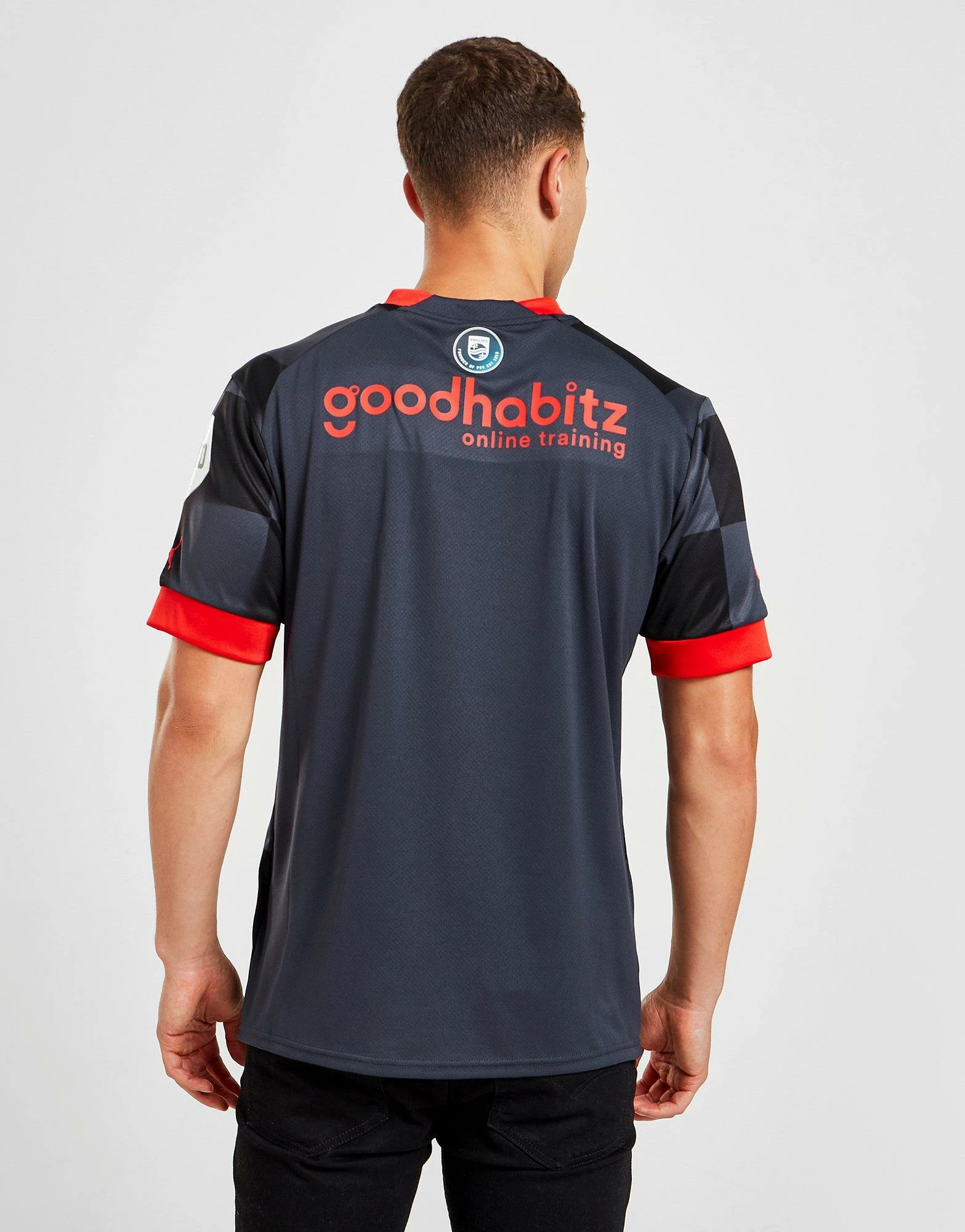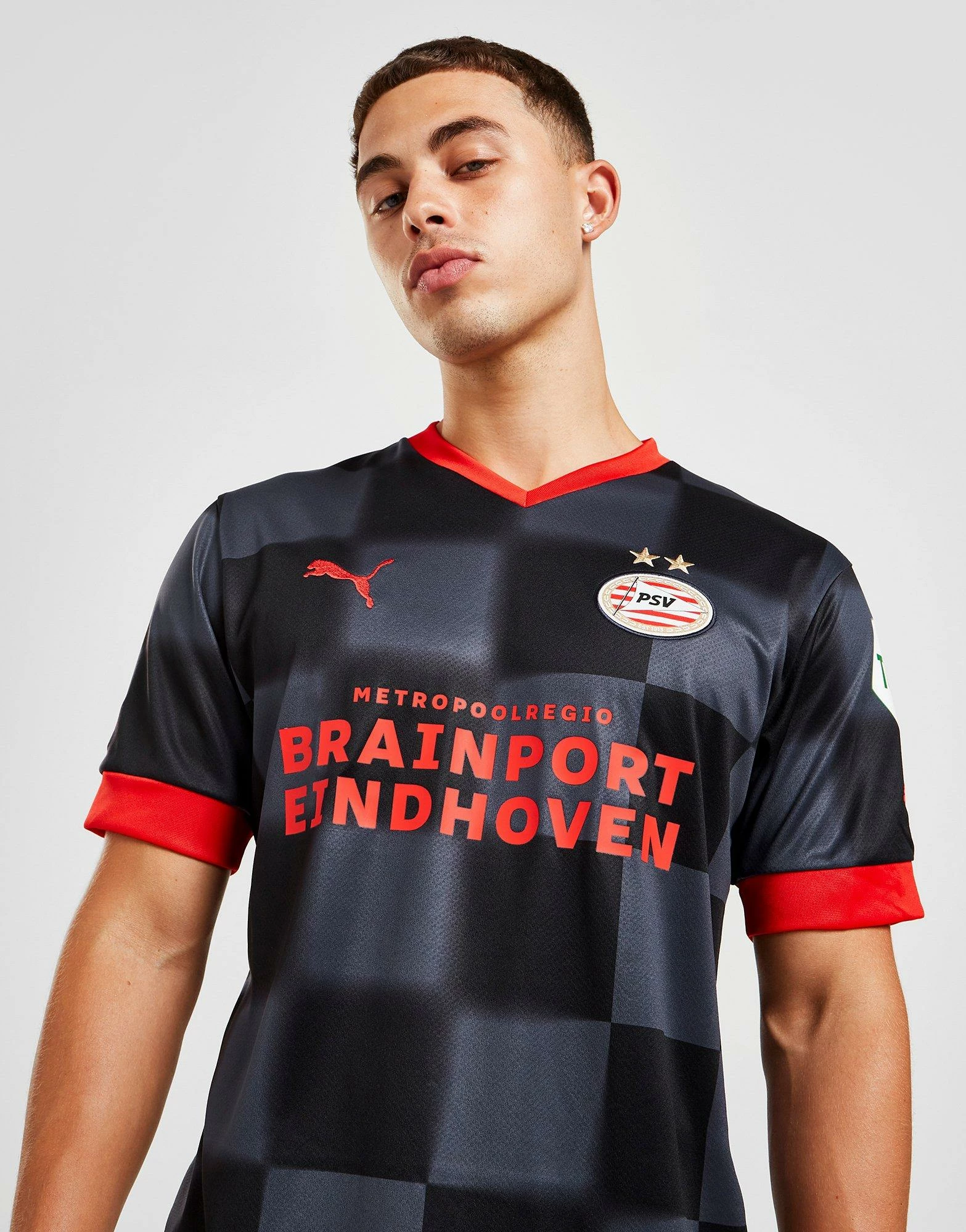 Back your side in this men’s PSV Eindhoven 2022/23 Away Shirt from PUMA. In a Black and Grey checkerboard print, this regular-fit shirt is made from smooth and lightweight poly fabric. It comes with PUMA’s dryCELL tech to wick away sweat, and features a V-neckline, short sleeves and contrasting red trims. Finished with PUMA branding and the iconic PSV crest to the chest. Machine washable. | Our model is 5’11” with a 38″ chest and wears a size medium.