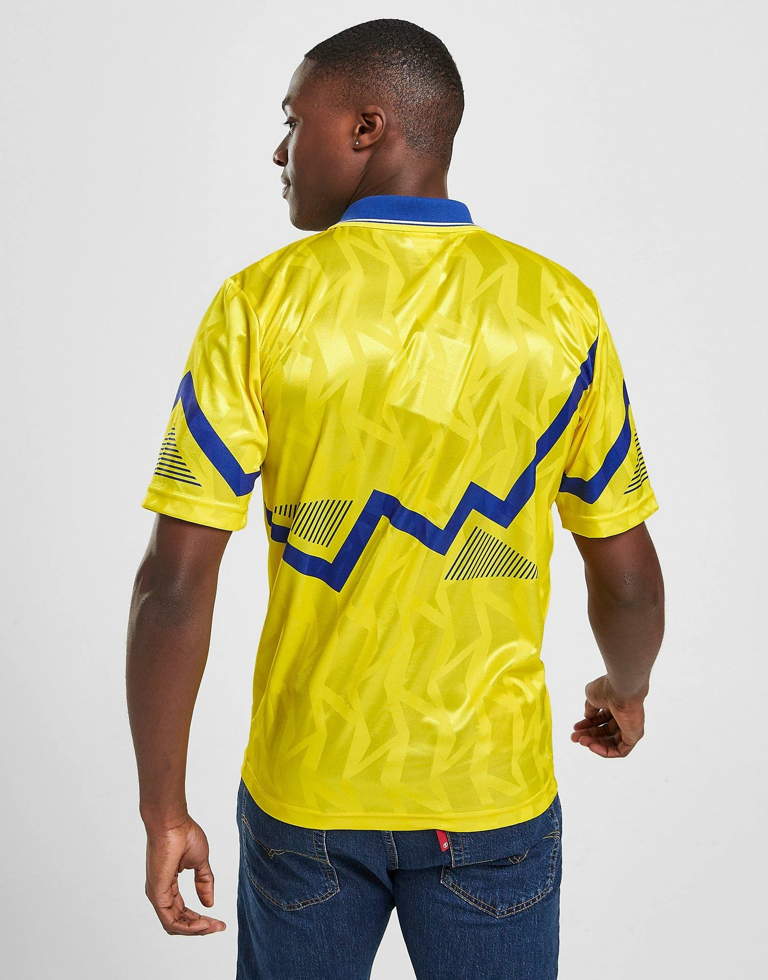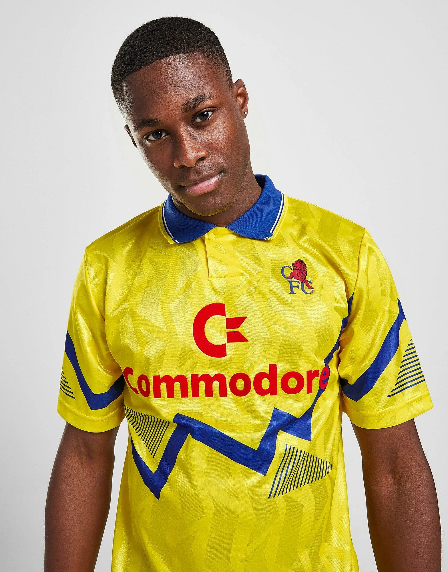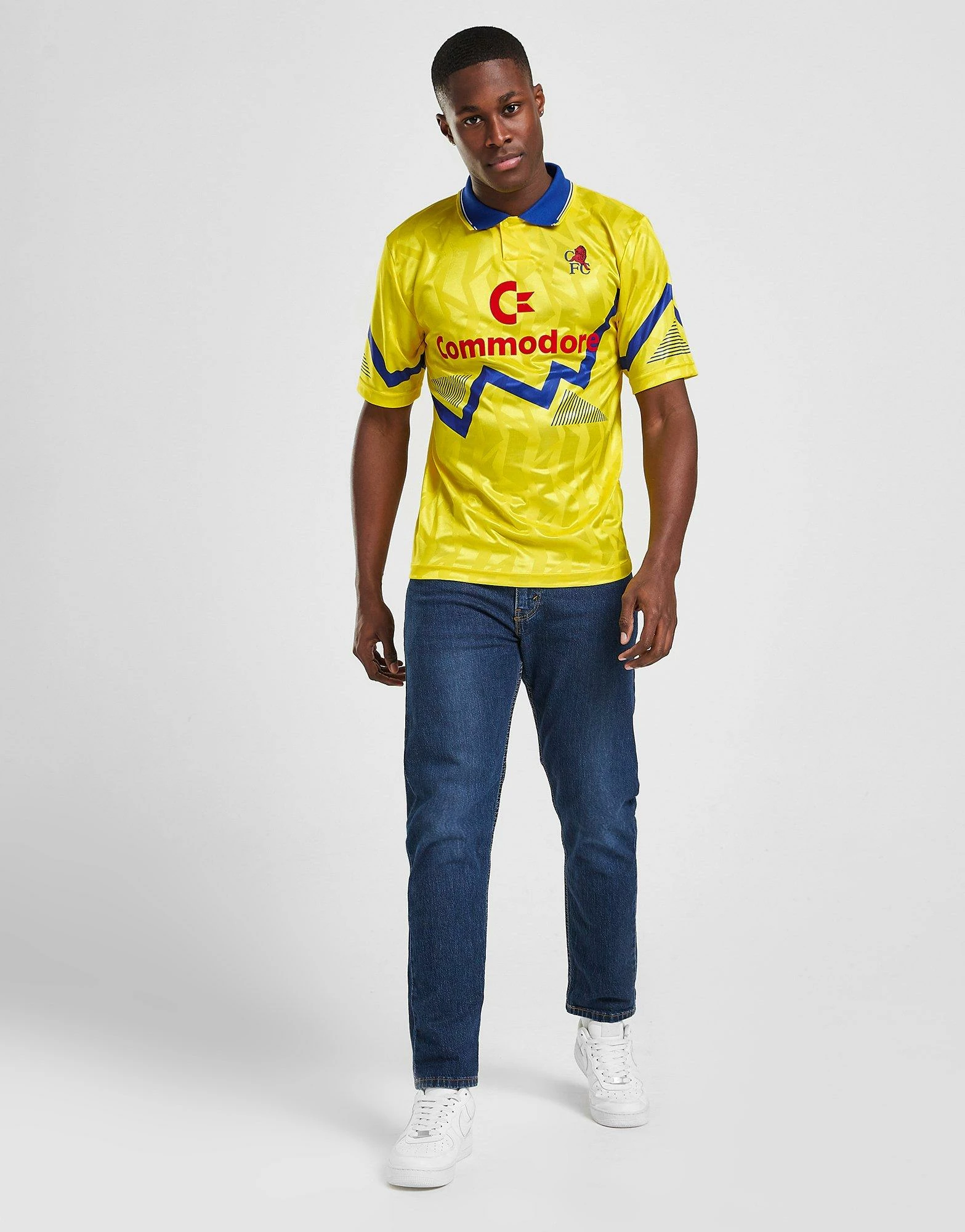 Throw it back with a bold look in this men’s Chelsea FC ’90 Retro Third Shirt from Score Draw. In a yellow colourway with blue trims, this regular-fit shirt is made from smooth and durable poly fabric for essential comfort. It features an old-school one-button placket and spread collar, as well as short sleeves for a relaxed wear. Signed off with the retro Chelsea badge to the chest. Machine washable. | Our model is 6’2″ with a 38″ chest and wears a size medium.