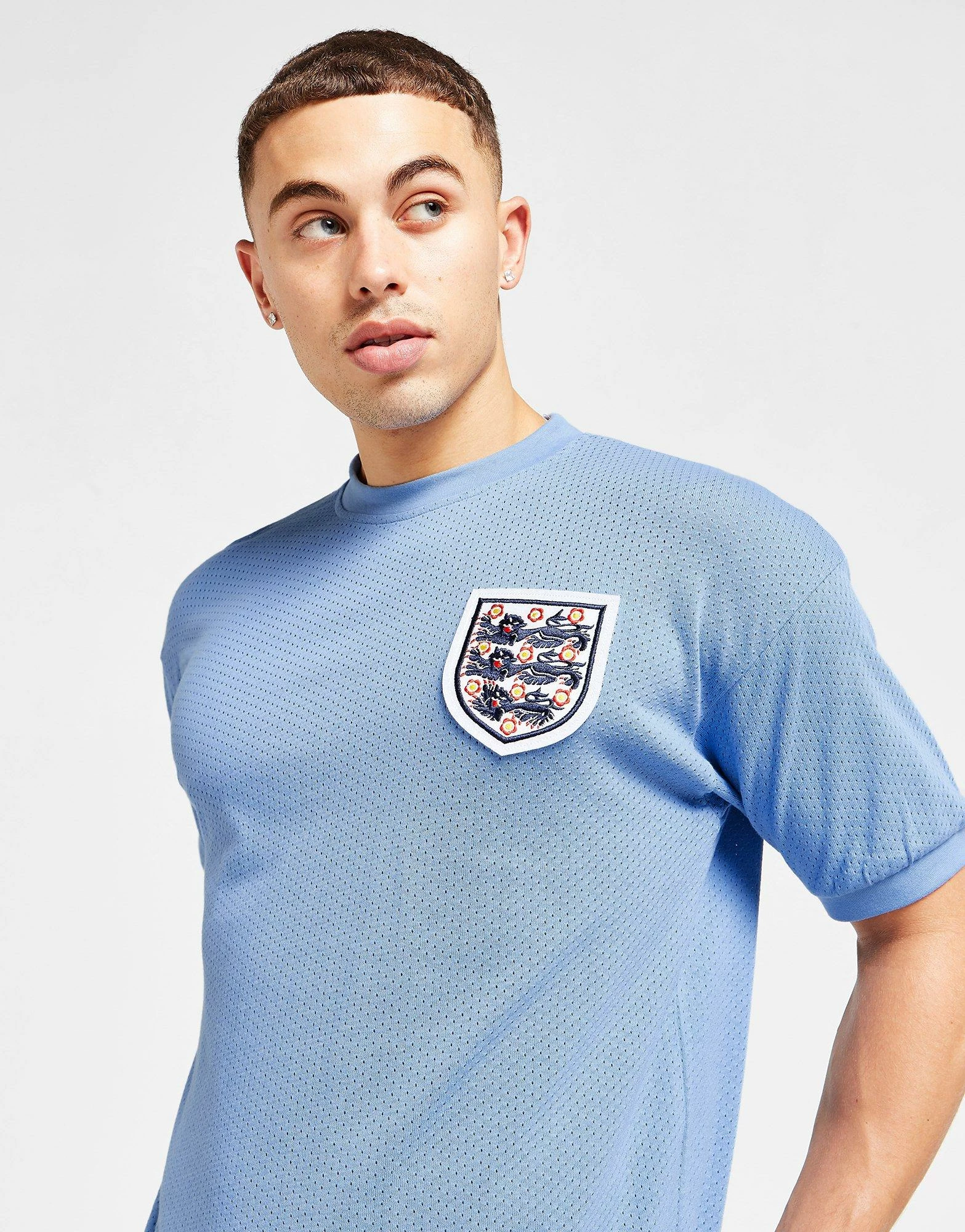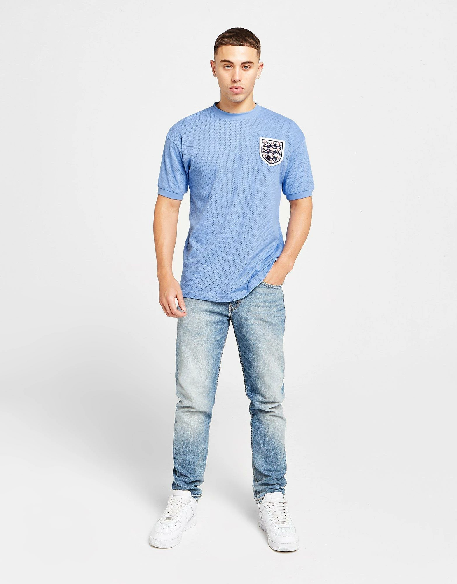 Rep a legendary look from the streets to the stands with this men’s England ’70 World Cup Third Retro Shirt from Score Draw. In a blue colourway, this classic-fit shirt is made from perforated poly fabric for cool comfort. It features a crew neckline, slightly dropped shoulders and short sleeves, while ribbed trims add a soft touch. Finished up with the iconic Bobby Moore #6 to the back and the Three Lions crest embroidered to the front. Machine washable. | Our model is 5’11” with a 38″ chest and wears a size medium.