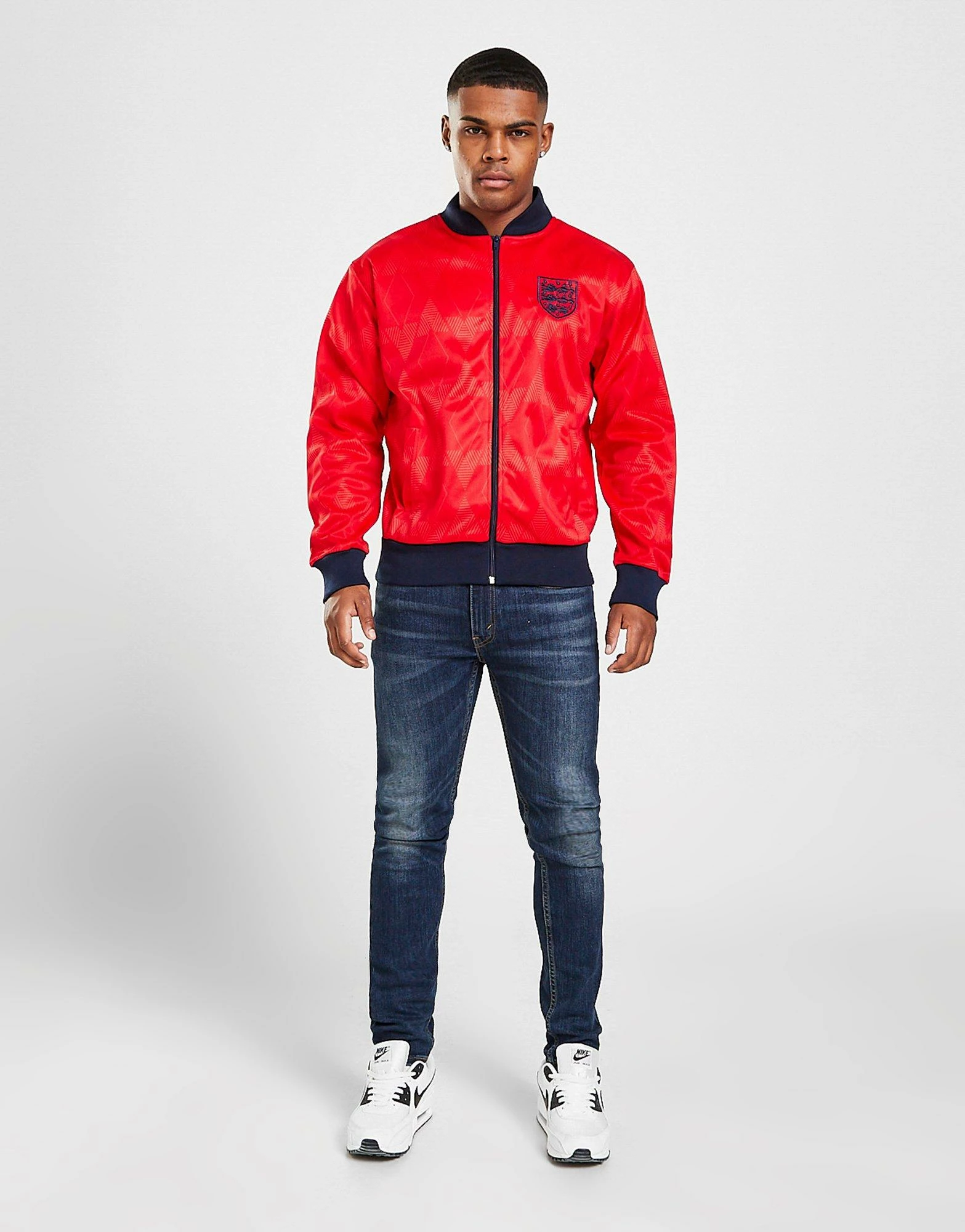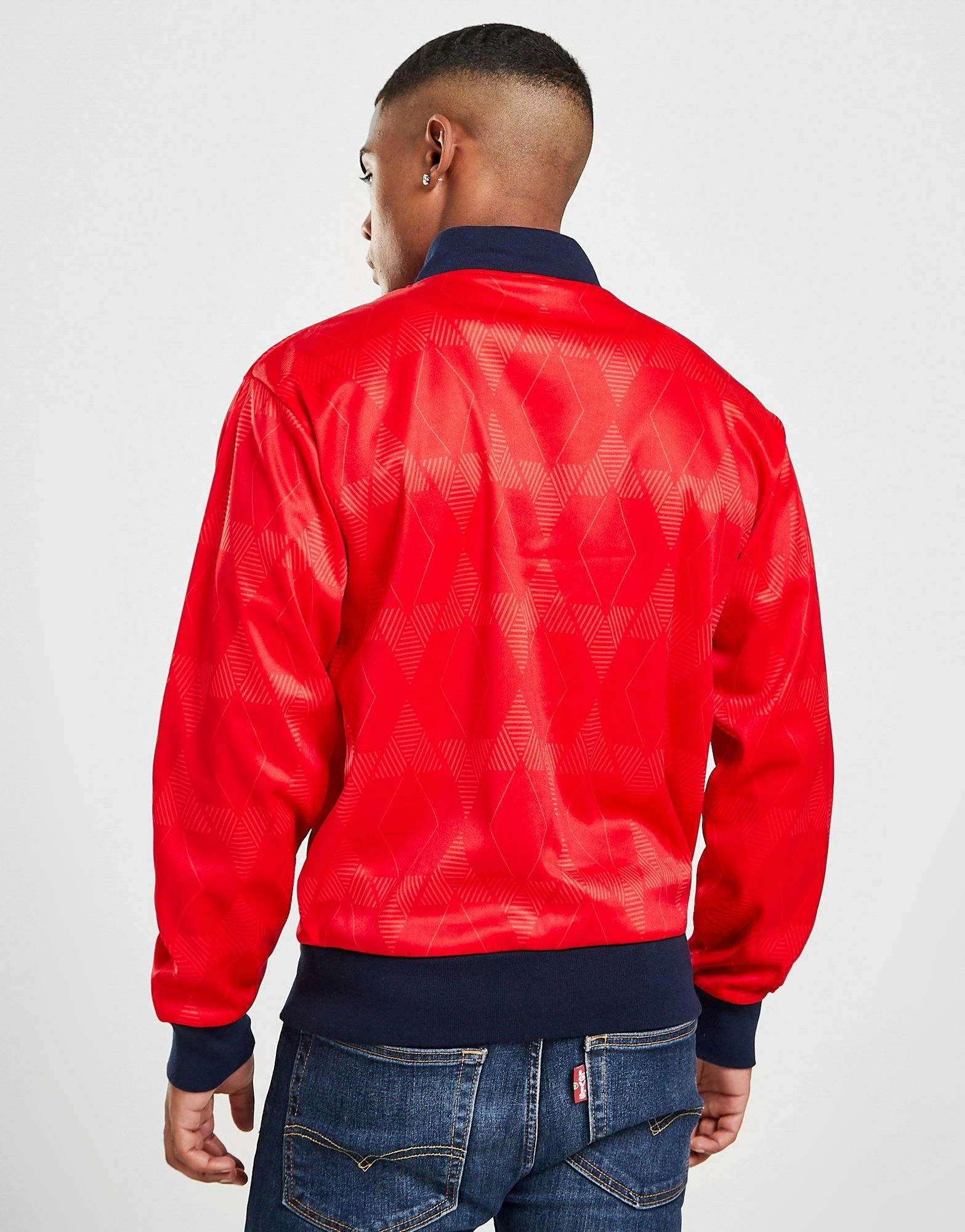 Zip up in an old-school football look in this men’s England ’90 Away Retro Track Top from Score Draw. In a red colourway with a vintage geometric pattern, this standard-fit track top is made from soft poly jersey fabric for long-lasting comfort. It features a full zip fastening with a bomber collar and ribbed trims. Finished up with a signature England crest branded to the chest. Machine washable. | Our model is 6’0″ with a 38.5″ chest and wears a size medium.