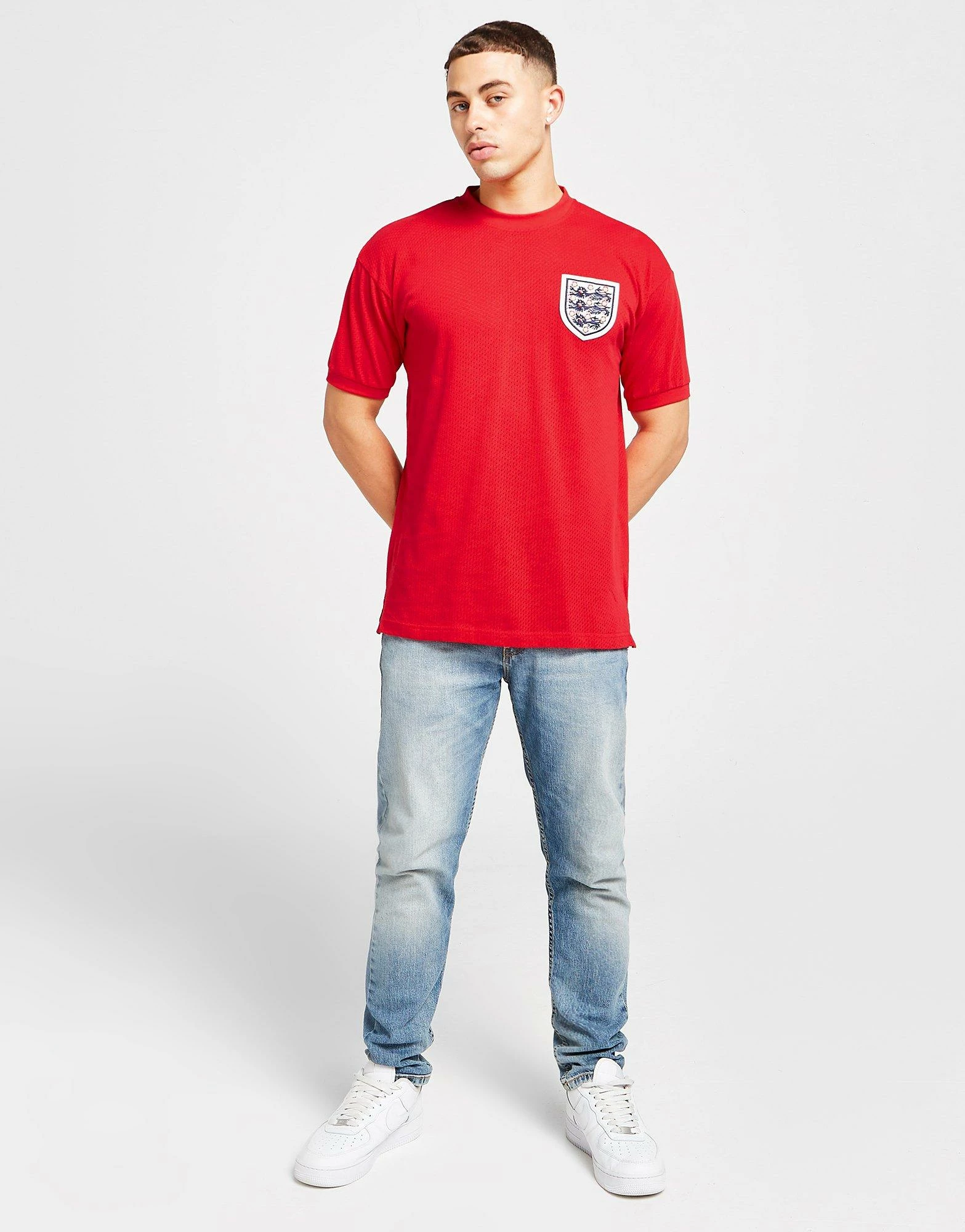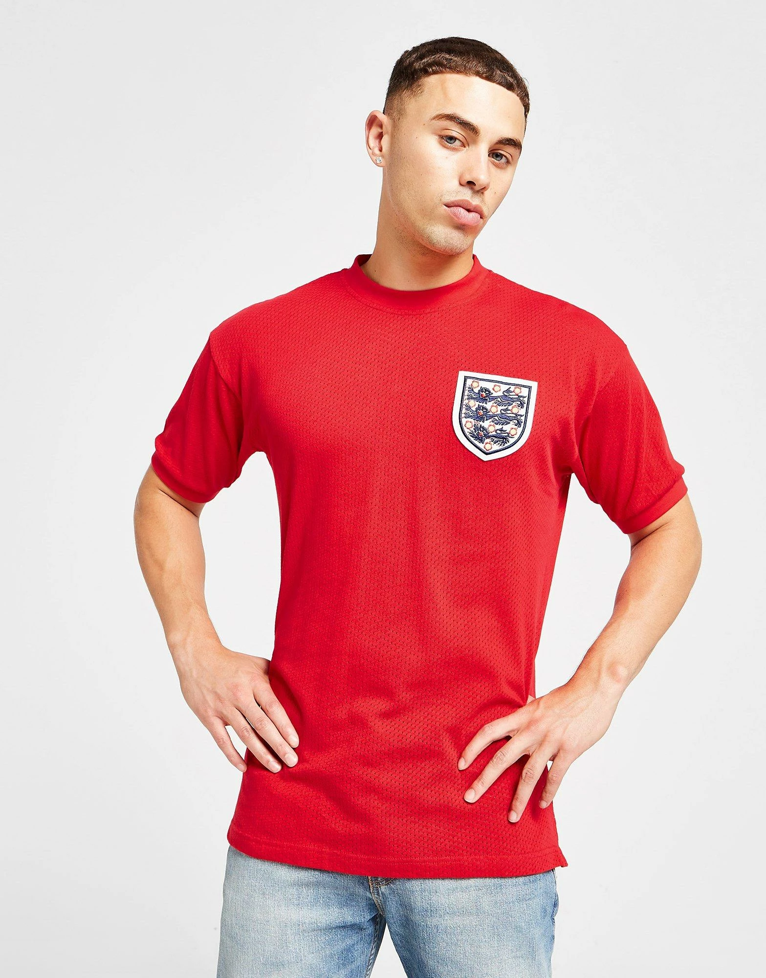 Throw it back with this men’s England Mexico ’70 Away Shirt from Score Draw. In the iconic away Red, this shirt is made from light, breathable polyester for cool comfort on matchday. It features a crew neckline with short sleeves and comes in a standard fit for a relaxed wear whenever you rep it. This throwback shirt has elasticated trims for a snug fit and is finished up with the signature 3-Lions crest to the chest and a #6 to the back. Machine washable | Our model is 5’11” with a 38″ chest and wears a size medium.
