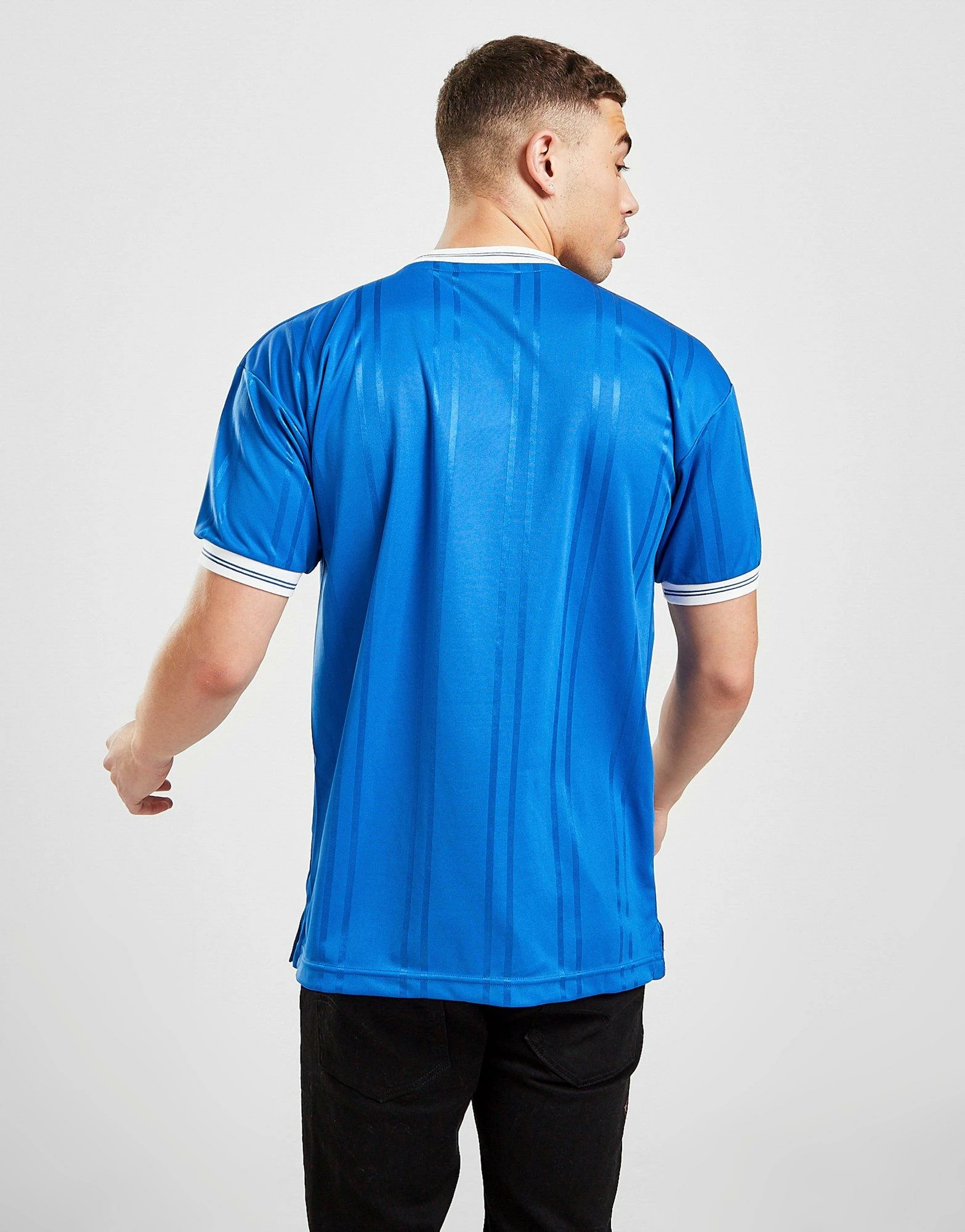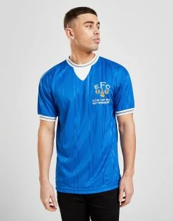 Rep a retro look and support your side with this men’s Everton FC ’85 ECW Cup Final Shirt from Score Draw. In a blue colourway, this shirt is made from lightweight poly for match-day comfort. It has short sleeves and a crew neckline with contrasting white accents. In a standard-fit, this footie fave is finished up with the Everton club crest. Machine washable. | Our model is 5’11” with a 38″ chest and wears a size medium.