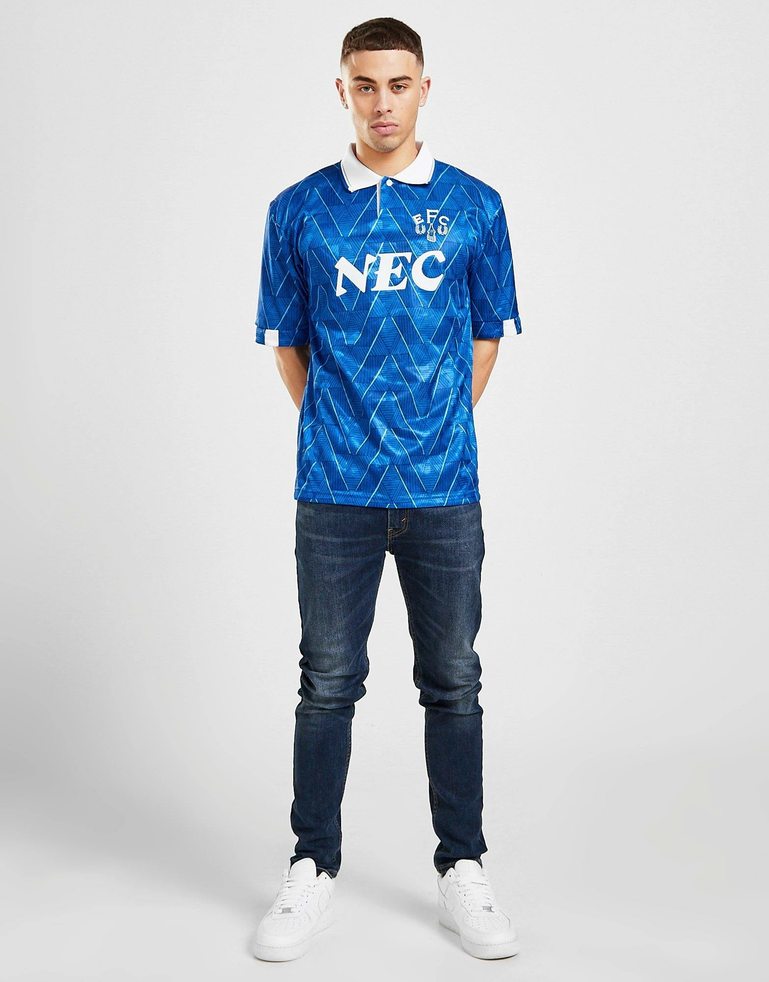 Throw it back and rep your team with this men’s Everton FC ’90 Home Shirt from Score Draw. In a blue colourway with an all over print, this shirt is made from lightweight poly for cool comfort on and off the pitch. It has short sleeves and a button placket collar for a classic look. In a regular-fit, it’s finished with the the iconic Everton team crest. Machine washable. | Our model is 5’11” with a 38″ chest and wears a size medium.