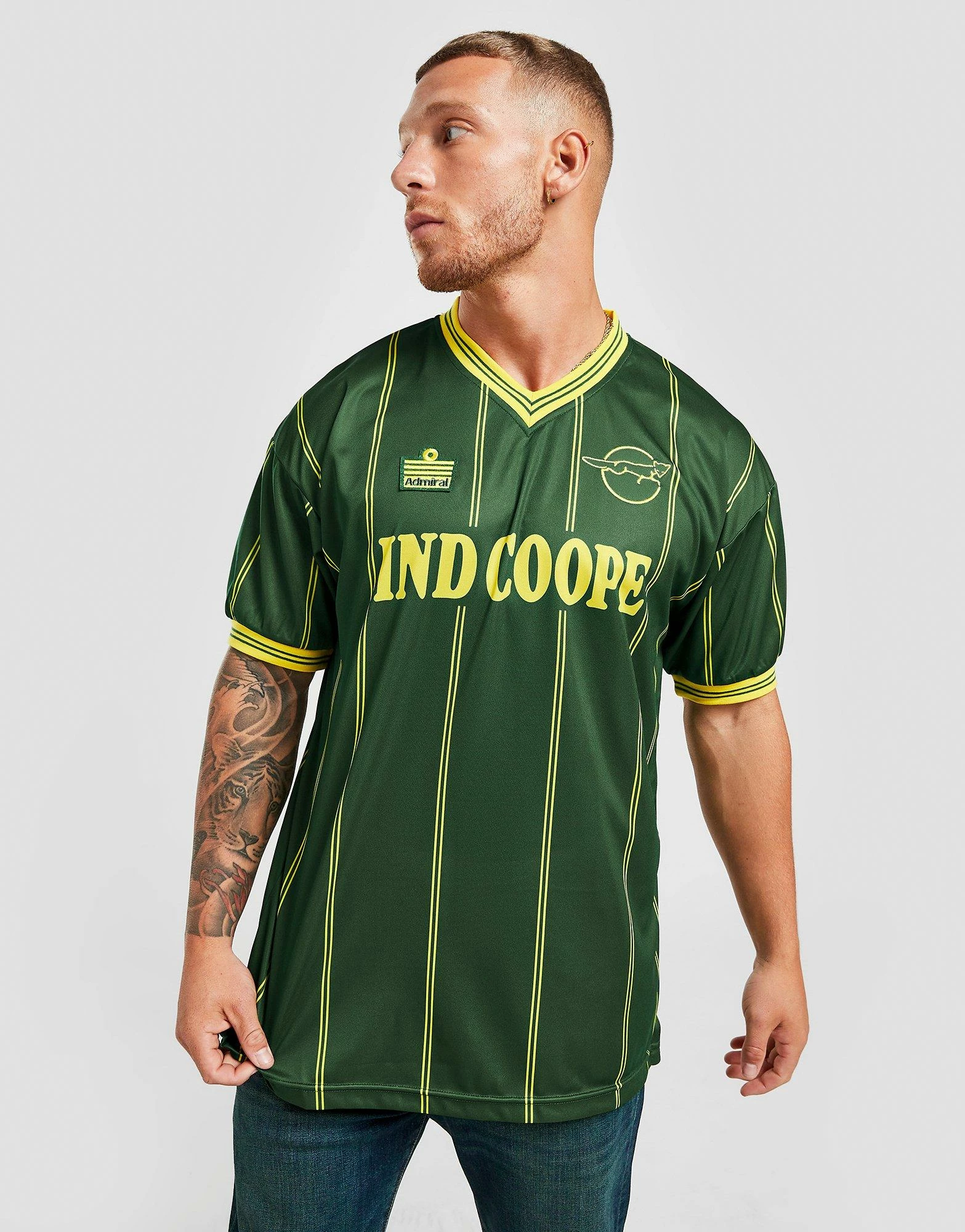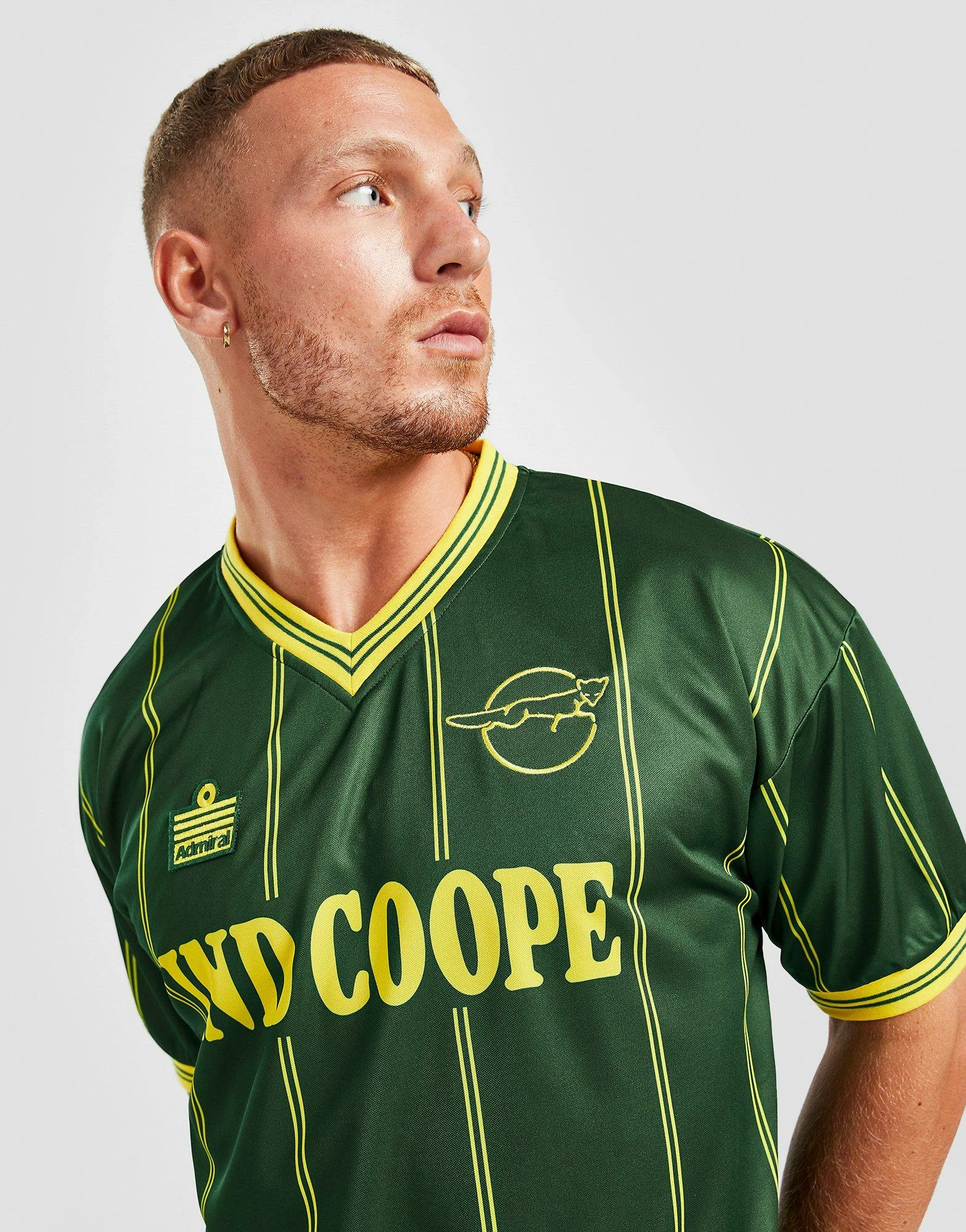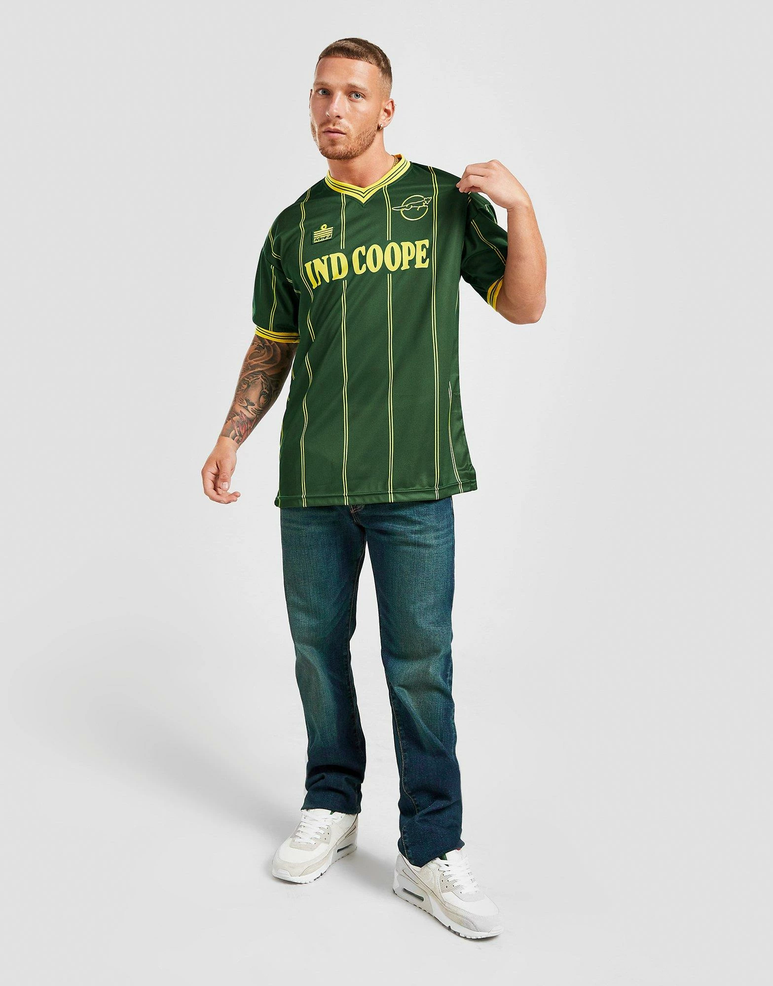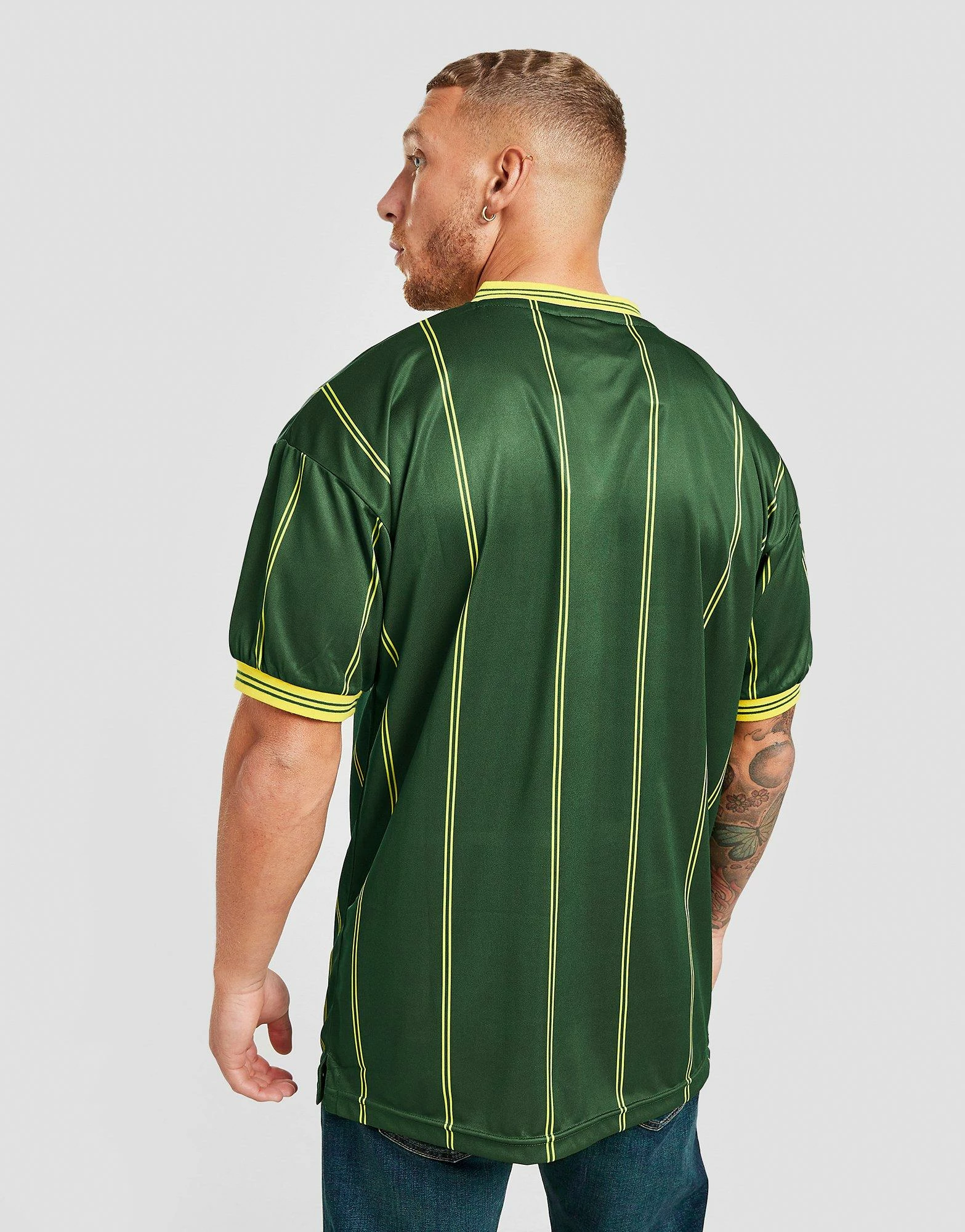 Throw it back to the ’80s and show your support in this men’s Leicester City FC ’84 Retro Away Shirt from Score Draw. A replica of the OG shirt, it comes in a Green colourway with a pinstripe print, and is made from smooth poly fabric. This shirt features a V-neckline and short sleeves with striped trims. It sports the sponsor to the front and is finished with the Leicester City club crest to the chest to show your support. Machine washable. | Our model is 5’10” with a 37″ chest and wears a size medium.