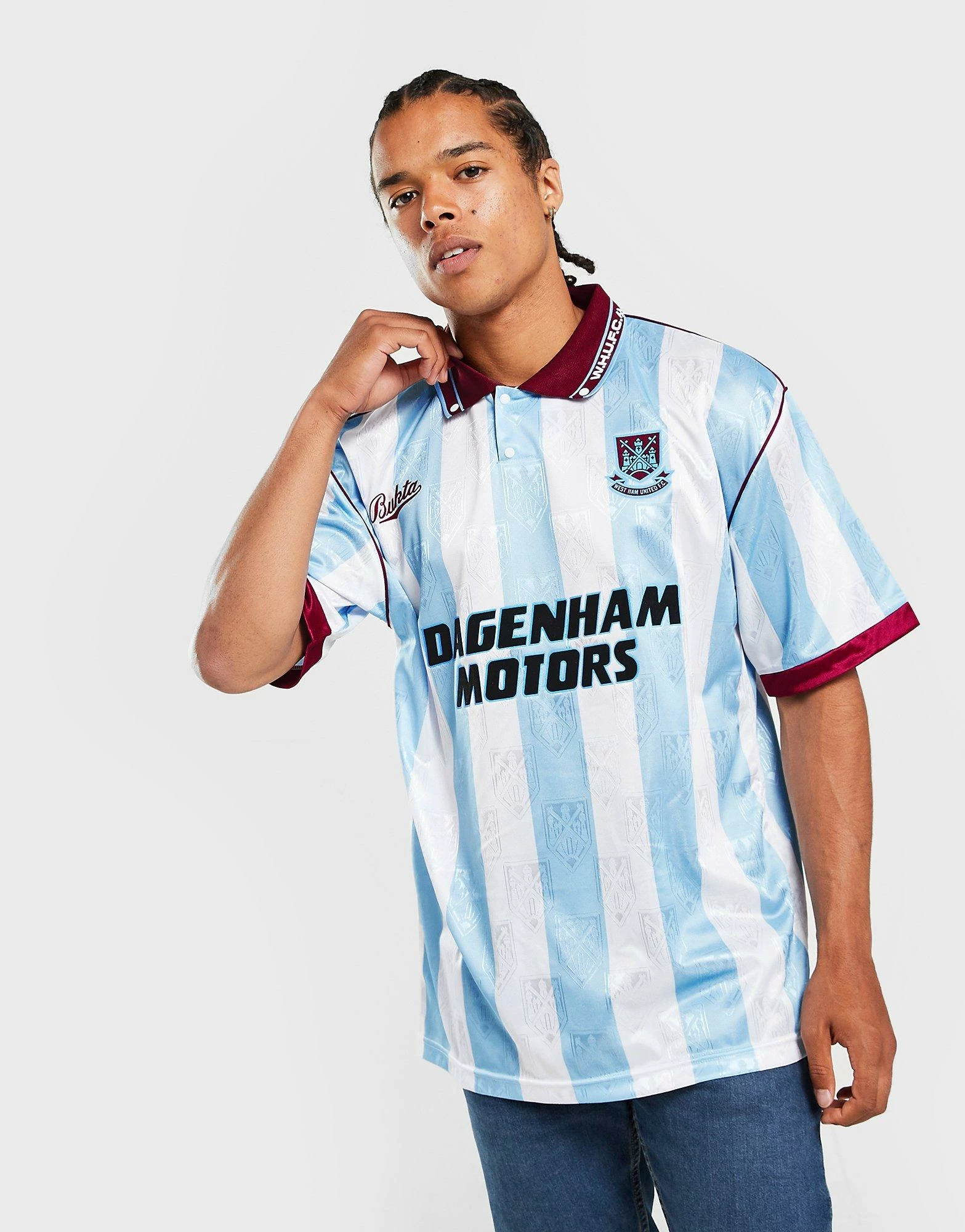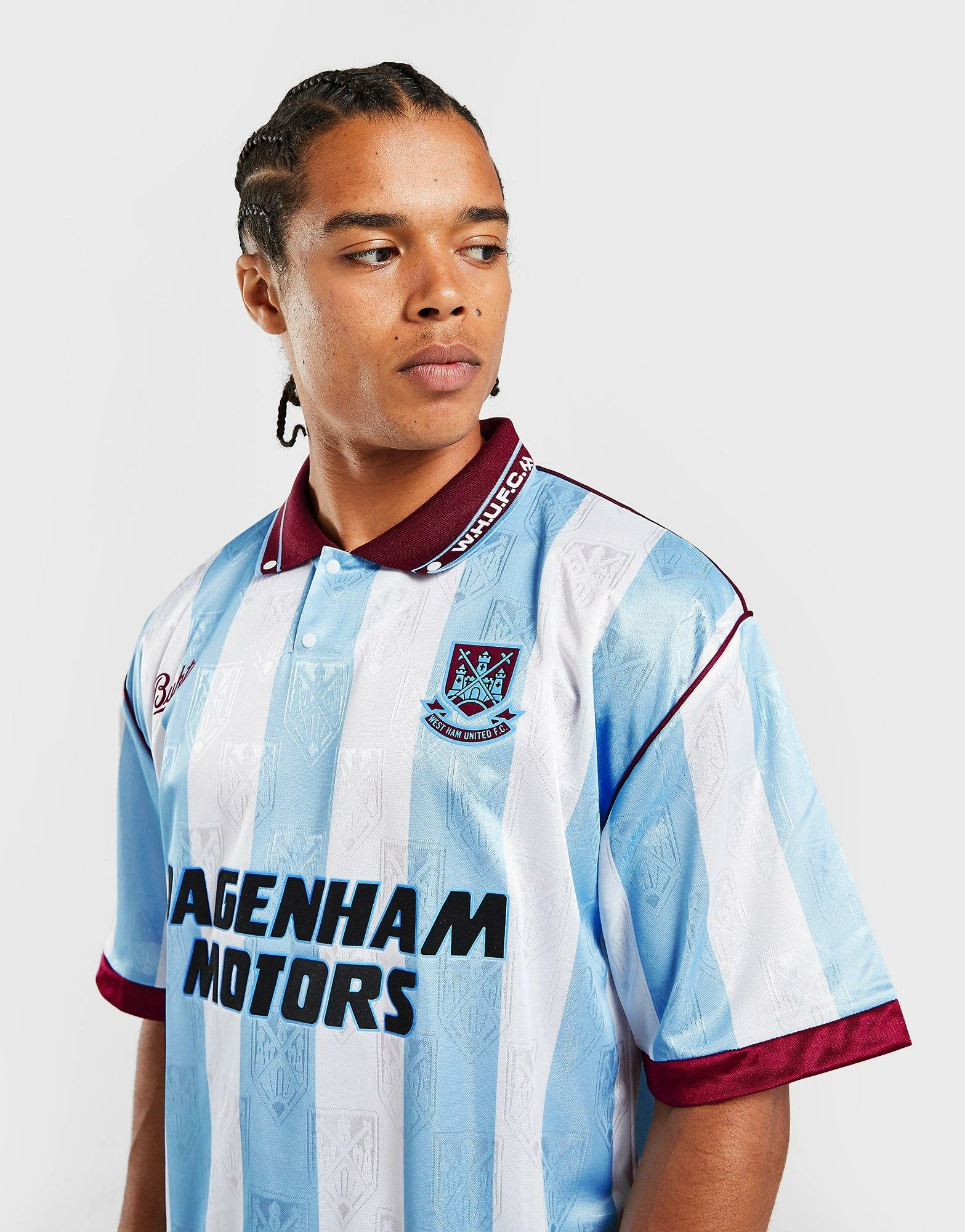 Rep an old-school look from the Hammers with this men’s West Ham United ’92 Retro Away Shirt from Score Draw. In a blue and white stripes colourway with classic Claret trims, this relaxed-fit shirt features a two-button placket, a spread collar, dropped shoulders and short sleeves. Made from lightweight poly fabric, this shirt is finished with a tonal logo print throughout and the iconic West Ham crest. Machine washable. | Our model is 6’1″ with a 37″ chest and wears a size medium.