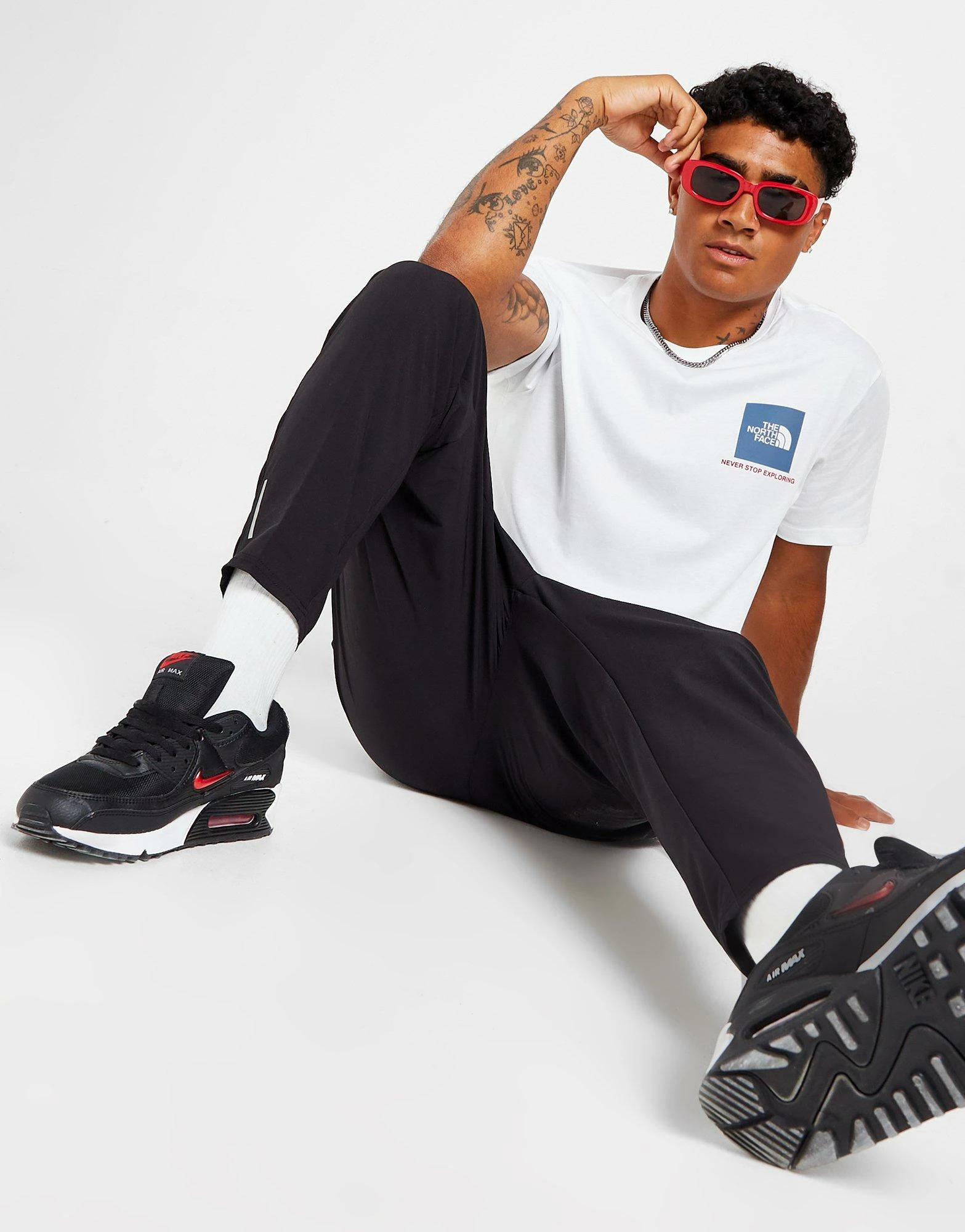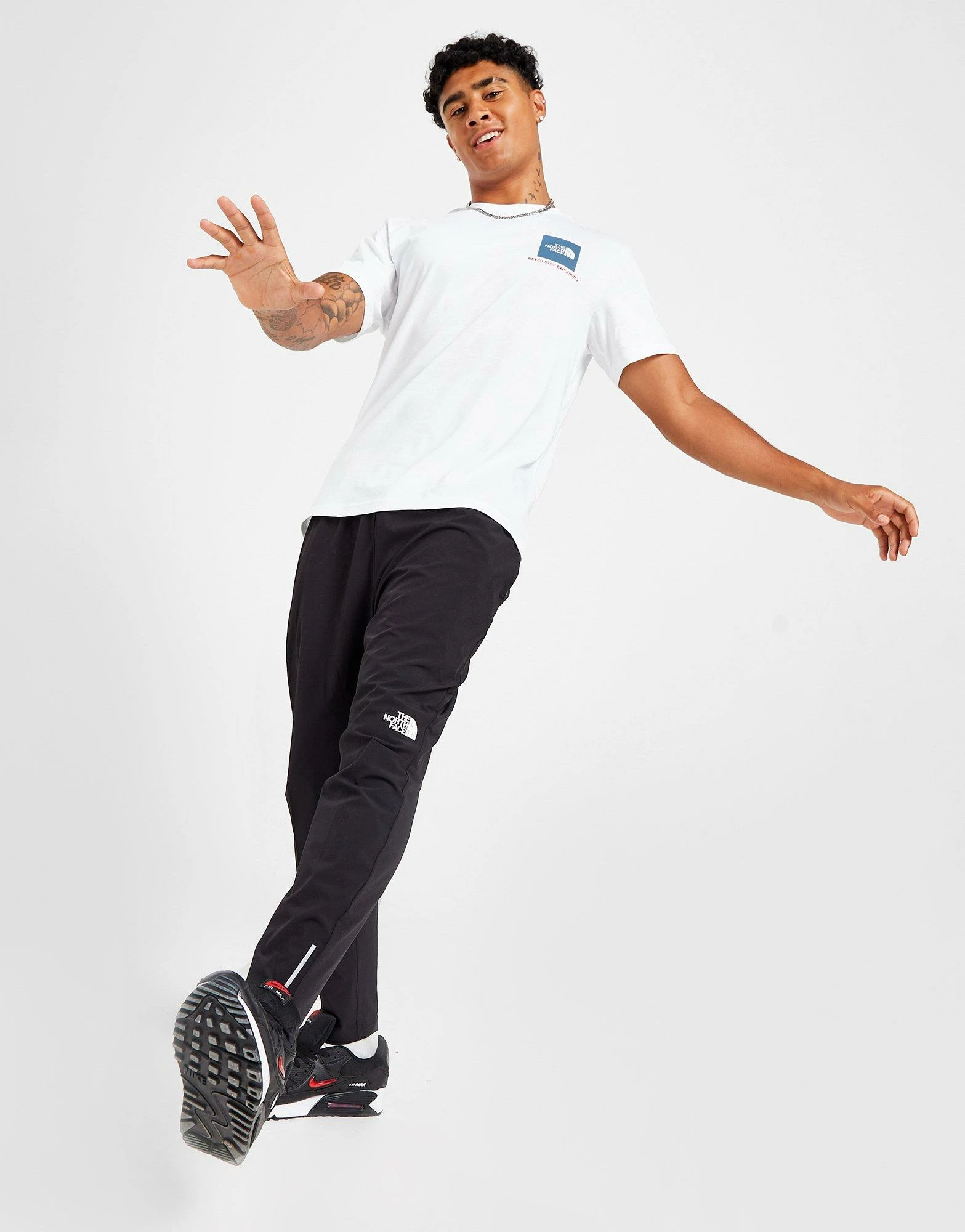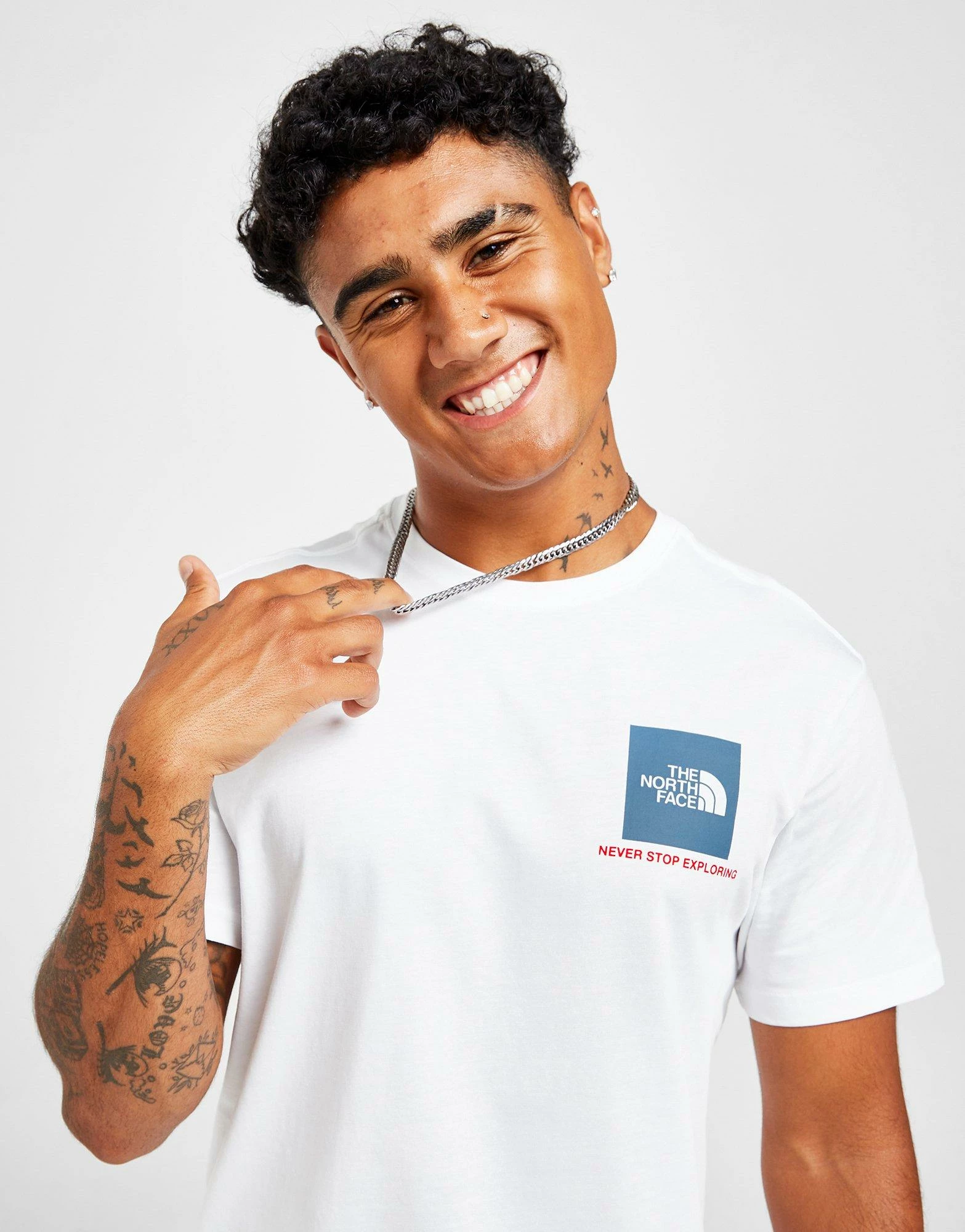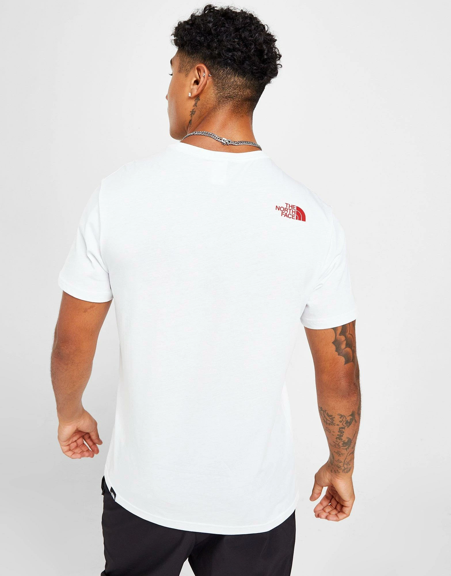 Update your everyday looks with this men’s Fine Box T-Shirt from The North Face. Landing in a fresh White colourway, this regular-fit tee is made with soft, durable cotton for lasting comfort. It features a ribbed crew neckline and short sleeves for a classic cut, and is finished up with a bold box logo at the chest with the iconic ‘Never Stop Exploring’ slogan below. Signed off with branding at the reverse shoulder. Machine washable. | Our model is 5’11” with a 38″ chest and wears a size medium.