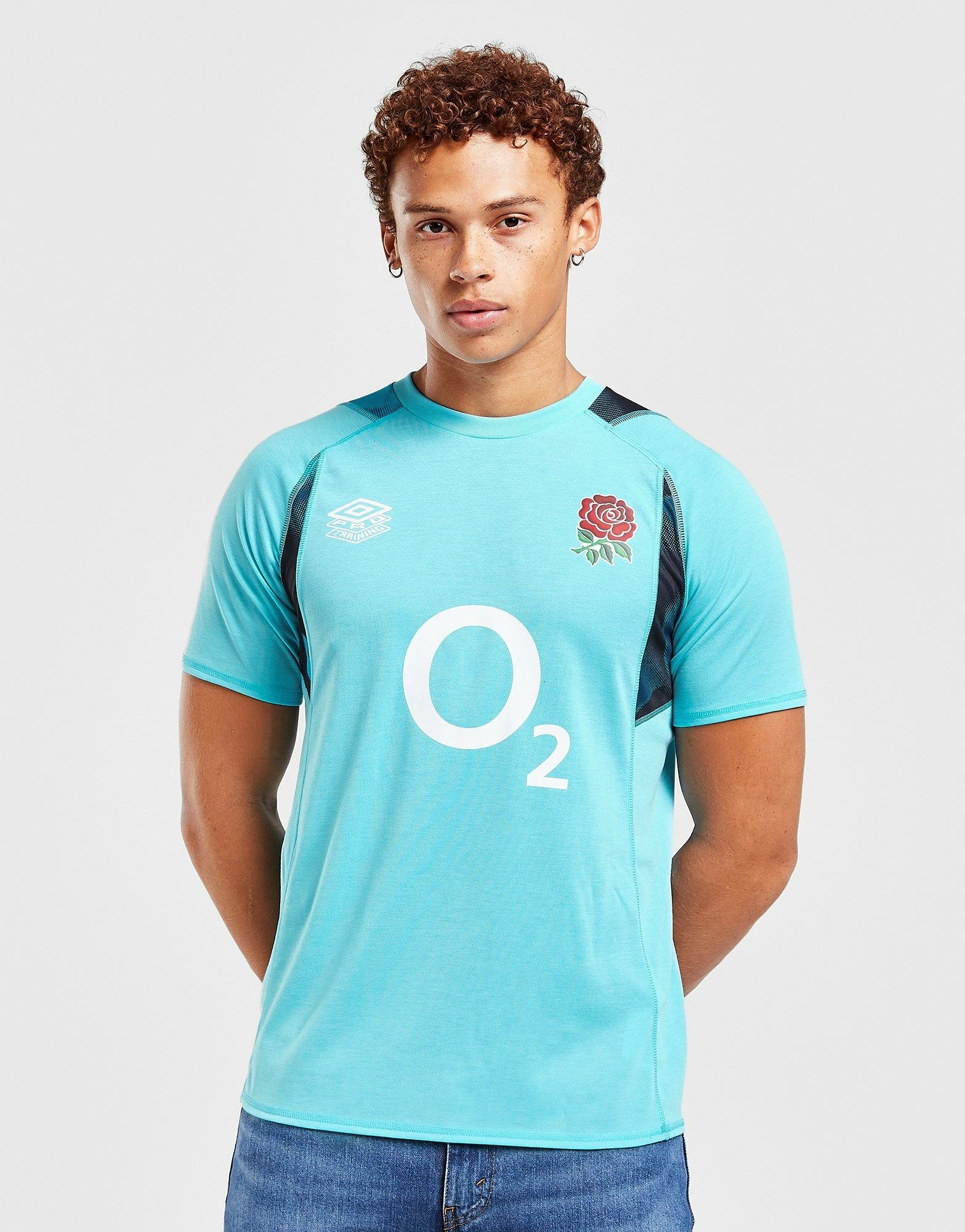 Sharpen your skills with this men’s England RFU Training Top from Umbro. In a Bachelor Button colourway, this regular-fit top is cut from a smooth and light poly fabric that wicks away sweat to keep you cool and comfy. It features a crew neckline with short raglan sleeves for a classic cut and has a dropped hem for added coverage. Signed off with the England RFU crest and Umbro logo to the chest. Machine washable. | Our model is 6’1″ with a 38″ chest and wears a size medium.